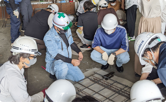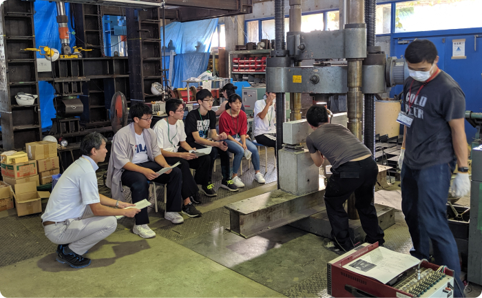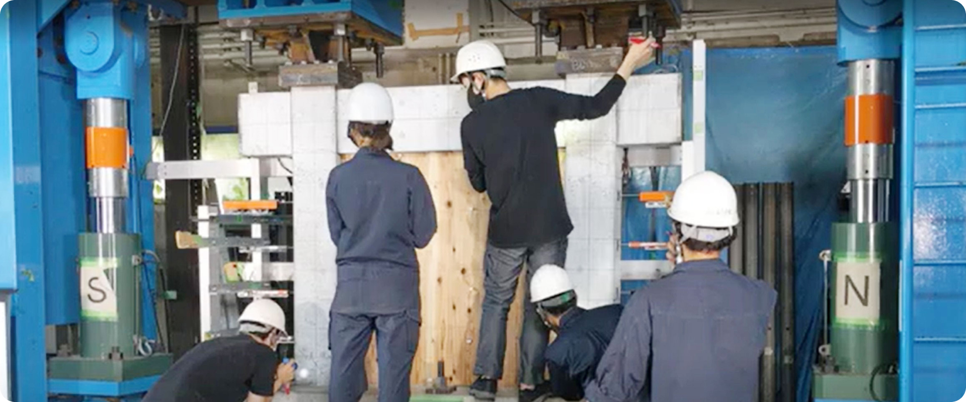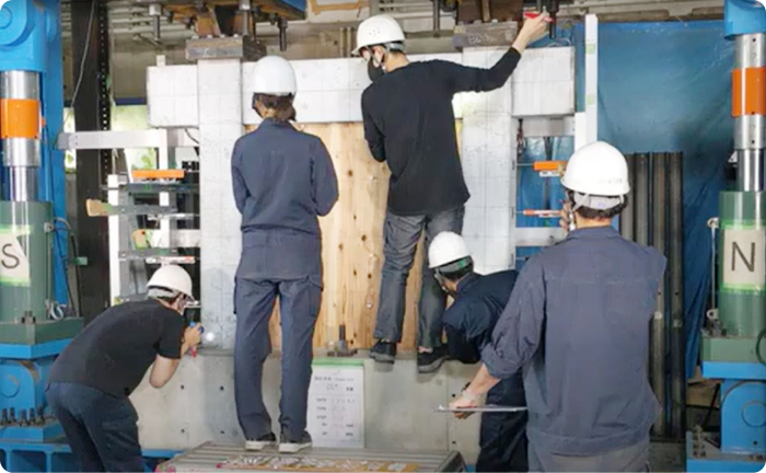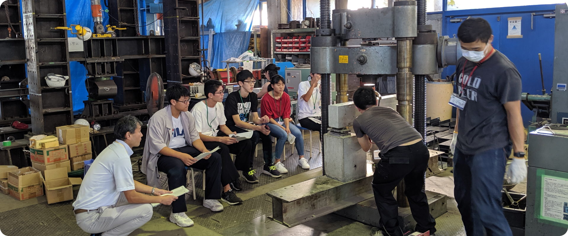 構造実験棟では、鉄筋コンクリート構造・プレストレストコンクリート構造・鋼管コンクリート構造・鋼構造・木質構造など、多くの構造実験が行われます。「建築材料学実験」もここで行われます。