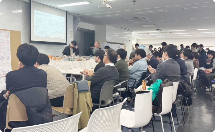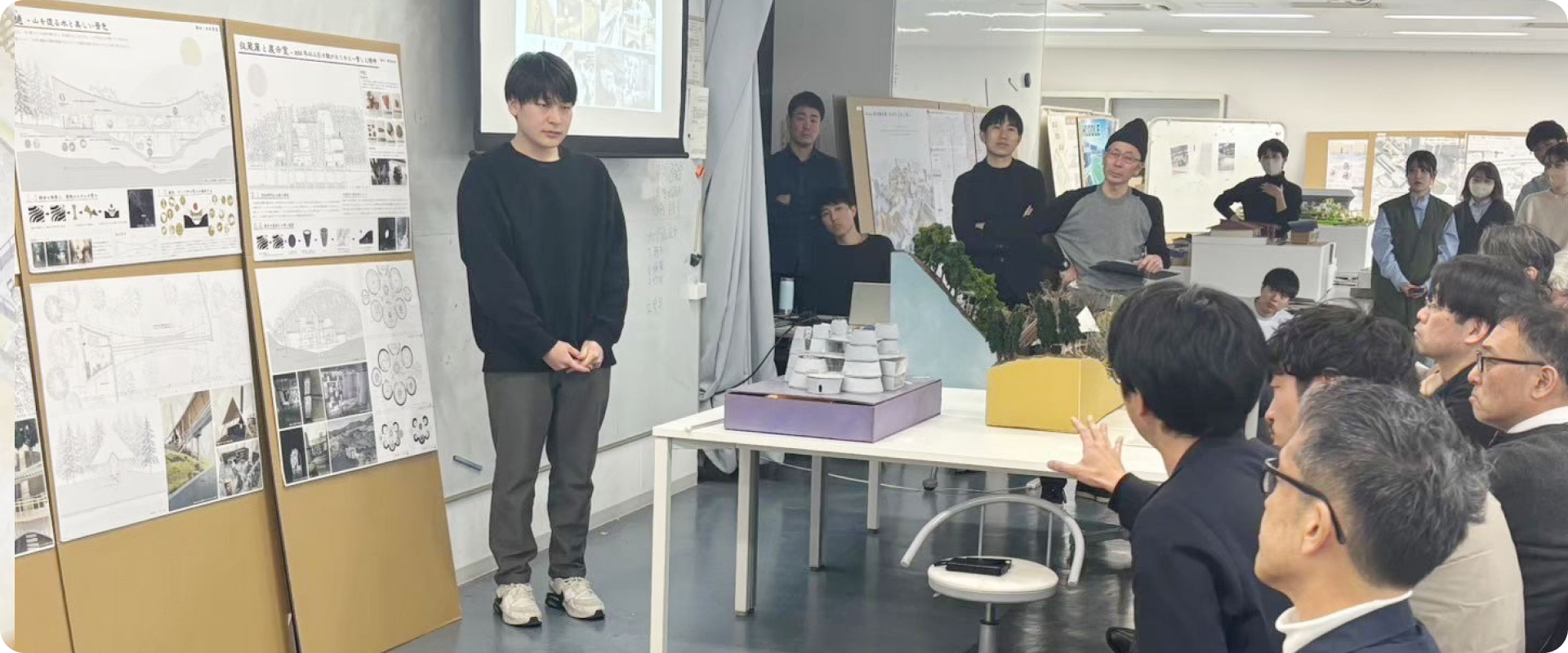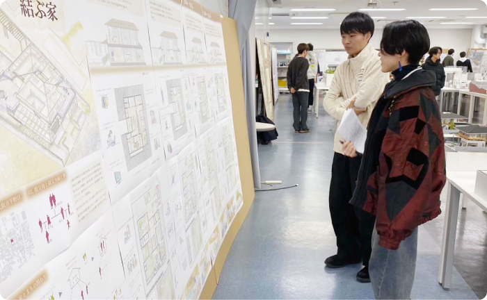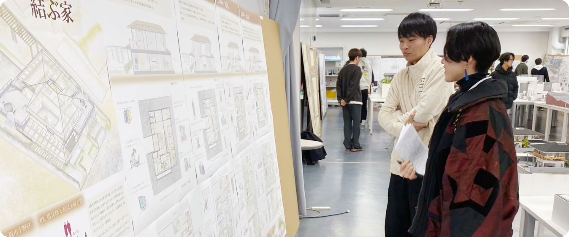 製図室はS1棟9階にあります。製図や模型作成の場であるとともに、製作した建築作品のプレゼンテーションなどもここで行います。また、授業時間以外も学生が集うサロンとしての機能も果たしています。