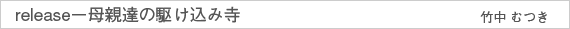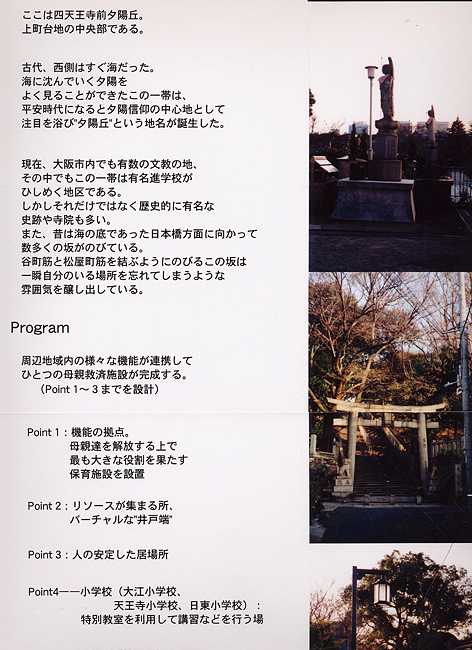 最近ますます声高に叫ばれ、意識されている女性問題。それを受けてか、90年代以降大阪府下でも女性施設の建設が相次いでいる。その多くが施設設置目的として挙げている主なキーワードは女性の文化・教養の向上」「女性の自立」「女性の社会参加・参画」。女性の地位向上を目指す姿勢が背景に窺える。これらのキーワードや、各施設で行われているプログラムを見ていると、意外にその存在を見落とされているのが毎日毎日子供と向き合って狭い世界に閉じこもっている母親達である。 彼女達は子供と1対1(2、3…?)の世界で憂鬱を積もらせているだけではなく、母親同士のシビアな関係や世間が求める「良い母親」像に追いつめられて行き場を失っている。うまく自分を解放できないままにどんどん憂鬱を積もらせていき、一触即発状態の彼女達は、最後の糸が切れると最悪の事態を引き起こしてしまうこともある。そうなる前に…。