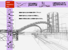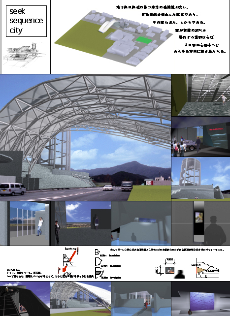 京都の北山通りにおける歩行空間の計画である。地下鉄北山駅を中心に通路空間やさまざま装置を配置しており、シーケンスの変化を楽しみながら街を歩かせたいという意図は図面より伝わってくる。しかし、全体構成が図面から伝わりにくいのが残念であるし、曲面状の大屋根や円柱形の展望施設は、そこからの眺めはともかく、周りからの景観としては疑問がわく。さらに欲を言えば、既存施設の活用方策など、都市空間自体のもつ魅力を生かすような提案もほしかった。とはいえ、地下鉄構造物をも開放する大胆なデザインや、限られた時間の中でCGにチャレンジした精神は評価に値するし、図面を縦横に繋いだプ レゼンテーションには迫力があり作者の構成力が感じられる。