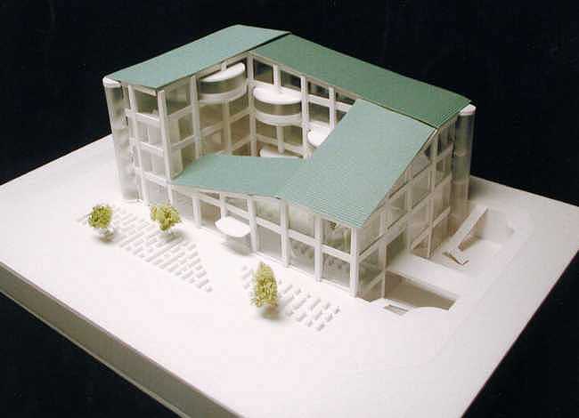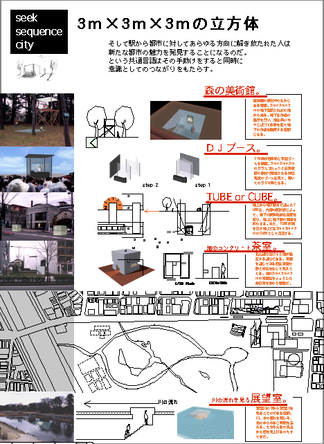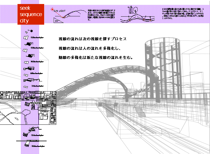 北山。古都京都の歴史からは少し離れた場所。その北山には様々な個性が混在している。植物園・コンサートホール・FM局…。しかしそれらは自己完結し、連続性を生むことはまれである。そこで、地下鉄「北山駅」を中心に視線の連続性をもって都市の魅力を引き出す建築をつくる。くしくも、地下鉄は鉄道の持つ車窓からのながめの連続性を廃すことで、移動機能を追求した結果であり、駅もまたしかりである。今回の計画で駅は視線の流れを多様化する装置にもなる。視線の流れは人の流れを多様化し、動線の多様化は新たな視線の流れを展開する。そして人は都市に対していろいろな方向性を持って解き放たれ る。次に駅を中心に配置された「都市を見る装置」によって人は都市を回遊する。「装置」は 都市を「見る」機能と自身を「見せる」機能によって視覚的連続性と意識的連続性を構築する。これら一連のものでつくられる新しいシークエンスは都市の新しい一面をかいま見せることになるのだ。