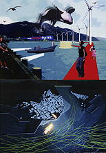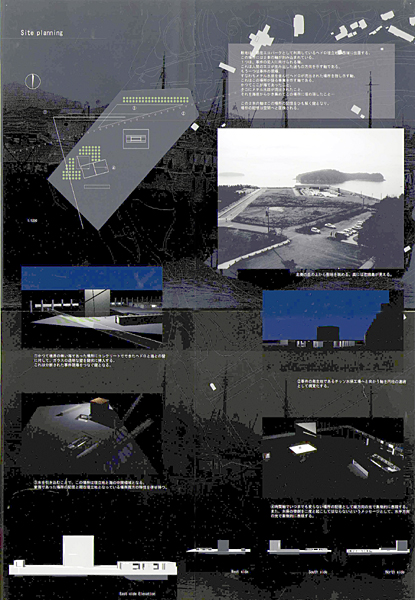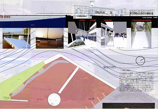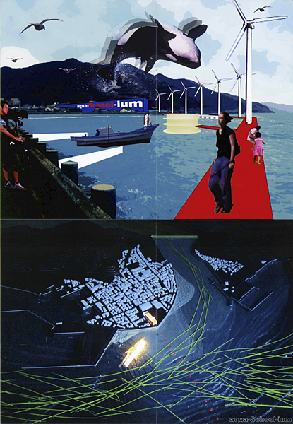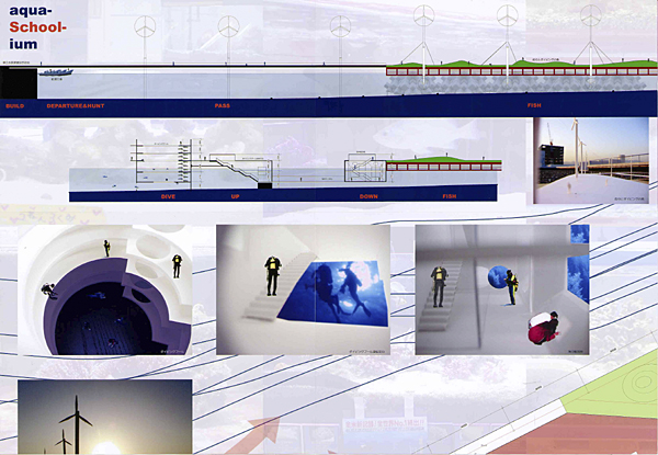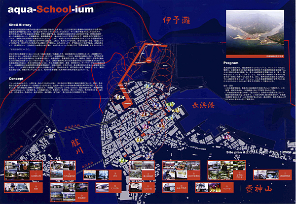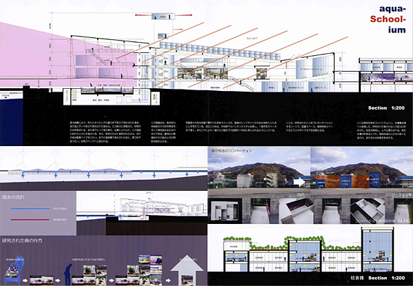 愛媛県長浜町は魚の町です。魚好きの人が多く、敷地である県立長浜高校では、理科の先生を中心に、高校の中に水族館をつくろうという試みがあります。このアイデアをちょこっといただいて、生徒や町の人々が海水魚の研究ができ、さらに海、魚を現実的に体験できる施設として、水族館(aquarium)と学校(School)を組み合わせた、水族館学校(aqua-School-ium)を計画しました。この施設を通して、魚を飼う、魚を見る、魚について知る、魚の研究をする、海を見る、まちを見る、魚を釣る、海中を見る、海に潜る、海で泳ぐ、漁に出るなどの体験ができます。またここで研究された魚がまちなみ水族館を形成し、町全体が水族館となるような町おこし計画です。