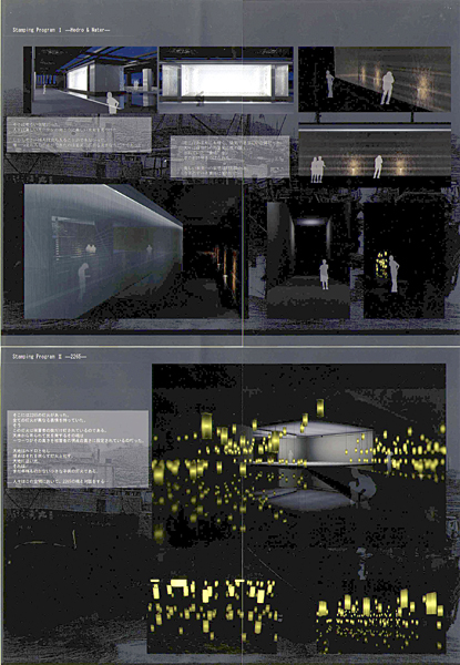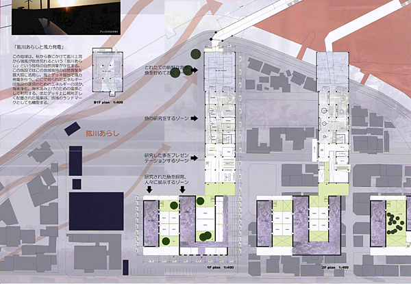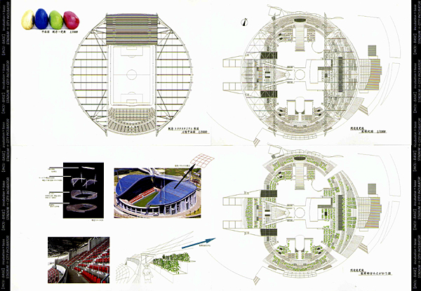 ワールドカップのために建設されながらも使用されず、その後も年数回程度しか試合が行われないという愛知県豊田市のトヨタスタジアムを、ものづくりを中心としたインキュベーション施設および行政施設としてコンバージョンする計画である。綿密な調査に基づき、周辺都市との関係まで含めて冷静に分析、計画した力作である。市中心部から少し距離をおき、矢作川など自然の多く残る地域はインキュベーション施設にとっても適切な地域であろう。しかし、巨大な対象物を解きほぐすには、若干時間不足であった感はまぬがれない。吊り屋根などのダイナミックな構造を持つ既存建築物の内部空間は非常に魅力的な空間になり得るが、空間構成は十分に表現できているとはいえず、やや物足りない。