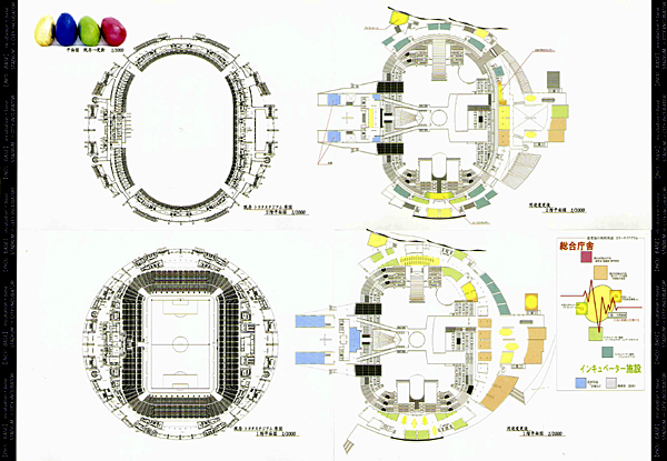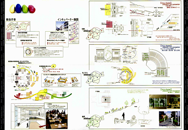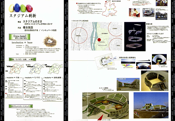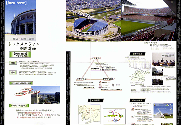 W杯のために造られたものの、スタジアム選考に落選し結局W杯に使われなかったトヨタスタジアムを、ただ単にスクラップアンドビルドするのではなく建物は残したまま機能を転用することによって、現在の使われ方以上に豊田市民に開かれた『豊田らしい』建物へと転生させたいと考え、数年後に行われる市町村合併と合併に対する行政のあり方、合併を契機として掲げた市の政策と豊田市という個性、市民に開かれている施設・閉じている施設、ランドマークとしてのあり方、スタジアムの特性や立地、これらの側面を読み取り『スタジアムを市町村合併後の豊田加茂総合庁舎と、モノづくりを支援するインキュベータ施設とを内包する複合施設に転生させる』計画として、豊田市の将来を孵化させる器械【incu-base】を提案しました。