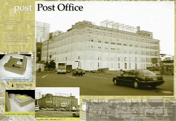 大阪中央郵便局は京阪神都市圏の交通の結節点である大阪・梅田に立地するということだけでも大きなポテンシャルを秘めていると言える。そこで私は、この郵便局を保存しつつ大阪を訪れる観光客のための施設を付加することでこの先の郵便局、post Post Officeを提案する。郵便局には日本中、あるいは世界中からの郵便物が集まってきたが、今度は郵便物だけではなく世界中の観光客が集まる場所にしようとする試みである。