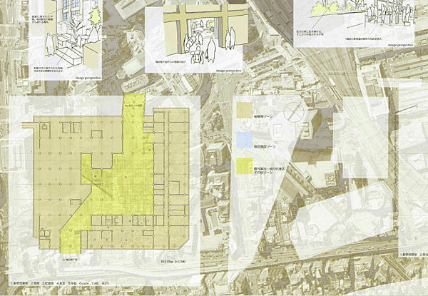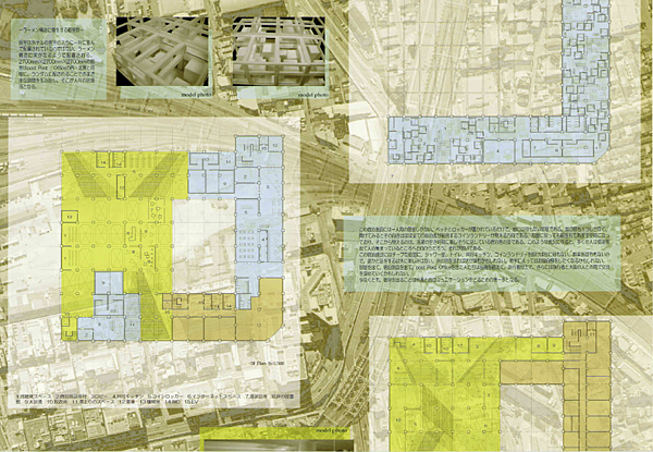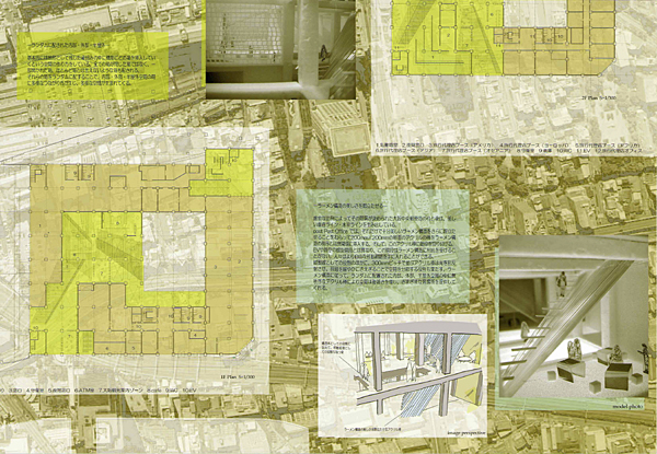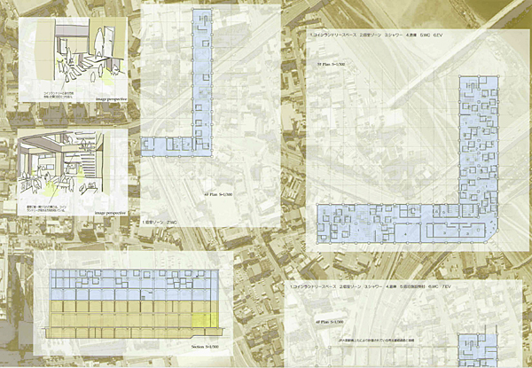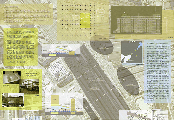 近代建築の名作の一つに数えられる大阪中央郵便局が立地する西梅田周辺は、近年大規模な再開発が行われており、街は大阪駅から西側に拡大している。そうした中で一等地に残る中央郵便局のあり方を問う意欲作である。RCによるフレームと外壁のみを残し、郵便局の機能の他に、旅行者の宿泊施設・旅行代理店等を設け、大阪の玄関口にふさわしい機能を提供する。RCフレームの一部はそのまま露出され、コンバージョンを感じさせない変化に富んだ空間を作り出すことに成功している。ダイナミックな構成の図面表現も秀逸で、確かな表現力を感じさせる。ただ、橋上駅化される大阪駅や、今後再開発される北ヤード跡など周辺との関係のあり方については、さらに深い検討があればよかった。