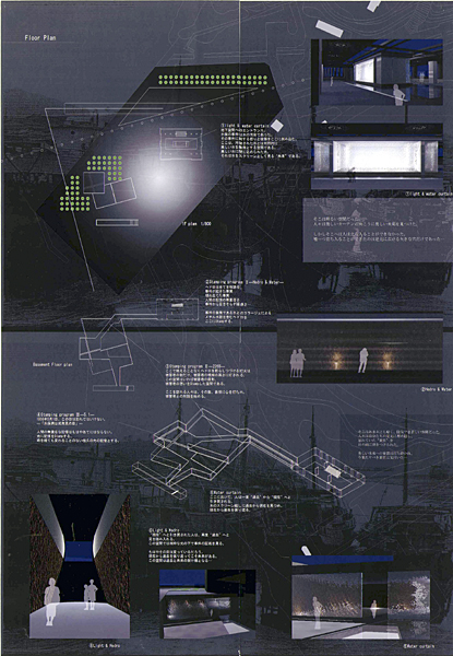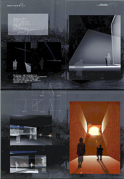 熊本県水俣市において、水俣病の原因となったヘドロの密封された埋立地を敷地として、封じ込められた記憶を再生し、生きた記憶として、場所や人々の心に「刻み込もうとする」提案である。光の立体的な貫入、風景の重なりや取り込み、忌々しい加害工場の軸線との関係性、被害者の年齢を高さに反映させた灯火の見え方など、多様な視覚体験のデザインが最大限に工夫されており、卒業論文における生態幾何学研究で蓄積されたセンスが生かされていることがわかる。以上の通り、テーマの着想と優れたデザインが評価され、標記コンクールへの応募作品として推薦することとした。視覚的に印象づけられた様々な場所を結ぶ動線上のデザインにも配慮があれば、より一層充実した作品となったと思われる。
