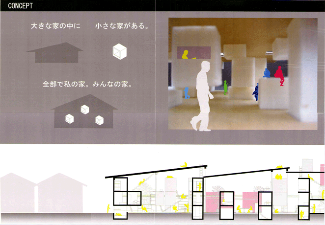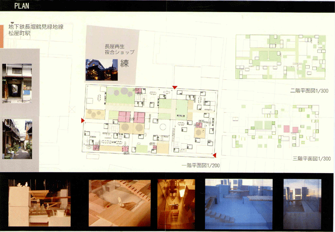 戦前長屋や細街路の多く残る大阪市中央区空堀地区における集合住宅の提案であり、近年、当地区で開発の進むマンションに対する批判と本来あるべき代替案としての意味が込められている。共用部が建物の基調を成し、専用部分の住戸は、個室程度の必要最小限の面積で共用部分に分散配置されている。個室は入居者の個性が発揮される場であり、住戸群の間に拡がる共用部分に表出されるよう巧みな設計がされている。旧来の路地で展開された社会性が共用部分に引き継がれるよう、路地の環境特性を現代社会に対応して読み替えた点が意欲的で評価できる。通風採光の問題の他、屋根のデザインが未消化である点が惜しまれる。