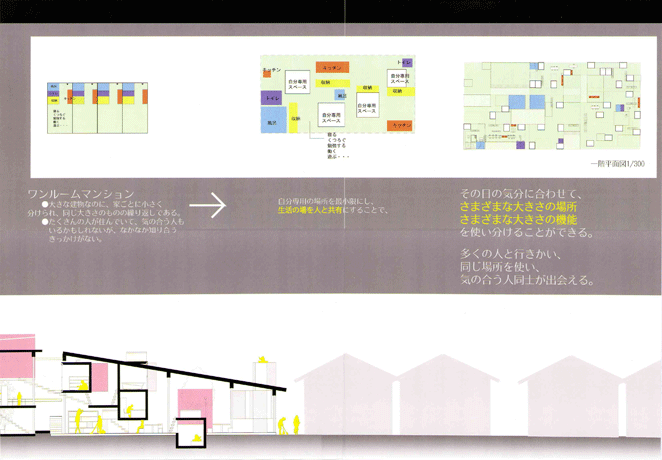 現在のワンルームマンションは、住人が隣近所について無関心であったり、できる行為が限られているなどの問題点がある。これはワンルームマンションの構成に因っている部分が大きい。そこで、もっと楽しい一人暮らしの形はないかと考えた。