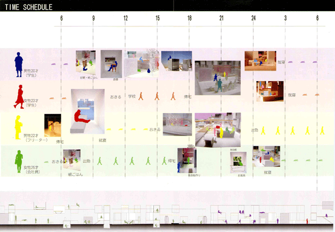 そのような空堀を敷地とし、一人暮らしの人が住む集合住宅で、自分専用の場は最小限にし生活を共有する場として様々な大きさの場所や機能を持つ空間を提案した。そこでは共有の場にも人それぞれの趣味や生活スタイルがにじみ出し、気の合う仲間を見つけたり、お気に入りの場所を見つけて様々な行為を行うことができる。