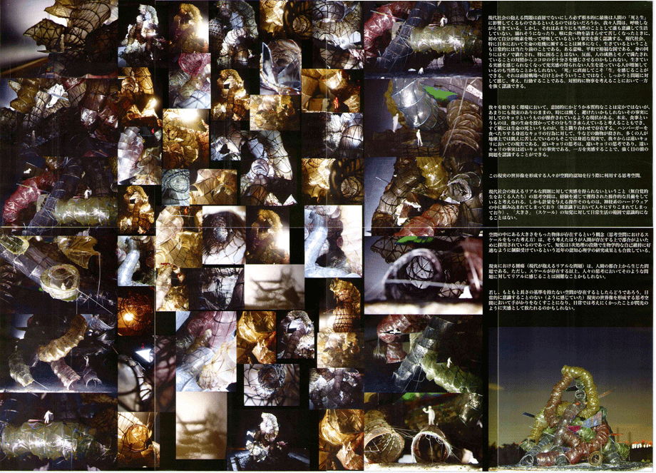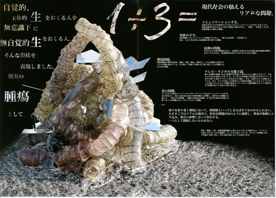 川島君によれば、現代社会が抱える問題、人が世の中に対して抱く違和感や危うさは、死と生に強く結びついているという。そのような抽象的な思考を、不気味によじれ、怪しい色を発するチューブとそれに突き刺さる傾いたスラブで表現した迫力ある造形は、それを見る人に自己の存在理由を深く問いかけてくるかのようである。深遠なる思考の表現か、模型と三次元CGを駆使した単なる造形ゲームにすぎないのか、その答えは受け取る側の姿勢に依存すると思った時点で、我々はすでに作者の術中にはまっているのかもしれない。