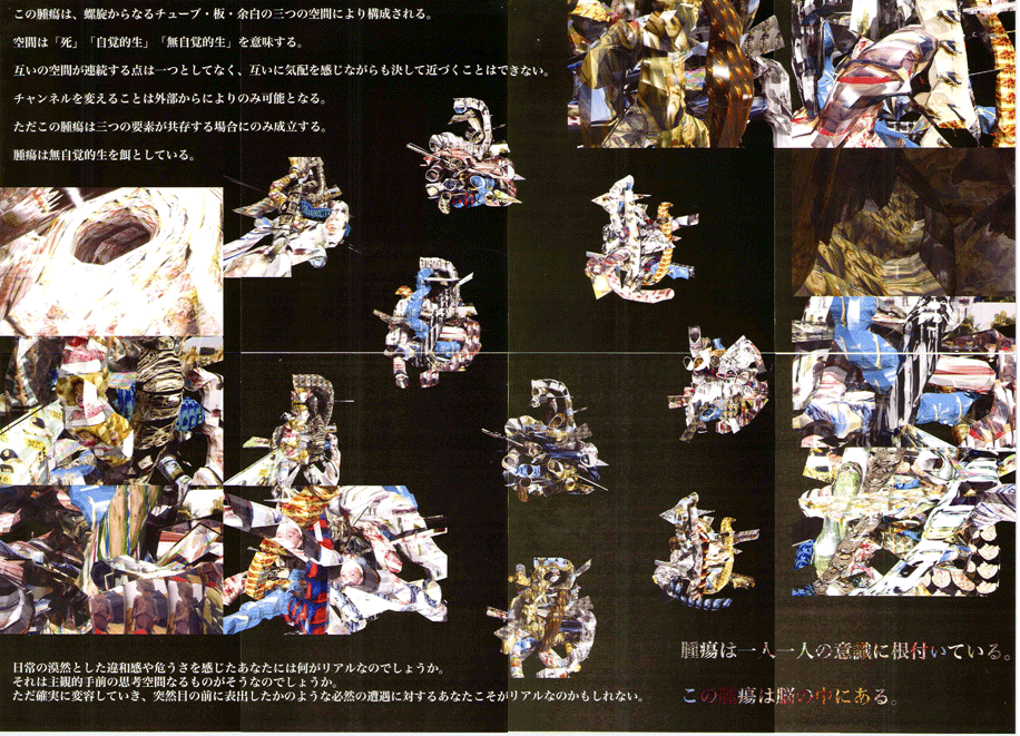 我々の周りには無関係と思えばそうなのかもしれない、ただそこではリアルな現実として切実な問題が積層し、複雑な要素が相互に影響し合って存在している。一つとして関係しないものはなく、あらゆる問題は人の「死と生」に繋がるものである。このような現実を捉え、それぞれの世界像を形成するために人々が空間的認知を行う際に利用する思考空間があり、文化や経験等により無意識下に刷り込まれた感覚が含まれている。思考空間の中に絶対的なスケールはなく、「死と生」はそれとは不可分な関係の中に存在する。これは螺旋からなるチューブ「死」、スラブ「自覚的生」、余白「無自覚的生」の三つの空間により構成され、互いに連続する点は一つとしてなく、気配を感じながらも決して近づくことはできない。チャンネルを変えることは外部からのみ可能となるが、三つの要素が共存する場合にのみこれは成立する。一人一人がそのような問題と真に対峙したとき、その現象は定義される