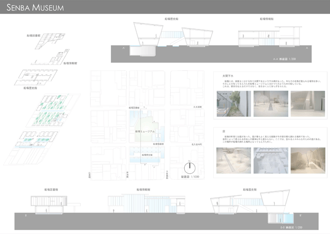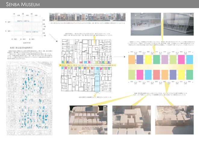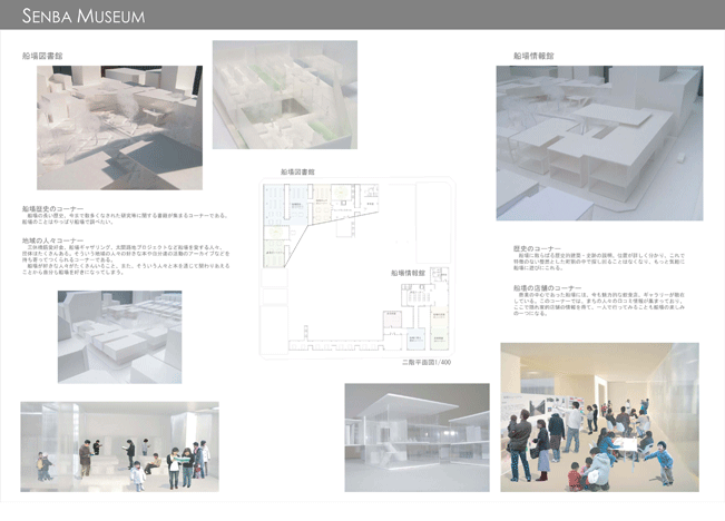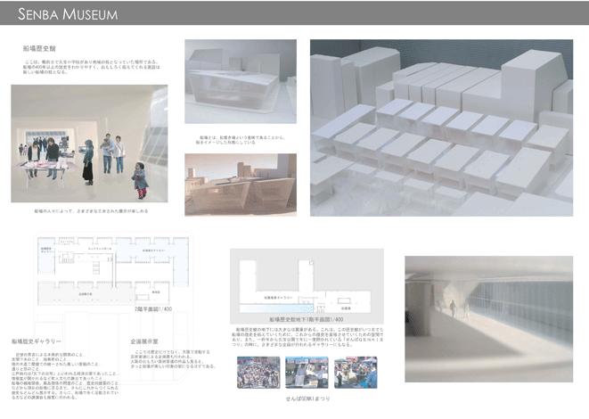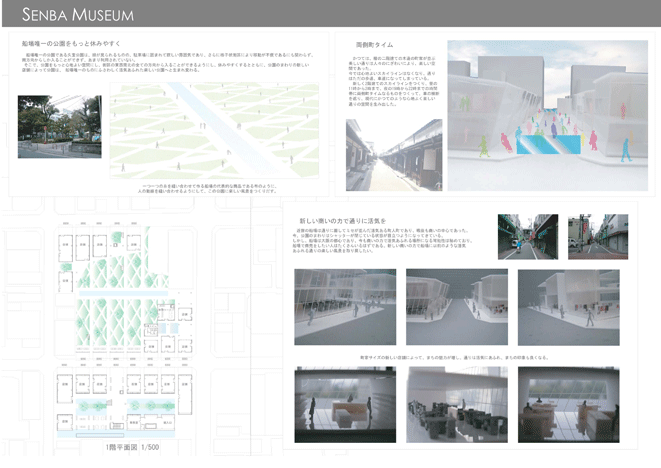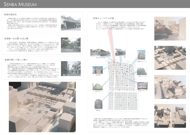 船場は秀吉によって本格的に開発された400年以上の歴史を持つ大阪の都心である。今も町割等の歴史性を維持しており、歴史的建築も豊富である。また、戦後は商売の中心であった船場には今でも魅力的な商いがたくさんある。そして、船場を愛し、活性化させようと活動している人々がたくさんいる。船場は本当に魅力的なまちなのである。だが、このまちの魅力は広く知られていない。そこで、船場地区唯一の公園に歴史館、情報館、図書館をつくり、このまちの魅力を活かし、伝える「船場ミュージアム」を計画した。この施設で船場の魅力を知り、歴史的建築や店舗等に訪れる人が増えれば、船場全体が「船場ミュージアム」となっていくはずである。