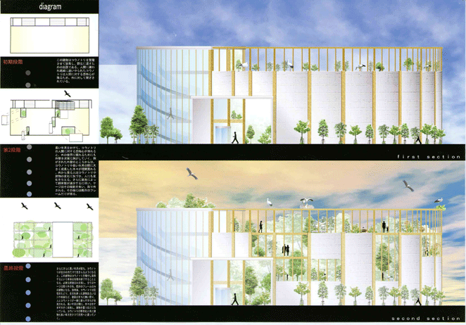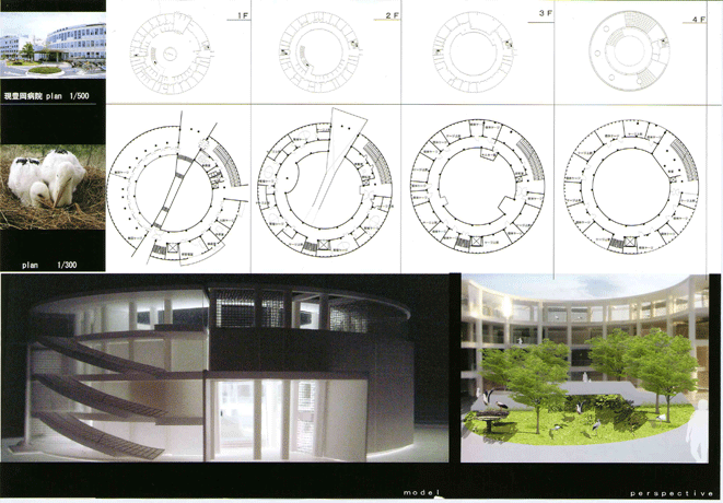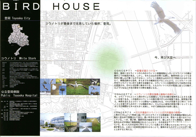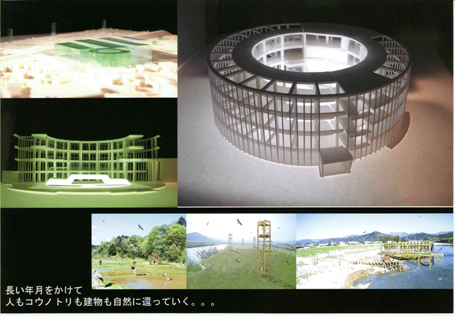 作者の故郷・豊岡で特別天然記念物として繁殖が行われているコウノトリの野生復帰を支援する施設として、病院としての役目を終えた旧公立豊岡病院を保存・再生するというテーマには、失われつつあるものに優しく手をさしのべるという通奏低音が明らかに流れている。一見、楽観的すぎではないかと思わせるプログラムに惹きつけられるのは、設計者本人の故郷に対する深い思いと、「正統的アプローチ」に対する一種の安心感のゆえであろうか。細部を詰めて、さらにリアリティを追求することを期待したい案である。