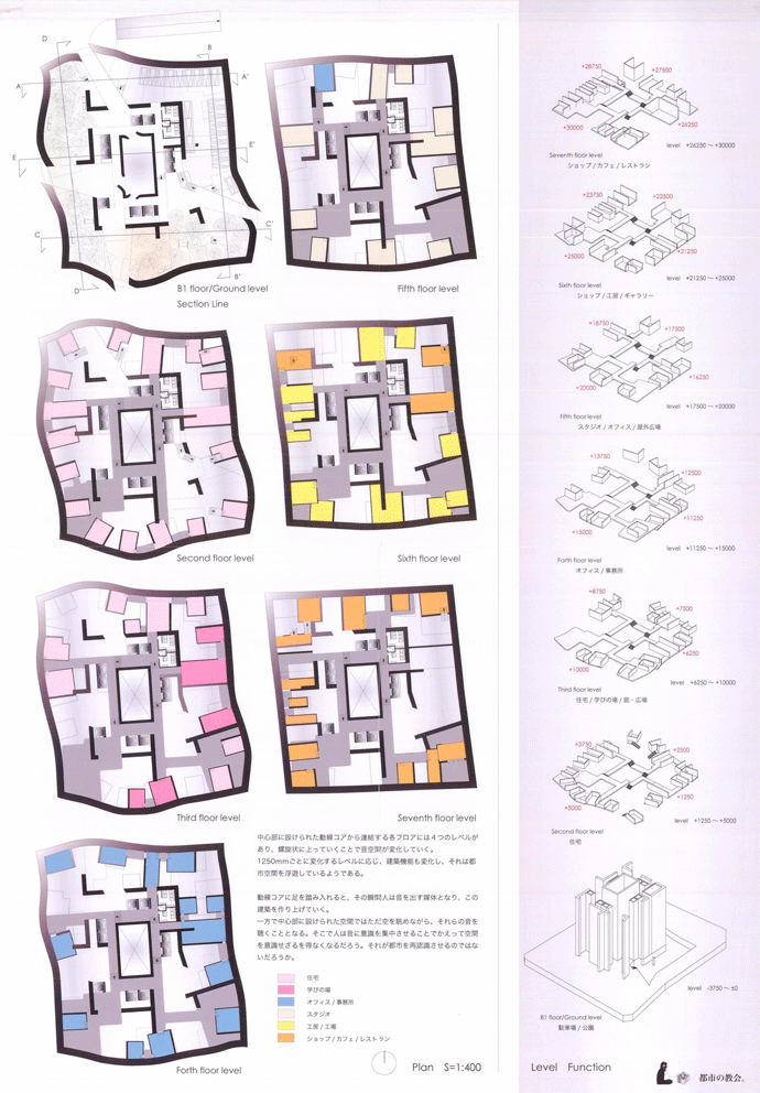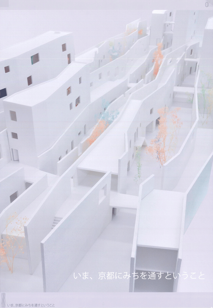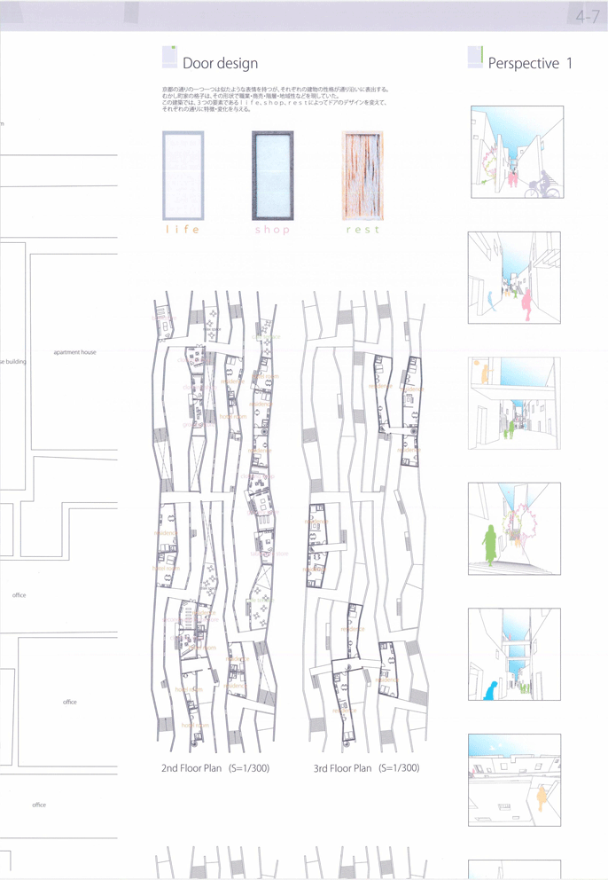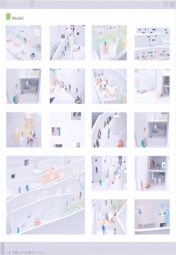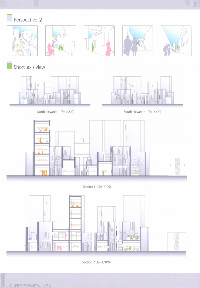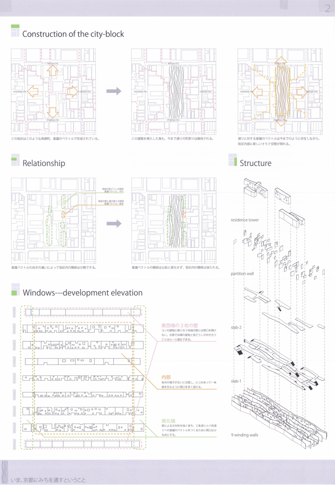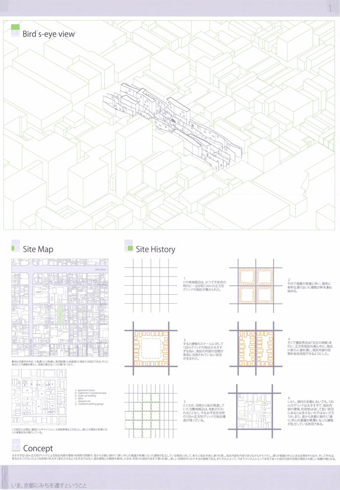 秀吉による天正の地割りにならい、京都市中心部の一街区に南北に貫く「みち」を通す計画である。ただし「みち」は単なる道ではなく、住居、ホテル、店舗、ギャラリー、公園など、様々な用途の複合体である。建物の外壁間に作られた路地のような空間は、日本の伝統的な路地空間とは異なるが、各機能の配置や空間の開き方/閉じ方といった工夫により、大変居心地の良い場所となりそうである。作者の建築や都市空間に対する感覚、造形能力の高さが感じられる。また図面中で丁寧にコンセプトの説明をしており、設計意図が図面から十分読み取れる点も評価に値する。こうした評価により、本作品は卒業設計最優秀賞を受賞した。ただし、敷地周辺のコンテクストの読み込みは十分であるとは言えず、背景を天正の地割のみに頼るところはやや心許ない。この地域は京町家、明治期の煉瓦造建築から現代的な建築まで、重層的な歴史が表出するエリアである。当然この計画が地域に対して、あるいは地域がこの計画に対して与える影響に対する考察が求められるはずである。しかし立面図や平面図には敷地内の様子しか表現されておらず、周辺との関係がほとんど読み取れないことは大変残念である。