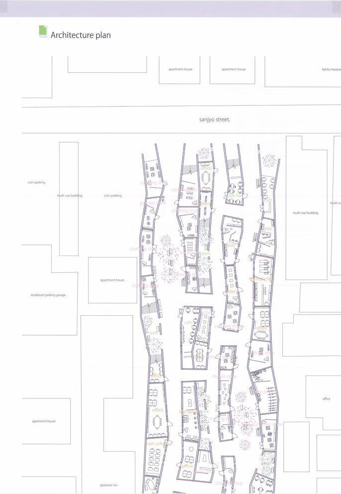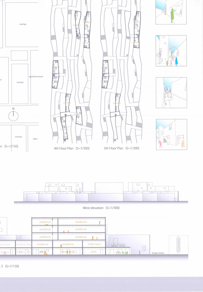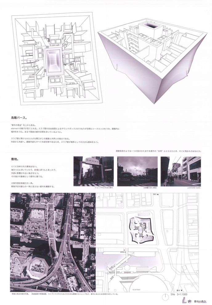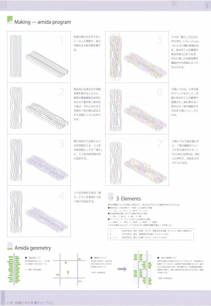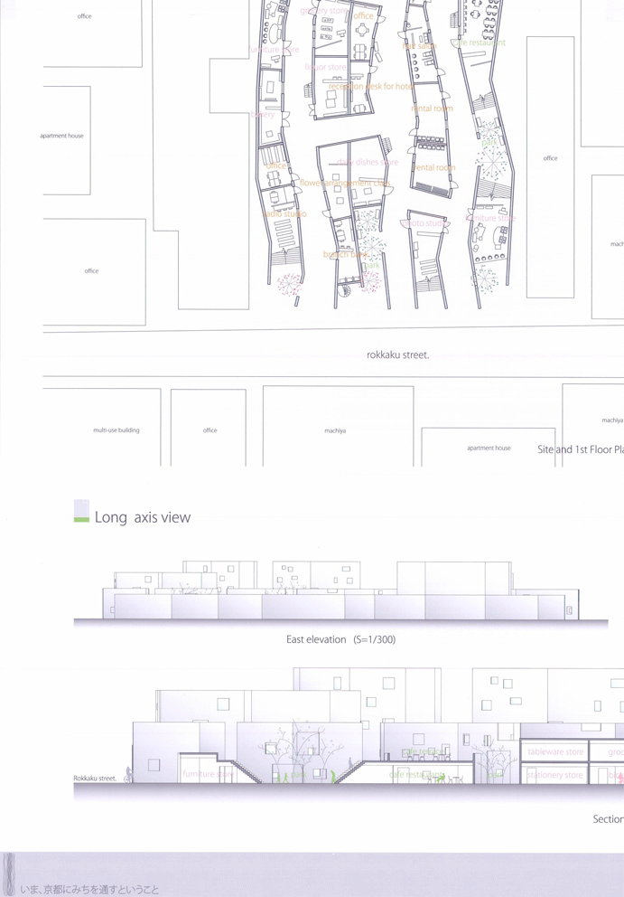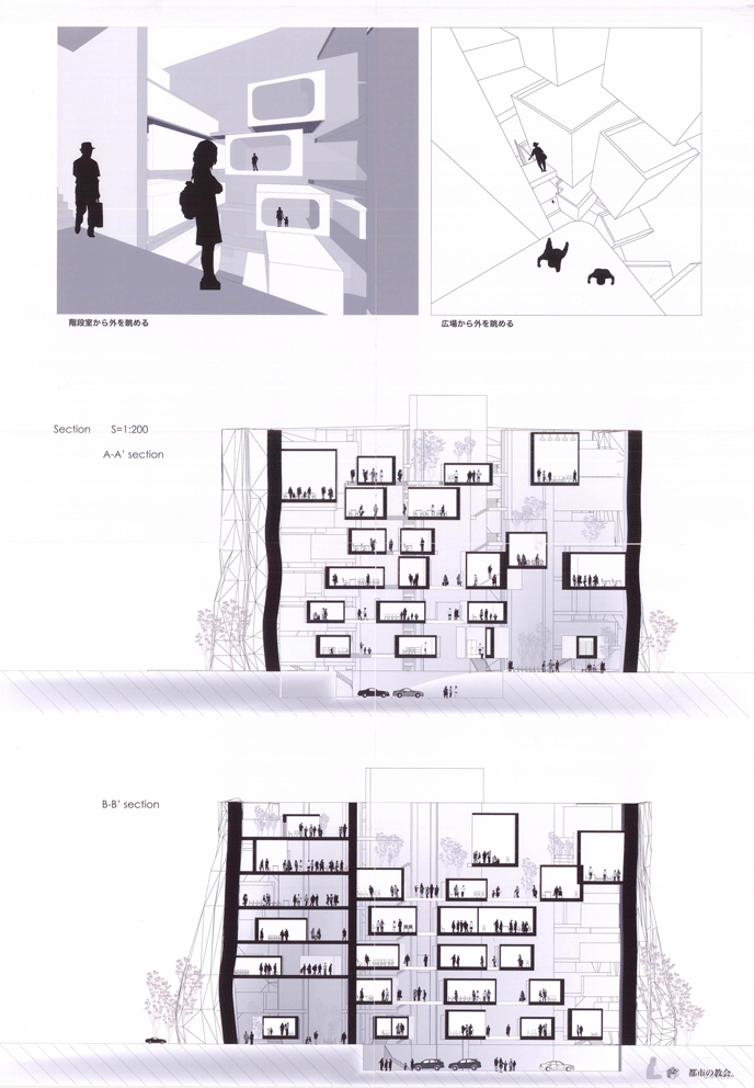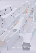 秀吉による天正の地割りにならい、京都市中心部の一街区に南北に貫く「みち」を通す計画である。ただし「みち」は単なる道ではなく、住居、ホテル、店舗、ギャラリー、公園など、様々な用途の複合体である。建物の外壁間に作られた路地のような空間は、日本の伝統的な路地空間とは異なるが、各機能の配置や空間の開き方/閉じ方といった工夫により、大変居心地の良い場所となりそうである。作者の建築や都市空間に対する感覚、造形能力の高さが感じられる。また図面中で丁寧にコンセプトの説明をしており、設計意図が図面から十分読み取れる点も評価に値する。こうした評価により、本作品は卒業設計最優秀賞を受賞した。ただし、敷地周辺のコンテクストの読み込みは十分であるとは言えず、背景を天正の地割のみに頼るところはやや心許ない。この地域は京町家、明治期の煉瓦造建築から現代的な建築まで、重層的な歴史が表出するエリアである。当然この計画が地域に対して、あるいは地域がこの計画に対して与える影響に対する考察が求められるはずである。しかし立面図や平面図には敷地内の様子しか表現されておらず、周辺との関係がほとんど読み取れないことは大変残念である。
