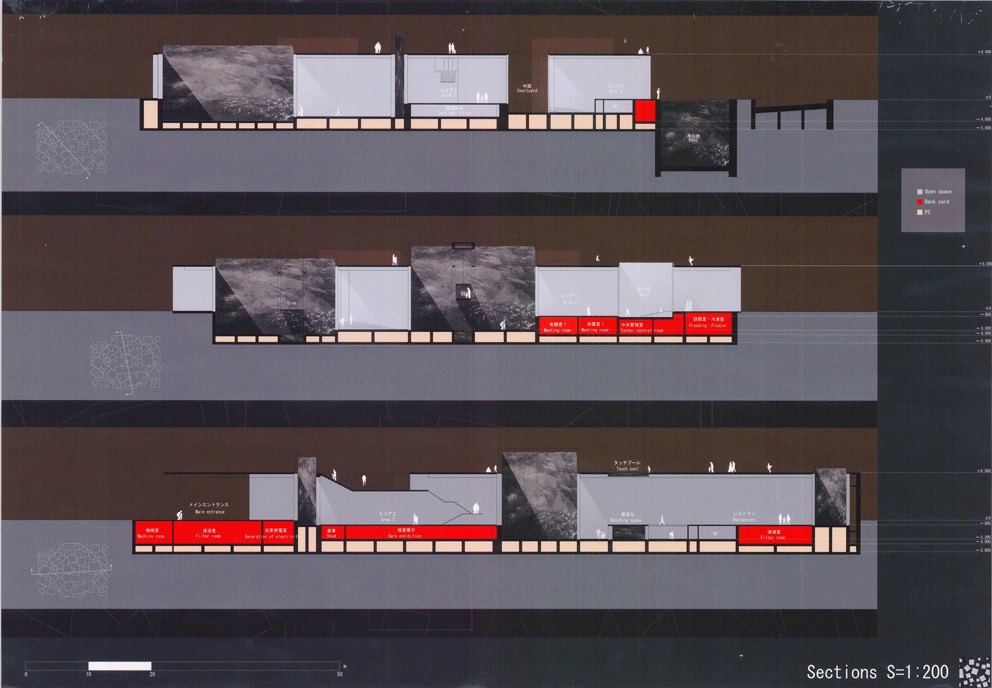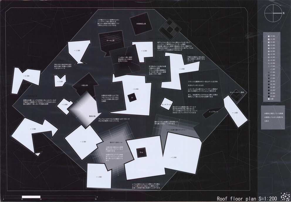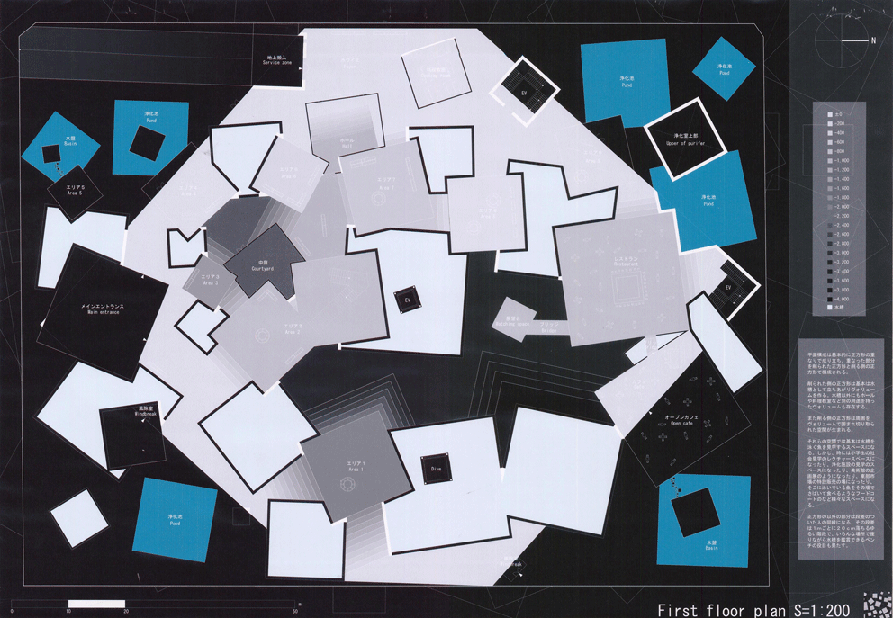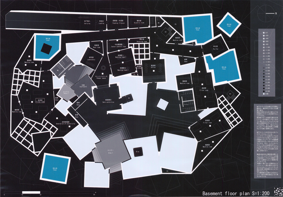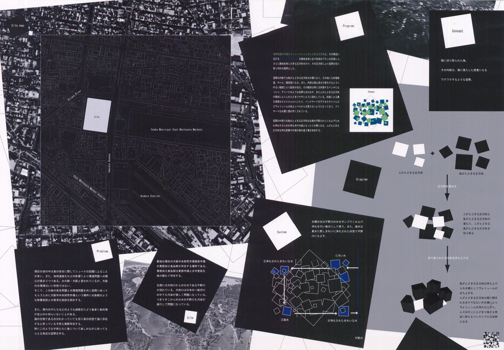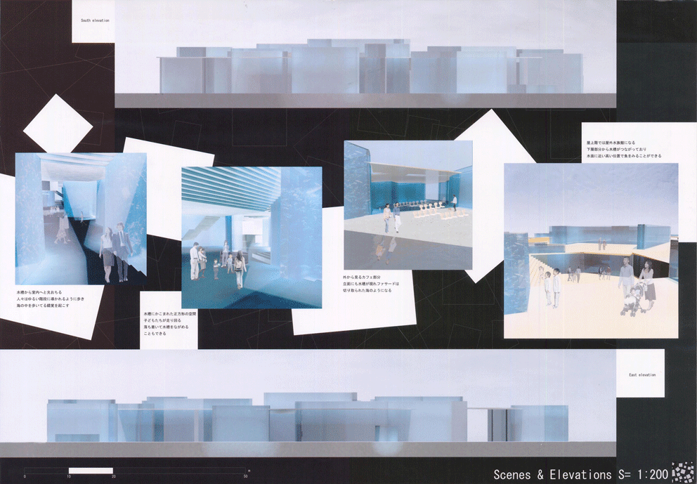 この計画は大阪市東部中央卸売市場の加工食品部棟の敷地に建てられた巨大な「いけす」である。これは東部市場で扱う鮮魚を保管する役割と同時に、市民に開かれた観賞用の水族館でもある。日頃から食用として流通している海産物が実際にどのようなところから運ばれて来るのか、それらは海の中でどのようにして生きているのかなどを理解し、その命を食することの意味を考えさせる学びの場を提案している。建築構成としては世界地図を抽象化した正方形平面が互いに重なることによって切り取られる多角形と切り取る正方形が図と地の関係を逆転させながら水槽や教室や通路として立体的に構成されており、緻密なプランニングの中に浮かび上がる水槽の造形は見事で、水中に引き込まれるような青い空間は秀逸である。ただコンセプトで述べている隣接する卸売市場とこの施設との物理的関係はいささか不明瞭であり、隣接する平野川の浄化についてもやや不自然さが残る点が惜しまれる。建築家には優れた造形力とともに卓越した見識が求められる。今後の研鑽を期待したい。