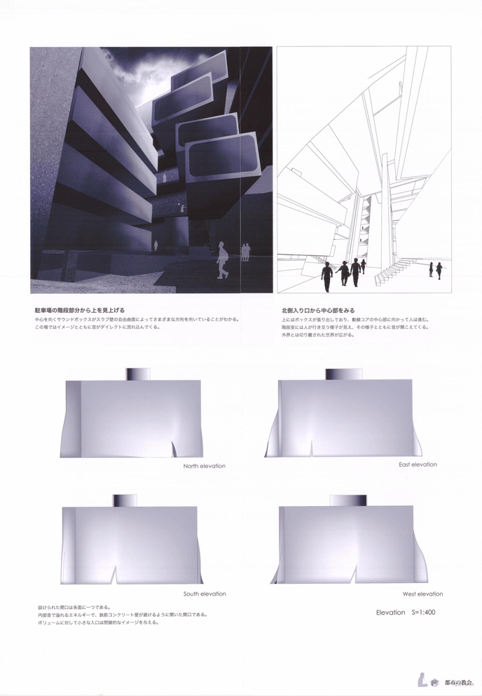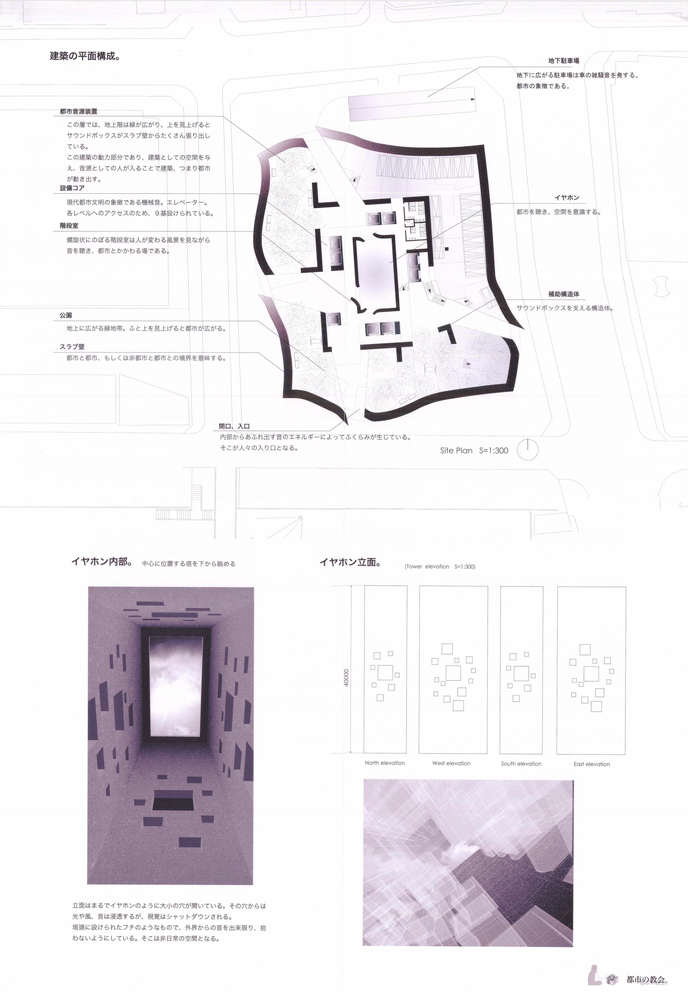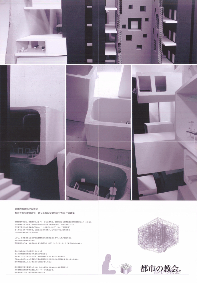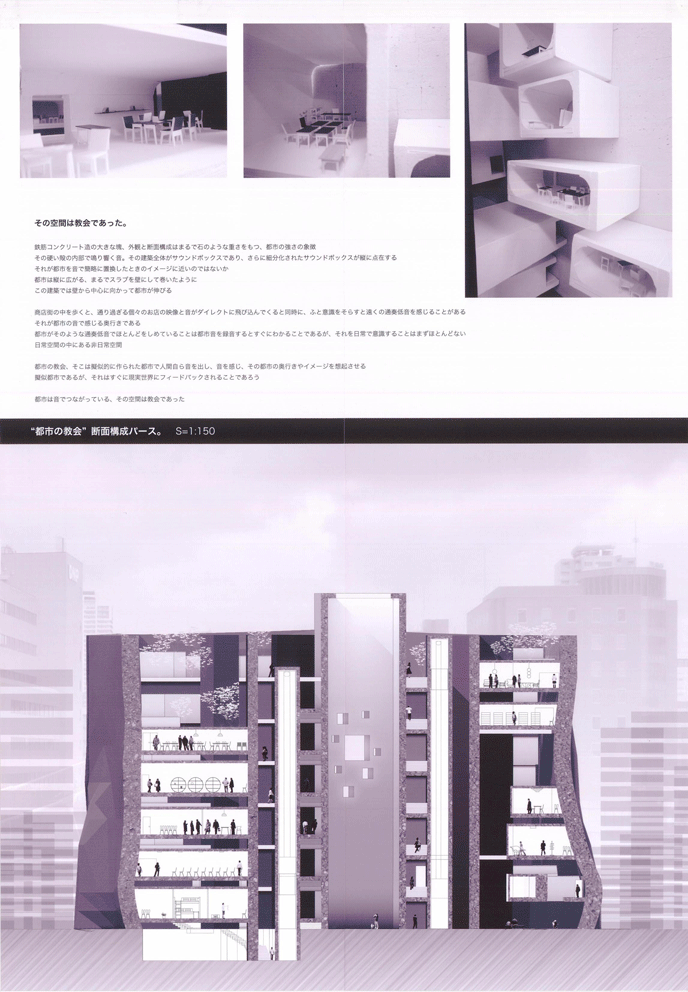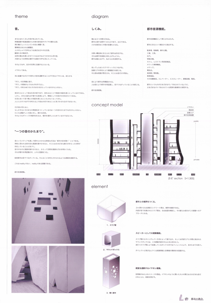 都市の音の「奥行き」を再現する装置とは何か。作者は丁寧に音源としての空間単位をつむぎ上げながら、そして、音の伝播・共鳴・拡散の媒体としてのチューブやボイドを編集しながら、ひとつの有機的な構造体に仕立て上げていく。結局、音の理想から出来上がった構造体とは何と都市的なのであろうか。一方、ipodにより都市の音から耳を背ける若者達の現実。それは恐らく、構造が無機的であり、本来の「奥行き」を発揮できていない都市の側に責任があるのかもしれない。音の世界とは、視覚世界と同様に空間構成原理の根源を担っているのだ。作品を見る者にとって、人と都市の関係についての様々な思索を誘発させる深みのある作品に仕上がっている。