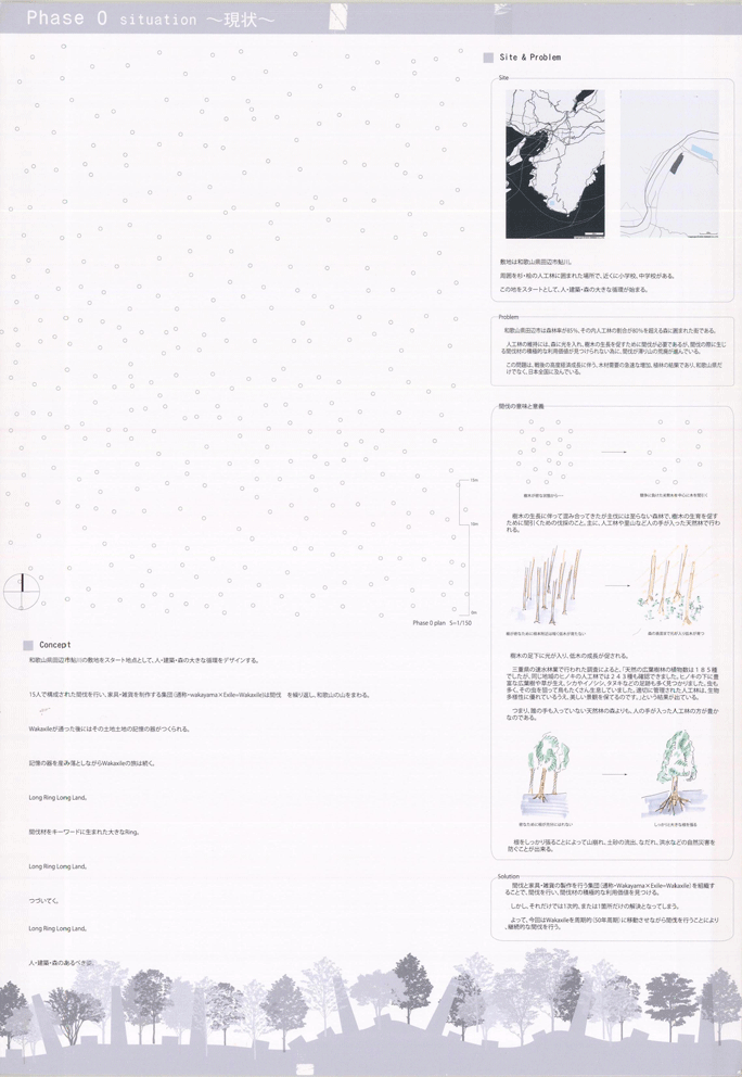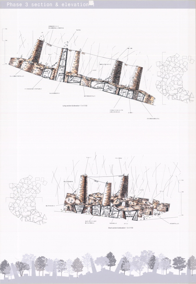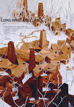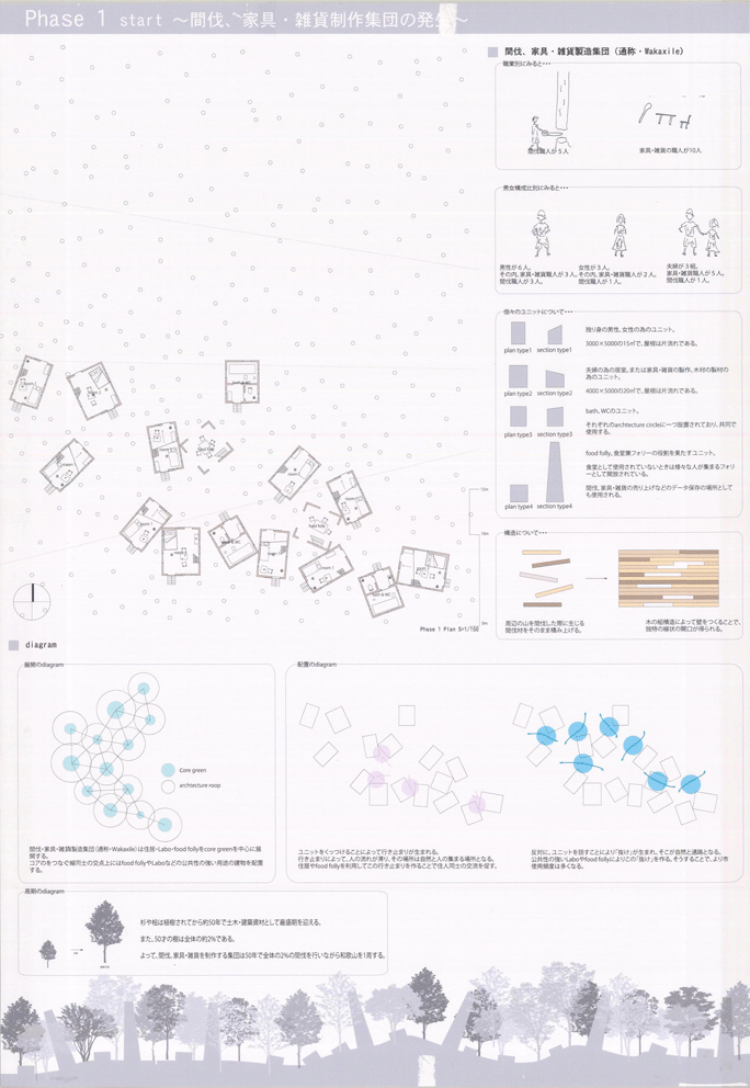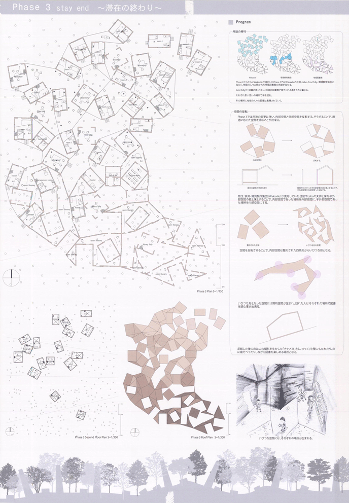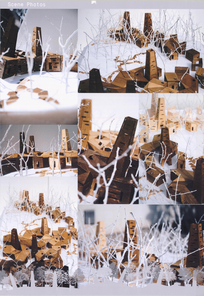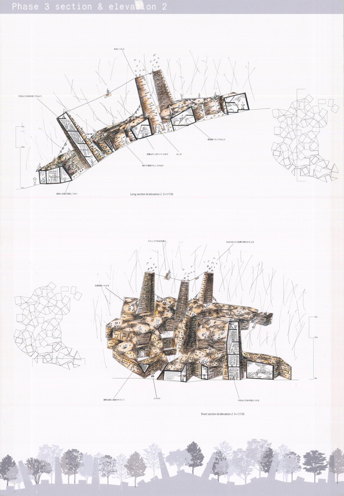この案は日本の山林で問題になっている「間伐材」をテーマに扱っている。ここでは10人の職人集団が間伐と家具製作を繰り返しながら、和歌山の鮎川を基点に紀伊山地を移動していくことで、山の生態系を維持していく仕組みを提案している。この作品の冥利は時間の流れの中で、職人たちが仮眠する山小屋が工房や林間学校、子供の隠れ家へと次第に形を変え、使われ方が変化して最終的には朽ちて自然に戻るまでのプロセスを建築という視点でデザインしていることにある。一見アドホックな山小屋の形態がその痕跡を残しながら蛇行して連なる風景は圧巻であり、白い林の中に浮かび上がる一群の錆色の形態はきわめて美しい。そして時間とともに変化するその全体が一つの歴史として認識された時、作者がこの作品に秘めた未来へのあたたかい思いが感じられる。ただこの山林において木材で積層された小屋や斜面に垂直に立つ建物に込めた操作の意図が若干不明瞭であり説得力のある説明が必要であろう。今後の研鑽を期待したい。