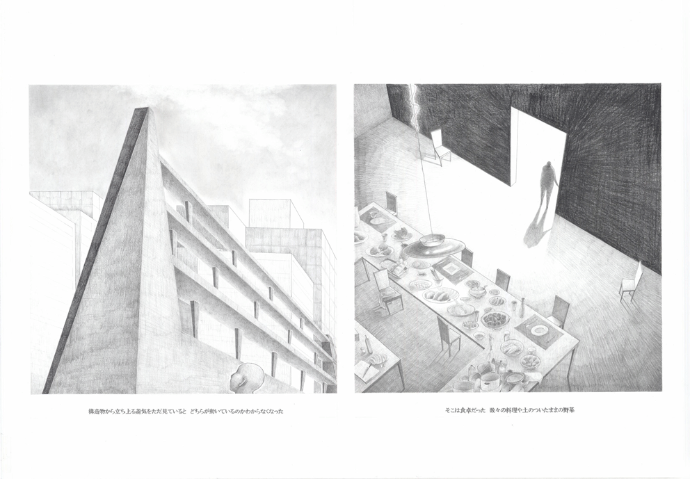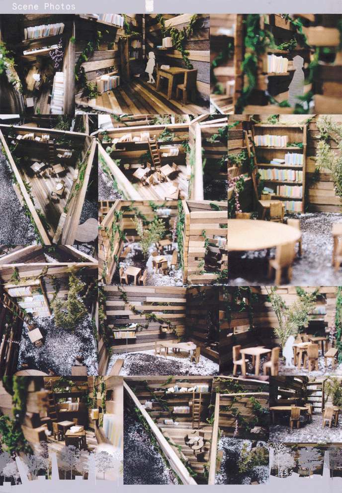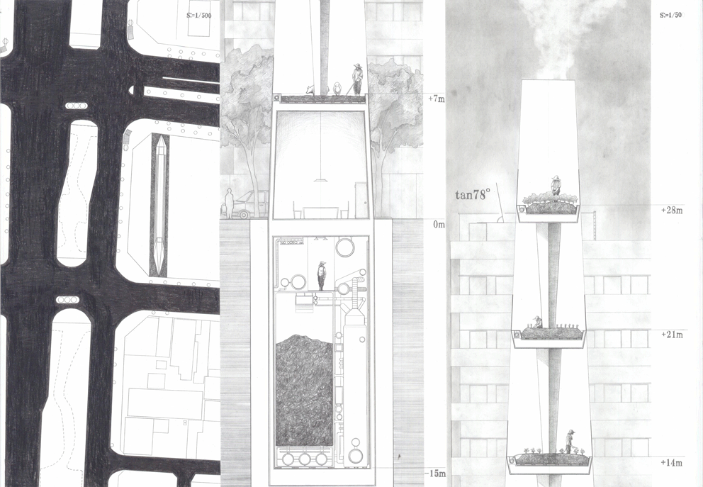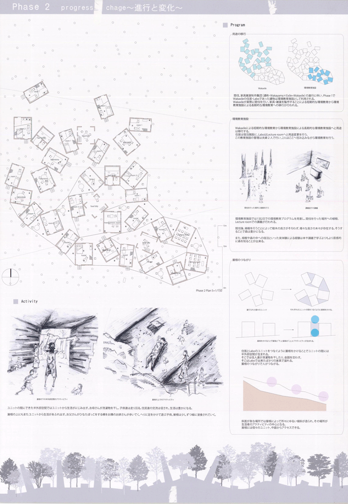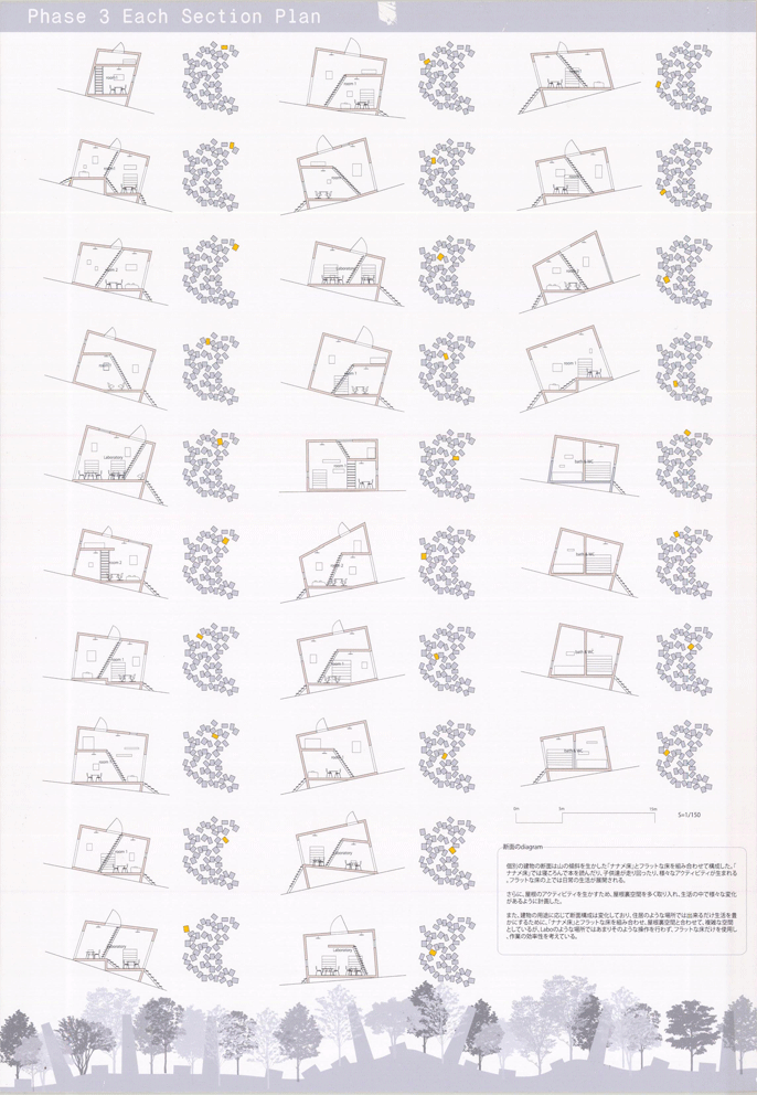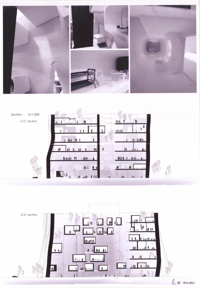 この案は日本の山林で問題になっている「間伐材」をテーマに扱っている。ここでは10人の職人集団が間伐と家具製作を繰り返しながら、和歌山の鮎川を基点に紀伊山地を移動していくことで、山の生態系を維持していく仕組みを提案している。この作品の冥利は時間の流れの中で、職人たちが仮眠する山小屋が工房や林間学校、子供の隠れ家へと次第に形を変え、使われ方が変化して最終的には朽ちて自然に戻るまでのプロセスを建築という視点でデザインしていることにある。一見アドホックな山小屋の形態がその痕跡を残しながら蛇行して連なる風景は圧巻であり、白い林の中に浮かび上がる一群の錆色の形態はきわめて美しい。そして時間とともに変化するその全体が一つの歴史として認識された時、作者がこの作品に秘めた未来へのあたたかい思いが感じられる。ただこの山林において木材で積層された小屋や斜面に垂直に立つ建物に込めた操作の意図が若干不明瞭であり説得力のある説明が必要であろう。今後の研鑽を期待したい。