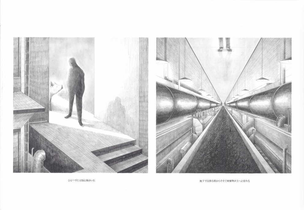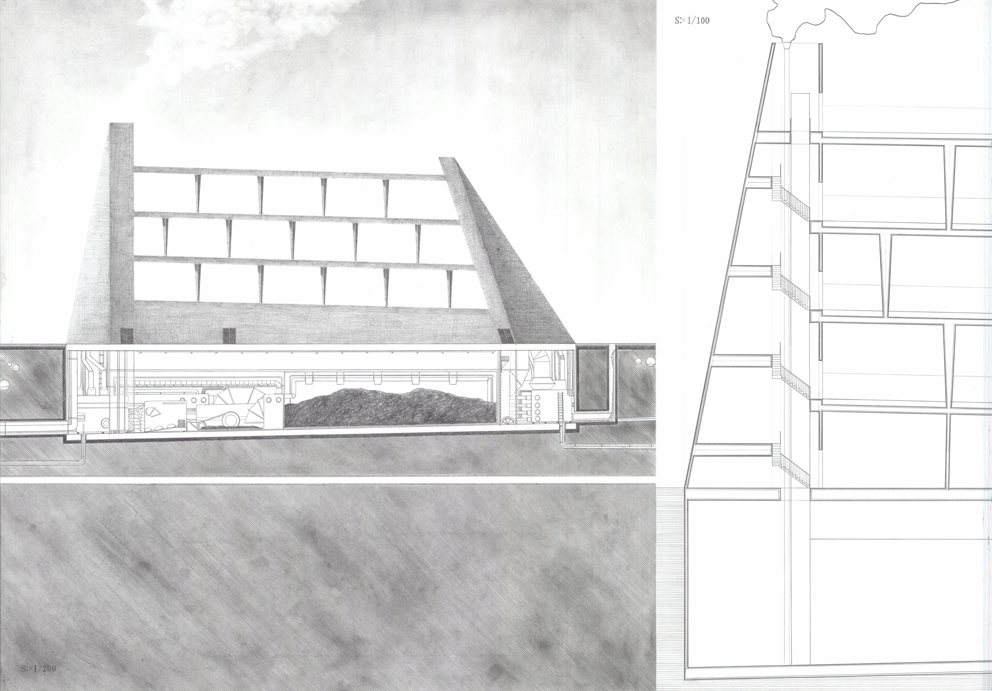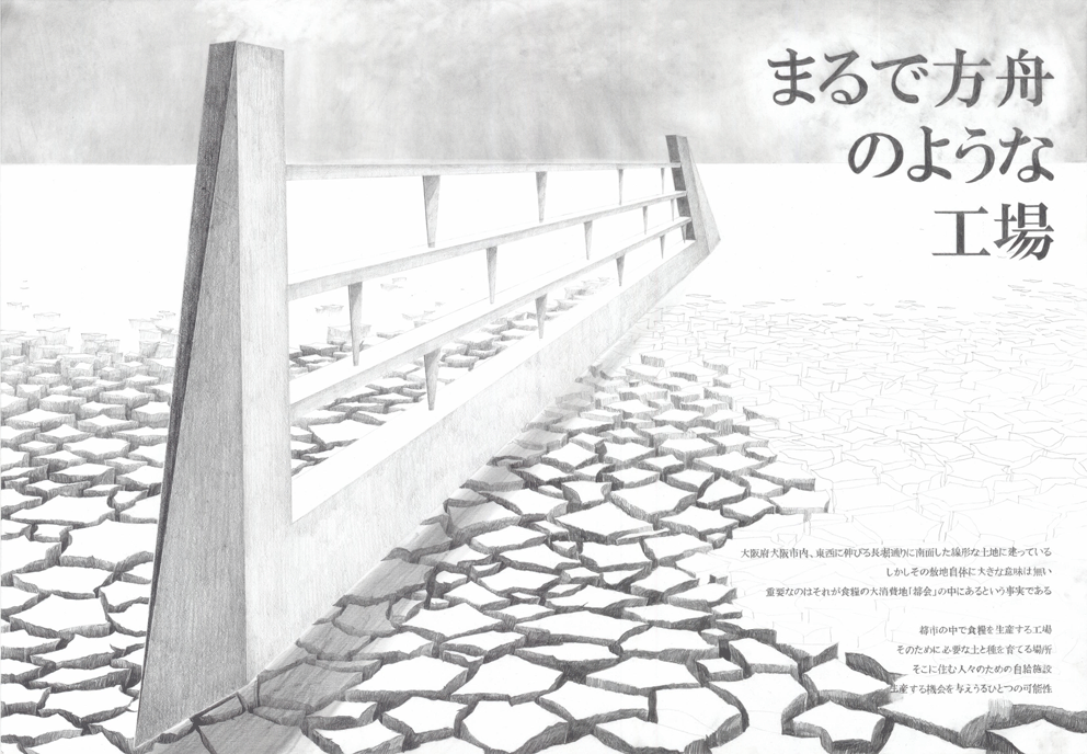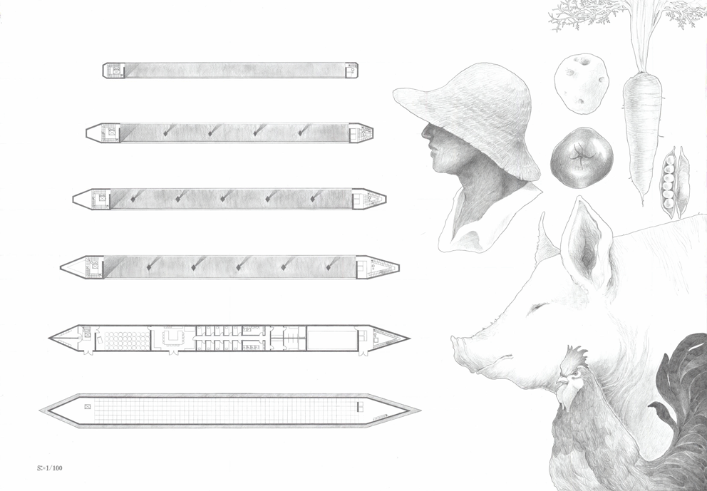 地球環境の幾末が懸念されている。そこで、いざというときに備え、穀物や野菜の種を育成・保存する工場を提案した。ついでに豚や鶏も飼う。DNAを操作するようなハイテクの施設ではない。土壌を作り、そこに種を植え、育て、種をとる、という在来農業である。その農地を細長い船のような形態でつくり、日照が採れるよう階高を高くとり、吹きさらしで積層した。水平線と急勾配の斜線による形態は力強く、孤高して屹立し、他に類のない造形である。
