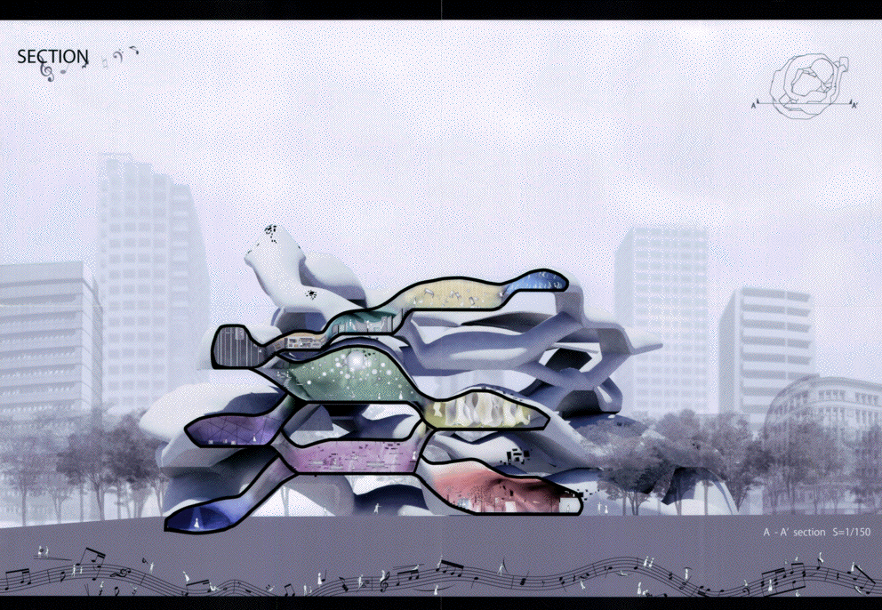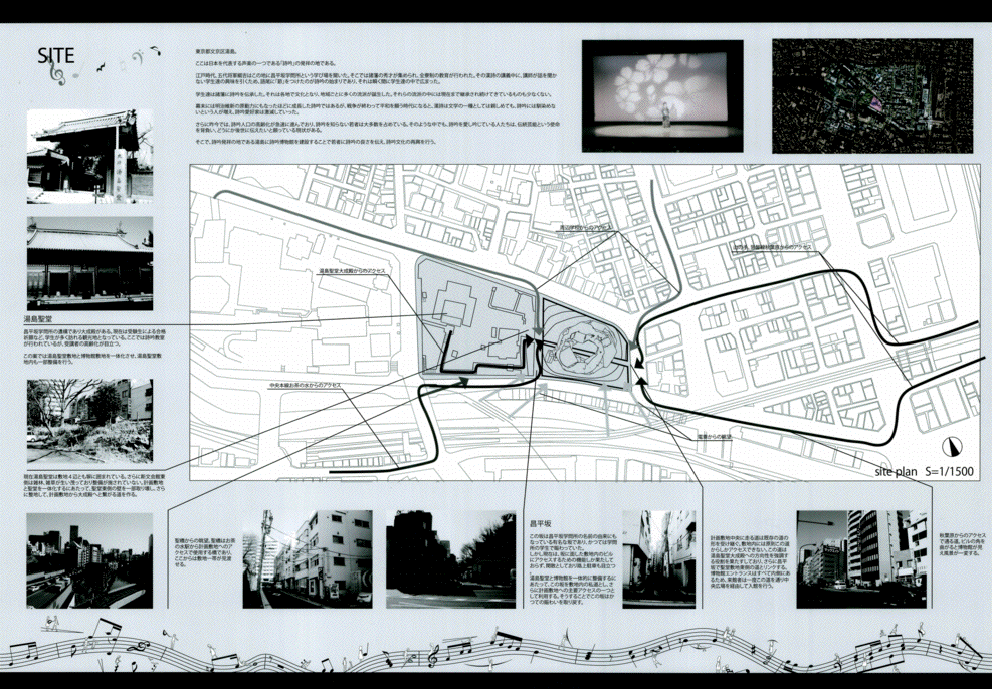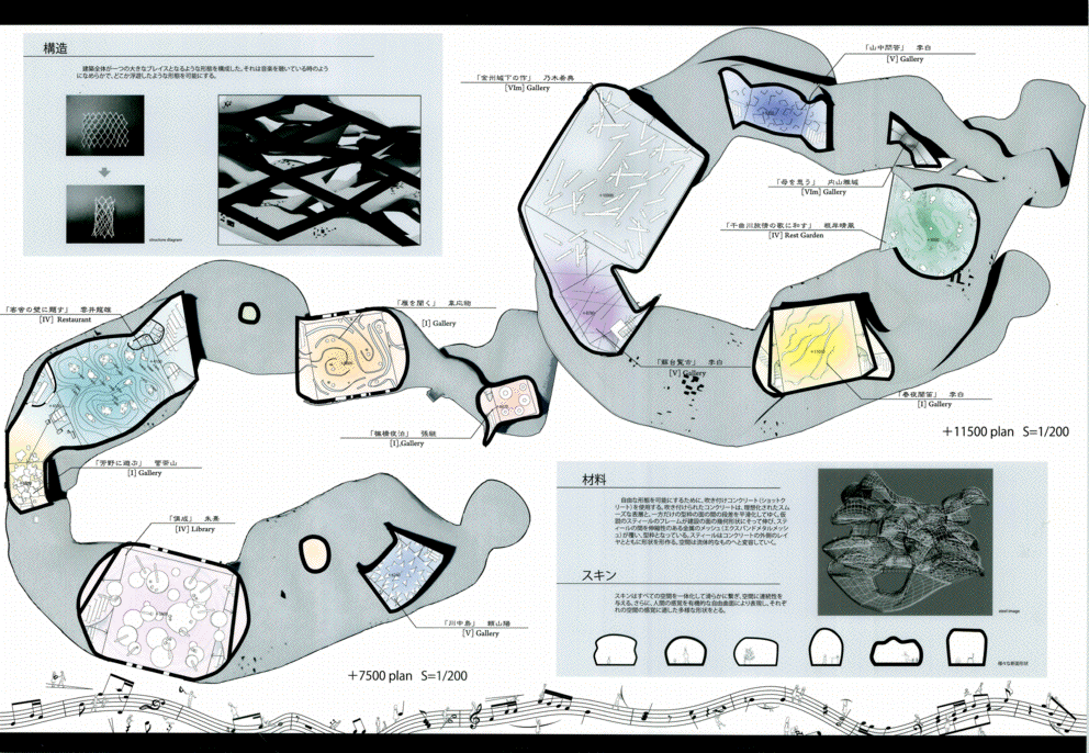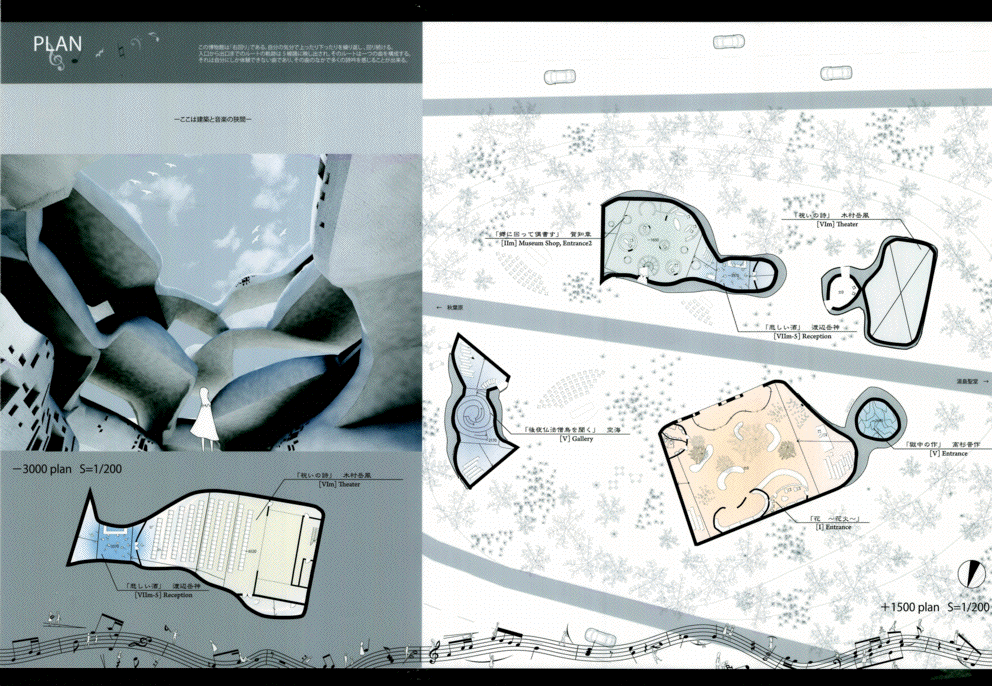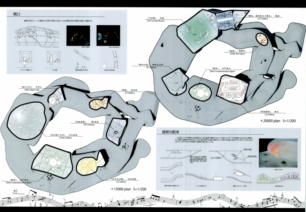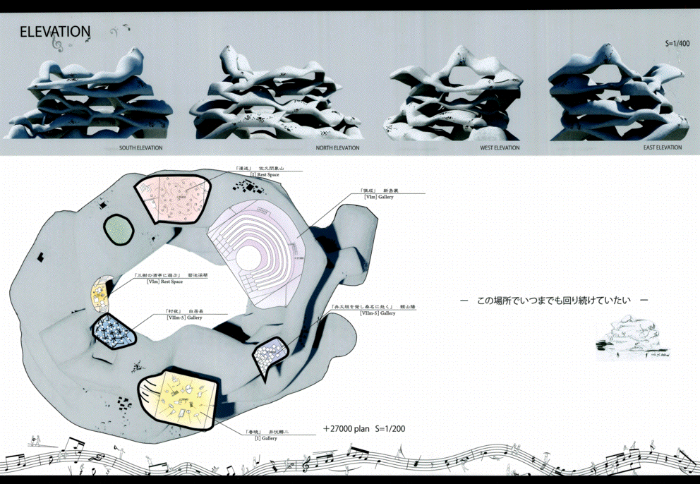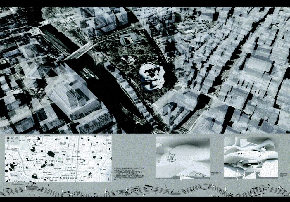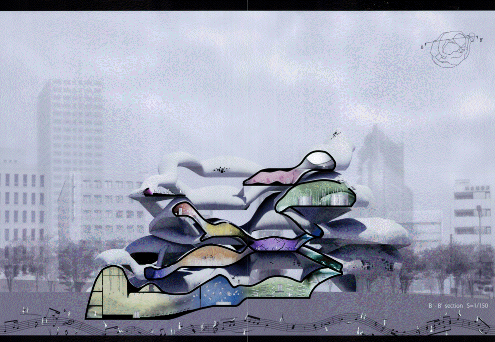 この作品は文京区湯島の昌平坂に建つ詩吟のためのミュージアムである。この作品の特徴である白い螺旋状の柔らかい造形は力強く圧巻で、かつてのF.キースラーを髣髴とさせるようで驚くほど美しい。また内部空間についても有機的な外観に劣らず執拗にデザインされており、建築としてのリアリティを備えていることは高く評価できる。また展示スペースは様々なテーマを持つポリクロミーの部屋が連鎖しており、作者が形態生成過程で和音の音階をモチーフにしたという階層を螺旋状に上下しながら回遊できる構成になっている点もユニークである。ただ最後にこの昌平坂という場所に建つこの造形の必然性は十分に語られておらず、この地域のコンテキストの分析をふまえた納得いく説明は必要であろう。今後の研鑽を期待したい。