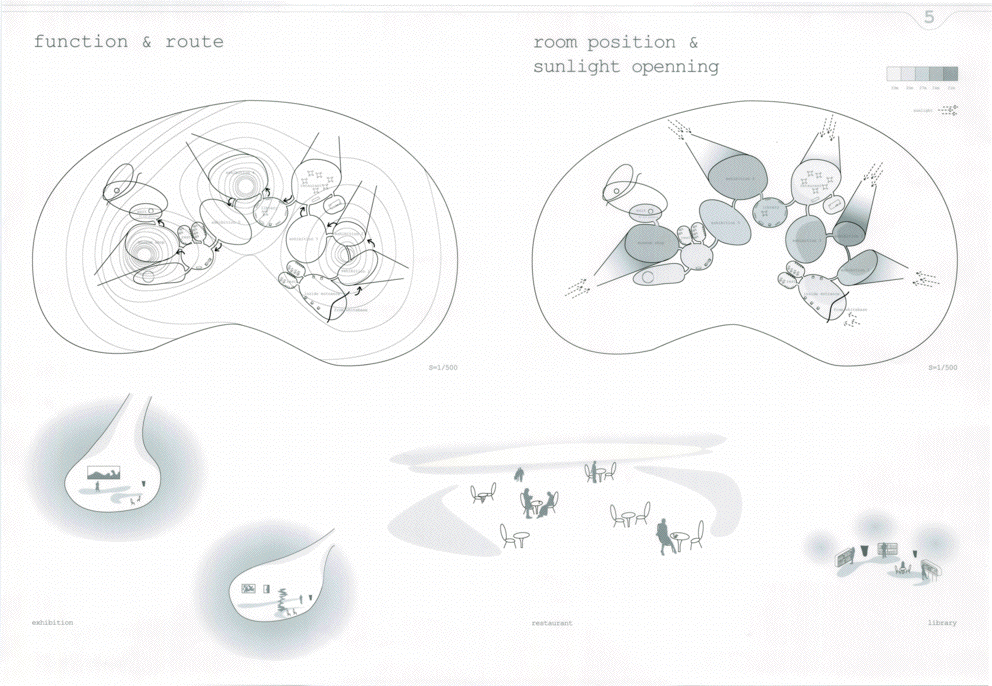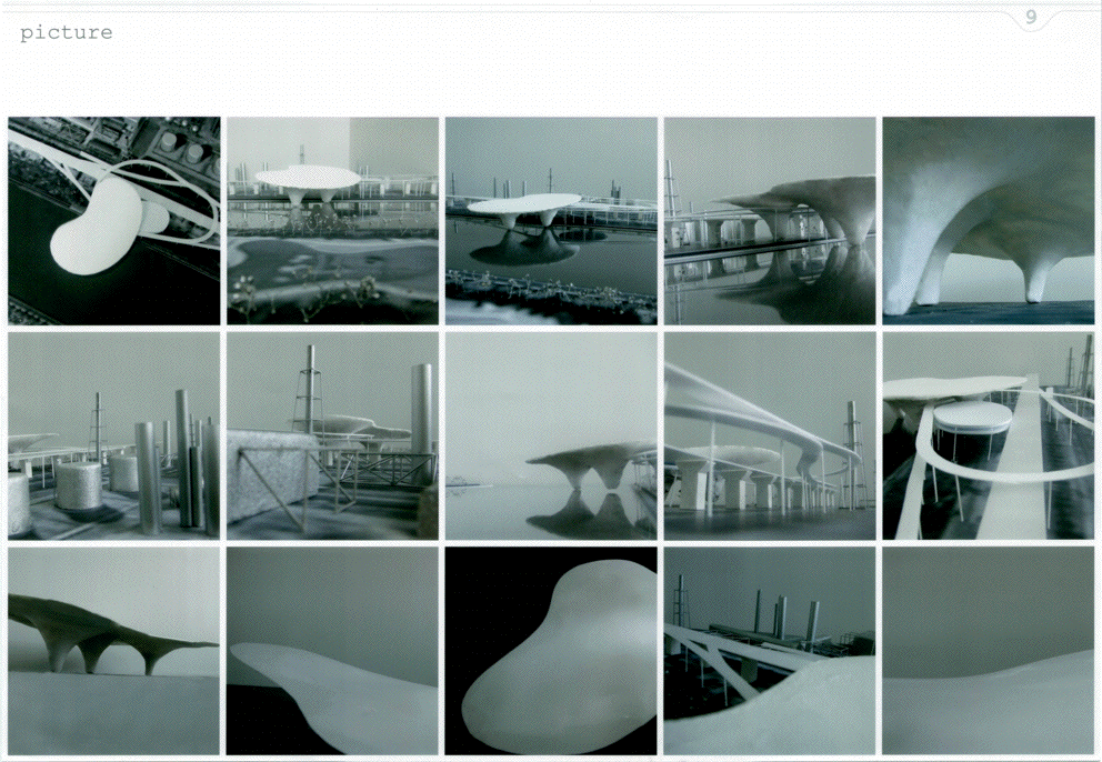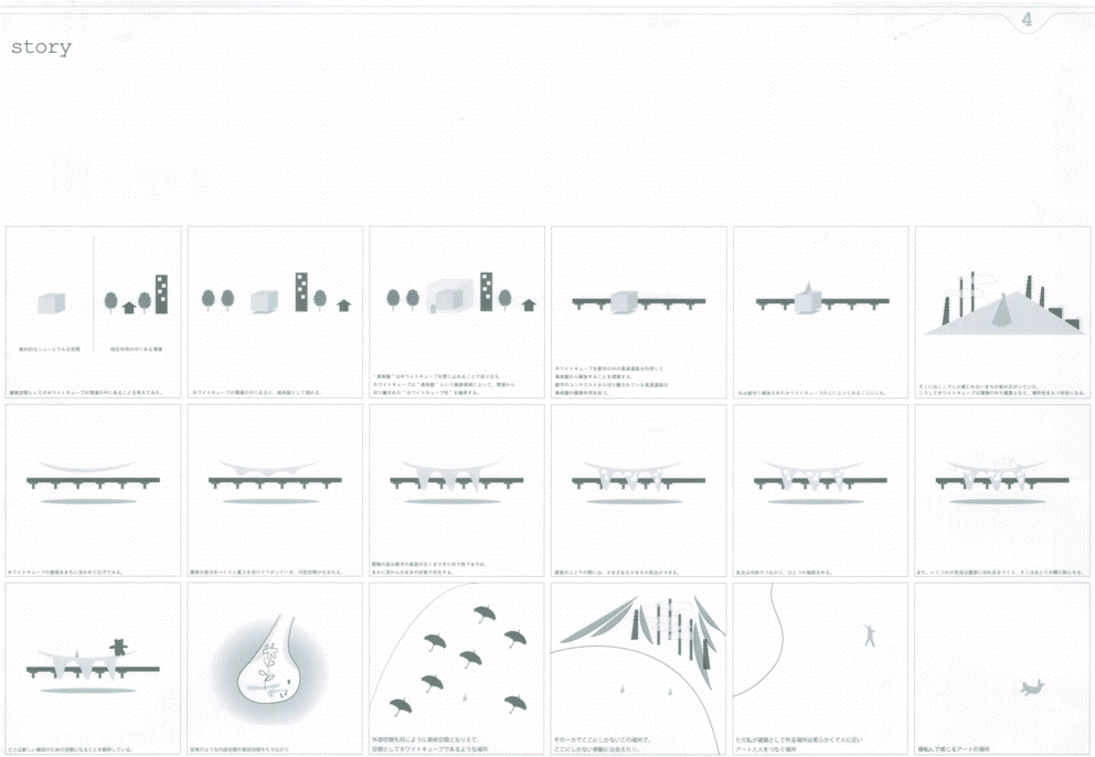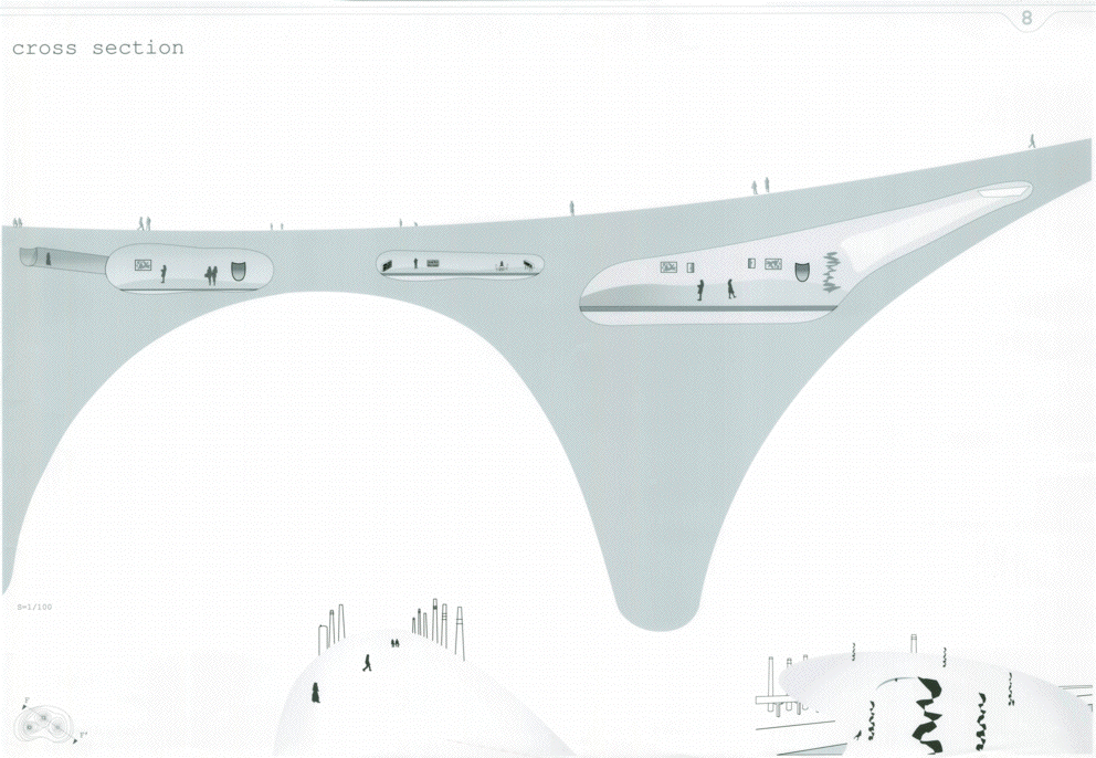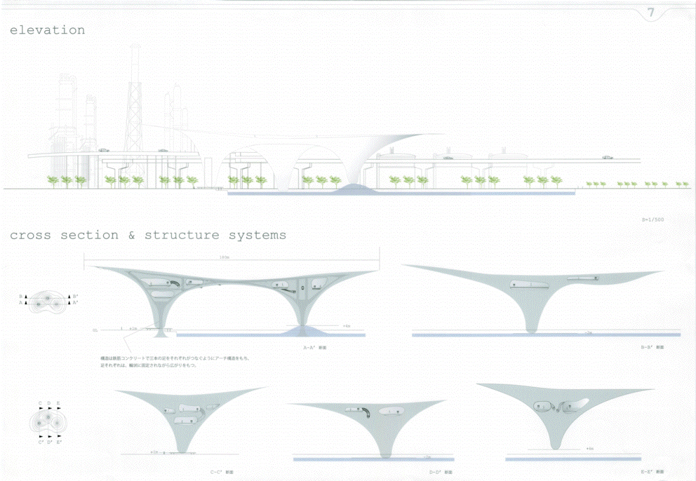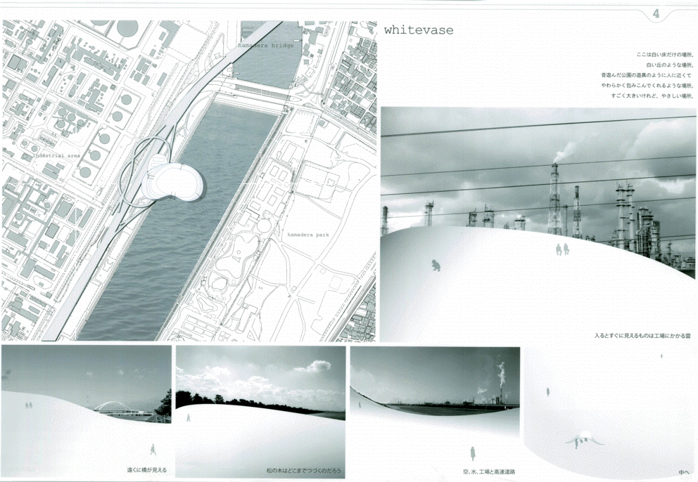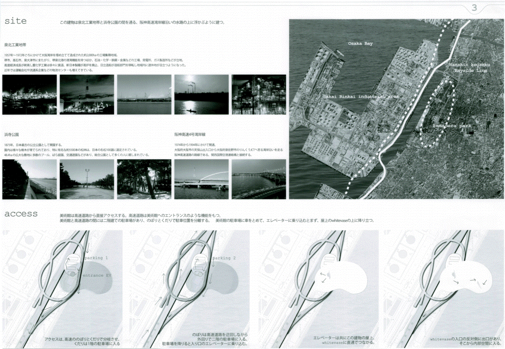 高速道路を挟んで西側の臨海部にはメカニックな工場群、東側は水路と公園の緑が広がる立地に、どこか見知らぬところからゆっくり降りてきた巨大な白いミュージアムである。ゆるやかに曲率する大きな面に建つと、その白の広がりの向こうに工場群が切り取られ、広がりのなかに時間と場所のコンテクストを離れたアート空間が生まれる。滴り落ちる3つのかたまりの中には、小さなといっても大きい展示室やカフェやミュージアムショップなどが気泡のように漂う。あまりにも大きい白の広がりではあるが、周辺のスケール感のなかでは十分ありそうな気がしてくる。丁寧なスタディによる造形の魅力はあるが、その空間性をもっと表現することが望まれる。また、コンセプトが十分に図面化されておらず、その空間の考え方が読み取れない。発想や環境と建築との関係のつくり方はおもしろく大いに評価できるが、もっと図面の密度を高め、コンセプトを空間化し表現する方法を高める必要がある。