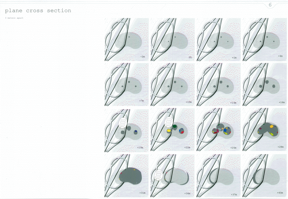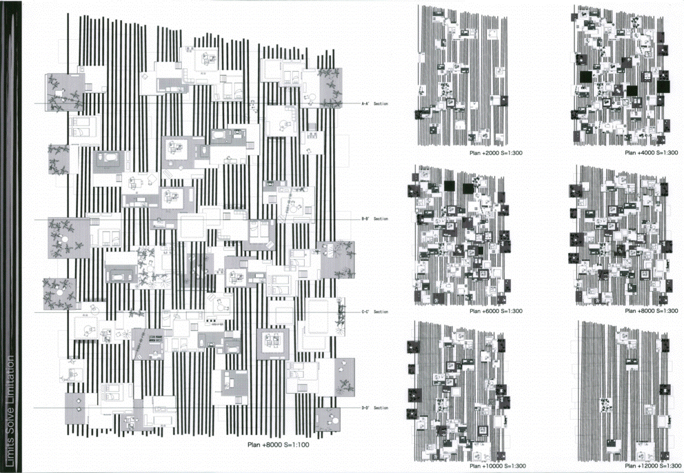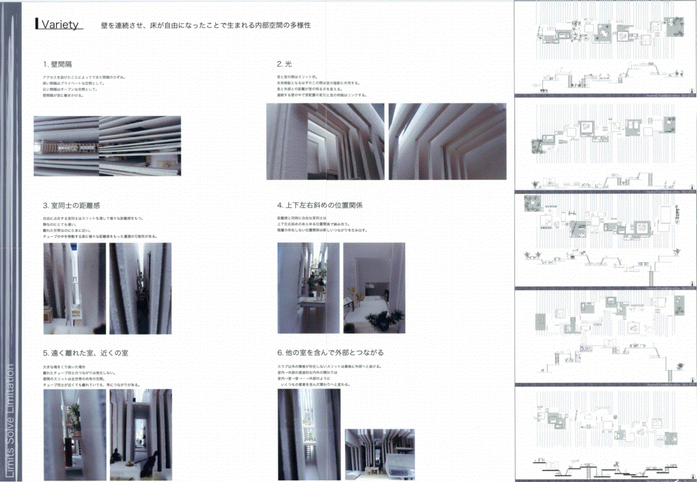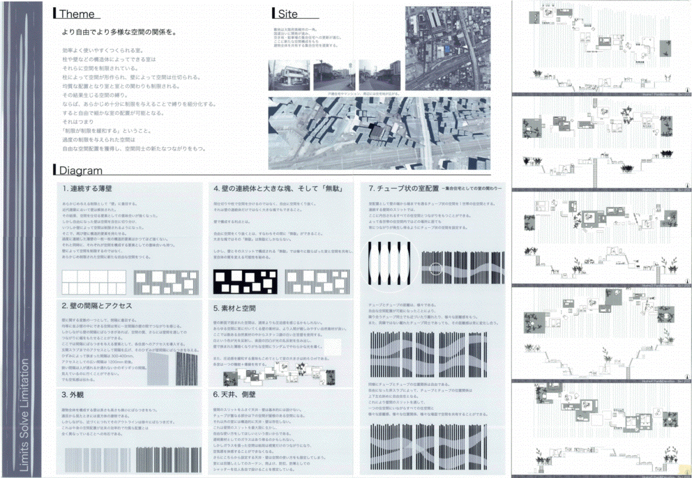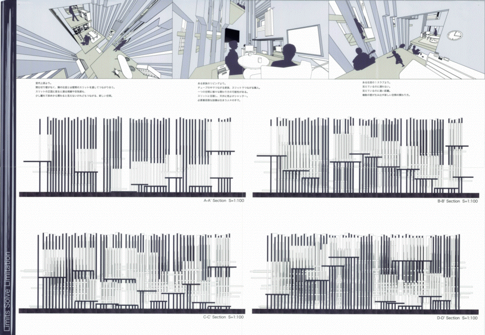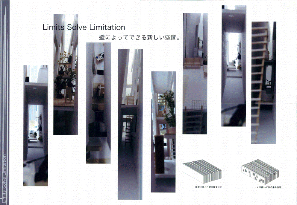 連続する壁面をくり抜いて空間を生み出すという試みは従来から見たことがある。しかし、永井君の作品が、以前のどの作品よりも抜きん出て面白いのは、壁面の間隔が30cmという、人が入れずメンテナンスもできないスケールを確信的に選んだ点にある。異なる住戸の住人に身体的な交流は無く、同じスリットの前に立たなければお互いの姿を見ることはできない。この作品に対する一見「開放的すぎる」という印象は誤解であり、人々の生活様式のサイクルがどこかで一致しなければ、お互いを隣人として認識することはないであろう。そして、一致する「どこか」をお互いに見つけていくことこそが、この集合住宅に共生の履歴をつむぎあげることになるのだ。