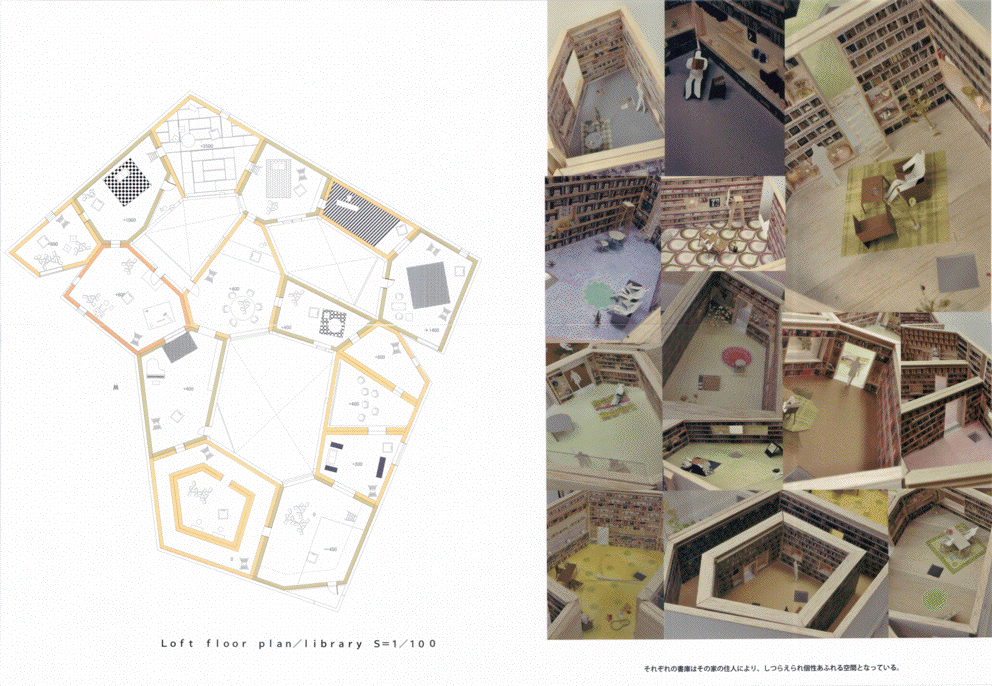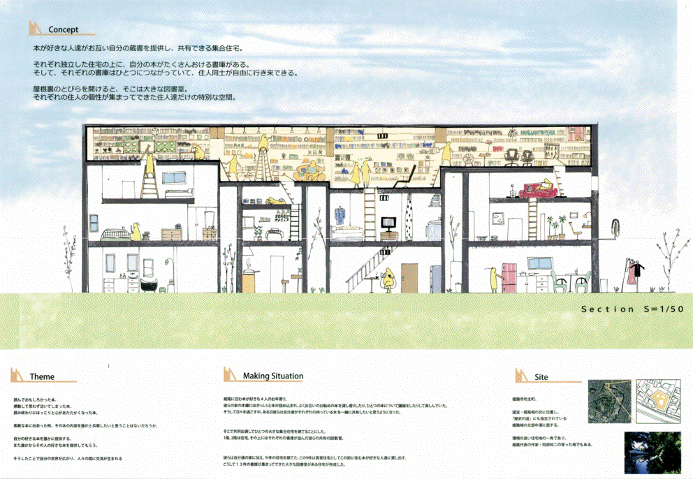 本好きな住民が集まって、お互いの本を自由に閲覧するなど各住戸に割り当てられた「屋根裏」の「図書室」を自由に使える集合住宅である。1・2階を各住民の住戸とし、「屋根裏」の「図書室」は集合住宅の住民で完全に閉じた空間としている。コレクティブハウスの場合共有するもの・ことが重要であるが、各自の蔵書を共有し、そこで閉じた一体の「図書室」をつくることで単純ながら魅力的なコレクティブハウスとなっている。