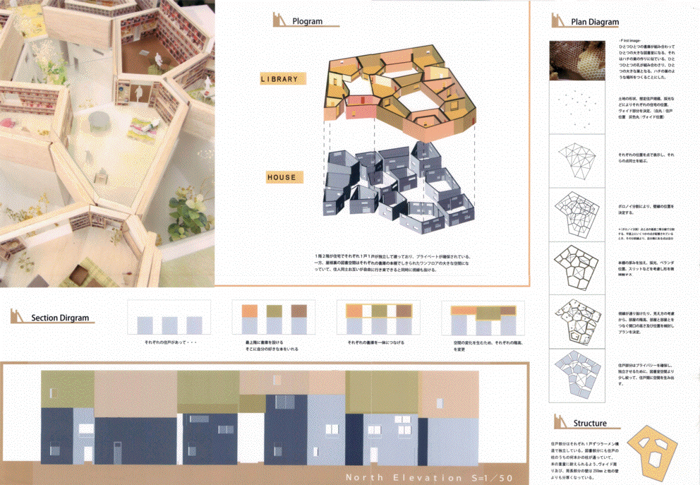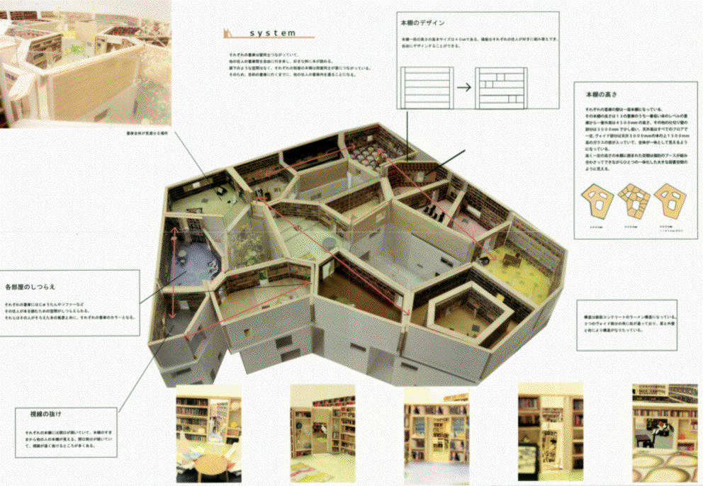 ボロノイ分割により各住民が管理する「図書室」は物理的に決められているが、本好きな住民の視点で設計している以上、必ずしも最適な決め方とは言えない点や、各自が管理する「図書室」が単調な空間の集合体となっている点が惜しまれる。より彼らの内面からアプローチした「図書室」があっても良く、天井高が高い空間や蔵書で一人囲まれた空間など多様な空間があれば魅力がより増しただろう。また共有する「図書室」の検討は十分なされているが、各住戸と「図書室」との関係がほとんど検討されておらず、完全に分断されている点も惜しまれる。