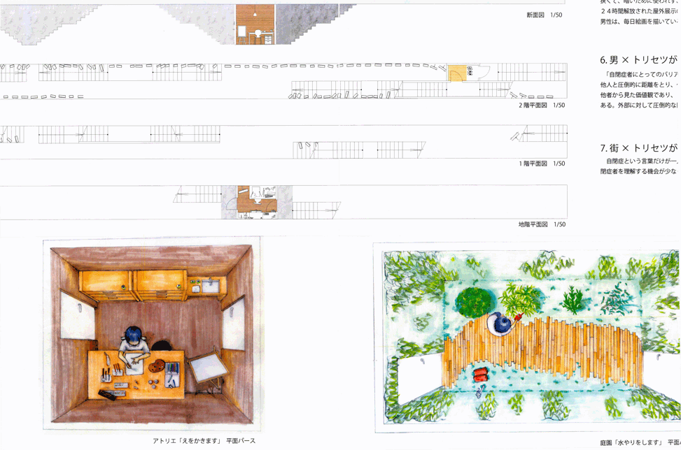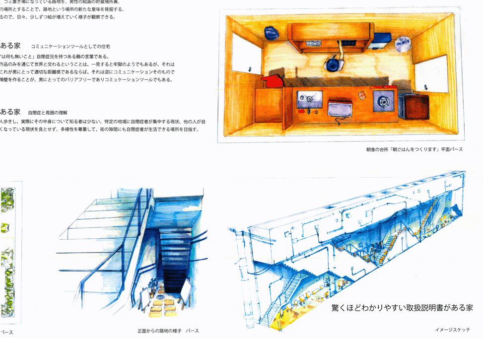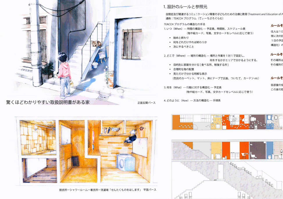 社会ではさまざまな障害を持った人たちが生活している。ノーマライゼーションが浸透するなか、それらの人に適した住宅や就労の場を確保していくことが必要である。しかしながら自閉症は漢字の意味から誤解を生み、自閉症のことについて十分に理解されているとは言い難く、その支援について遅れている。この作品では、自閉症者が安全に安心して過ごすことができる方法を建築の面から実験的に提示していることは意義深い。