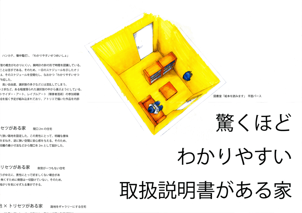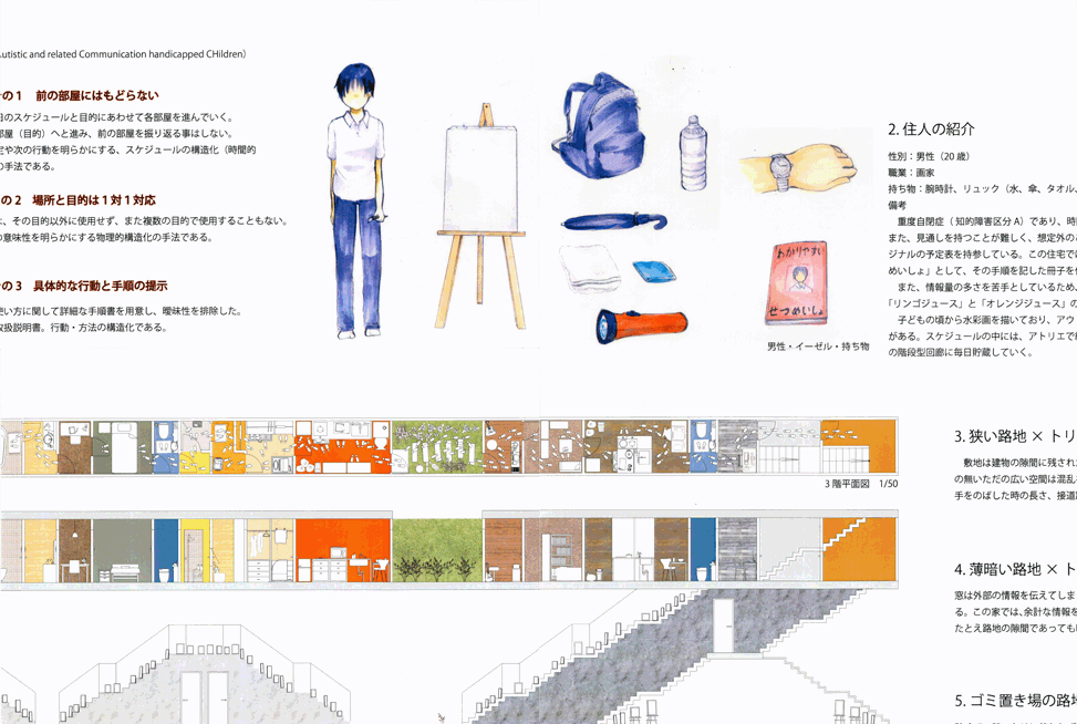 この作品は、自閉症者が自立した生活を送るために、1日の時間軸に沿って展開される細分化した生活行為と室を1対1対応させた住宅である。自閉症の障害特性である認知と知覚の問題に配慮し、分かりやすさを求めた。この住宅は不要な情報を遮断し、できるだけ変化がないようにし、今自分はそこで何をするのかが分かるよう最小限の室を設けて行為を規定した。決まった順序で決まった行為を行うため、1つの行為にのみ集中できる室を用意し、それが終わると次の室に移るといった具合に次々に室を移動していき、家事と絵描きの仕事を行うことで安定した生活を送る。