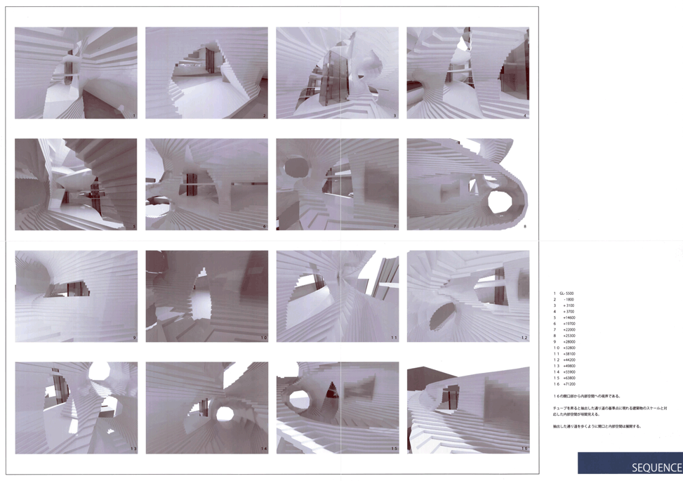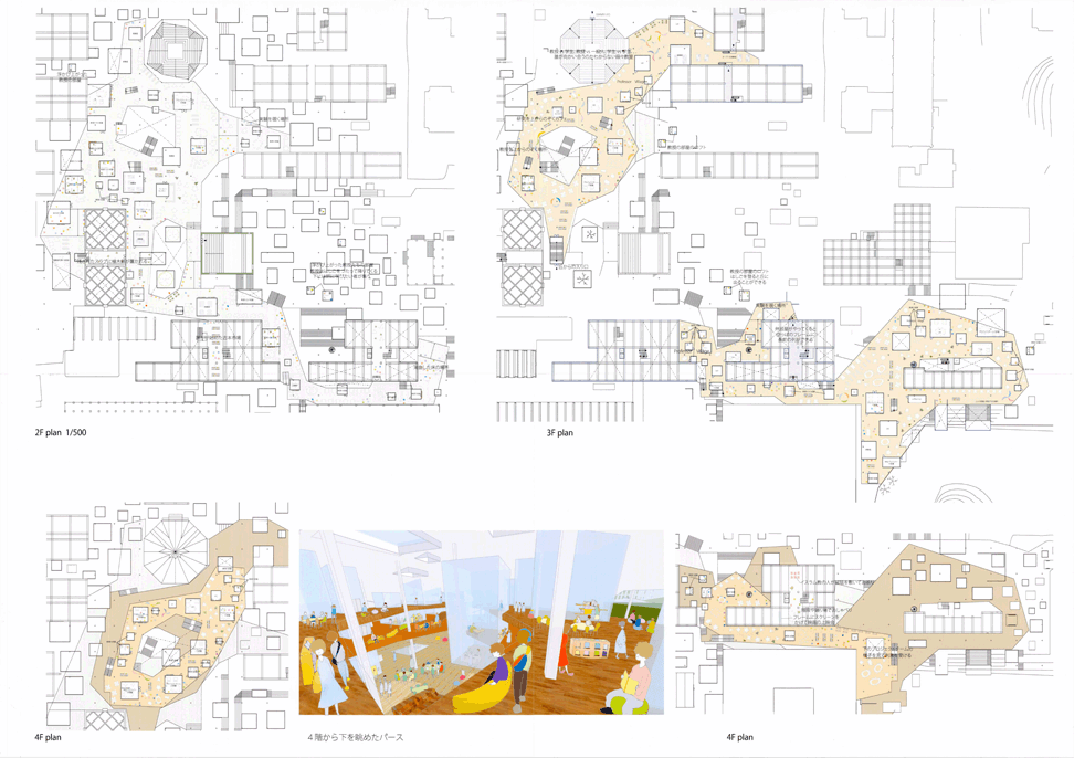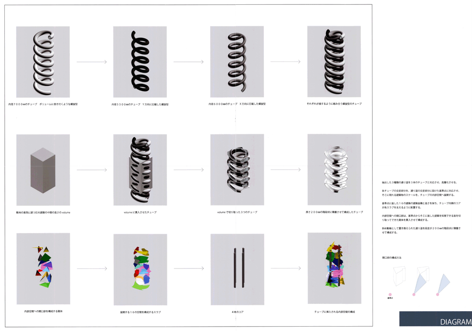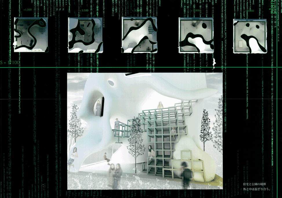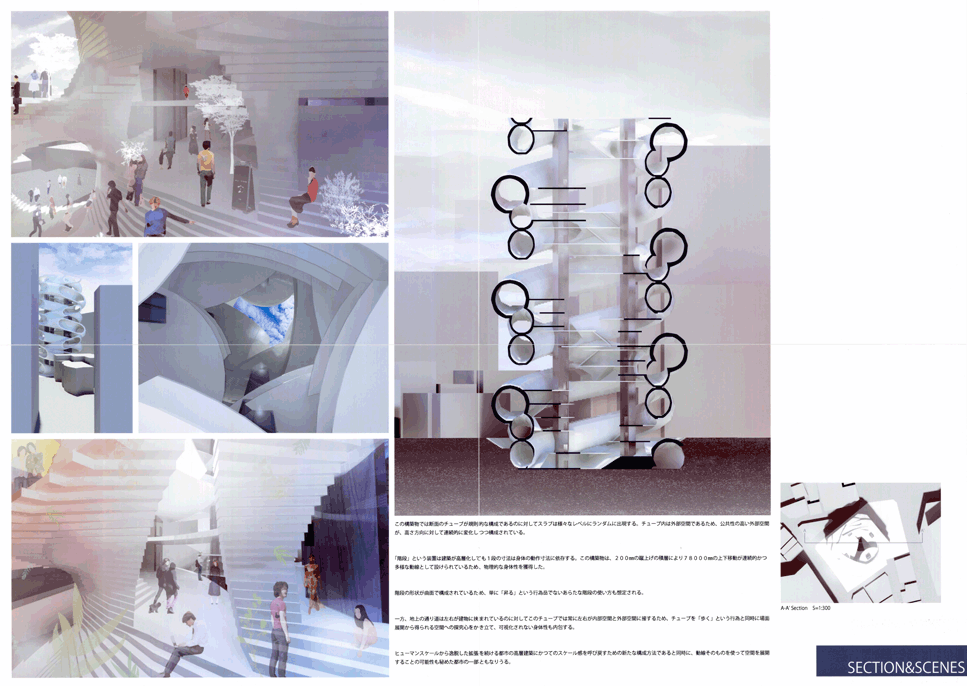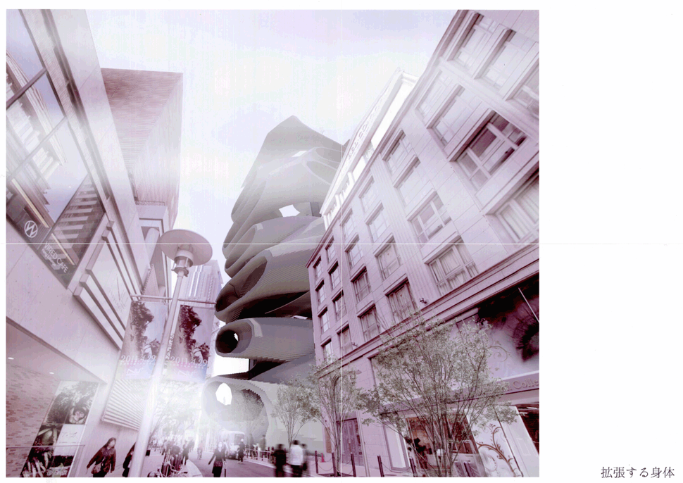 再開発によって単純なタワーばかりが建設される状況に対し、本作品は茶屋町の3本の道の構造を元にして、3本の螺旋状チューブからなる複雑な構築物を創りだしている。表層的でない高層建築デザインの方法論の提案として、またなにより、それによって生まれた迫力ある建築空間の造形力と都市風景を評価したい。欲を言えば、螺旋自体は複雑だが全体としては単調な印象もあること、また「拡張する身体」という挑戦的なタイトルを名乗るからには、単にチューブの曲面に自由に座ったりするだけでなく、都市空間・風景の中に身体が展開していくイメージの情景を見せて欲しかった。そのためにはせっかく生まれた形態を生かした都市機能を入れてもよかったのかもしれない。