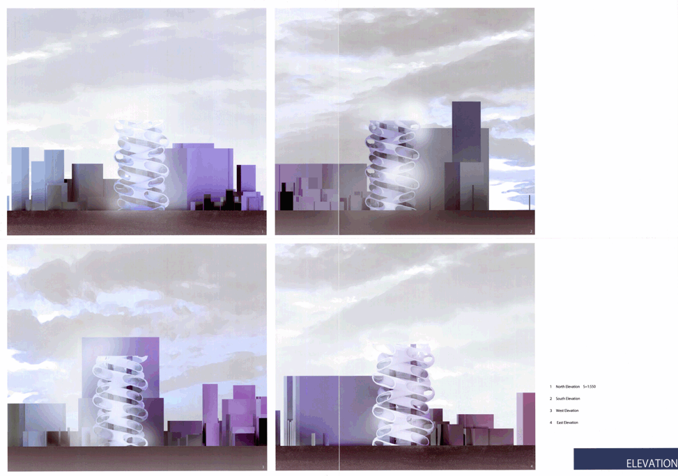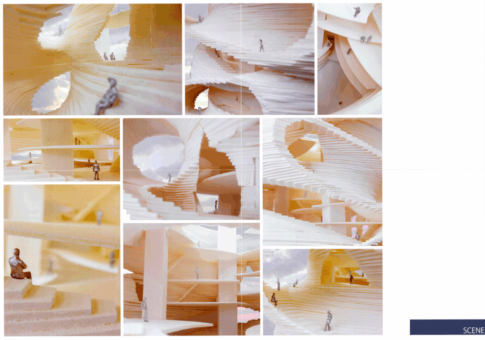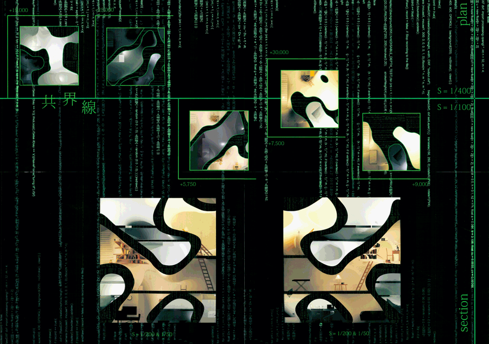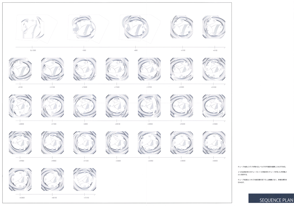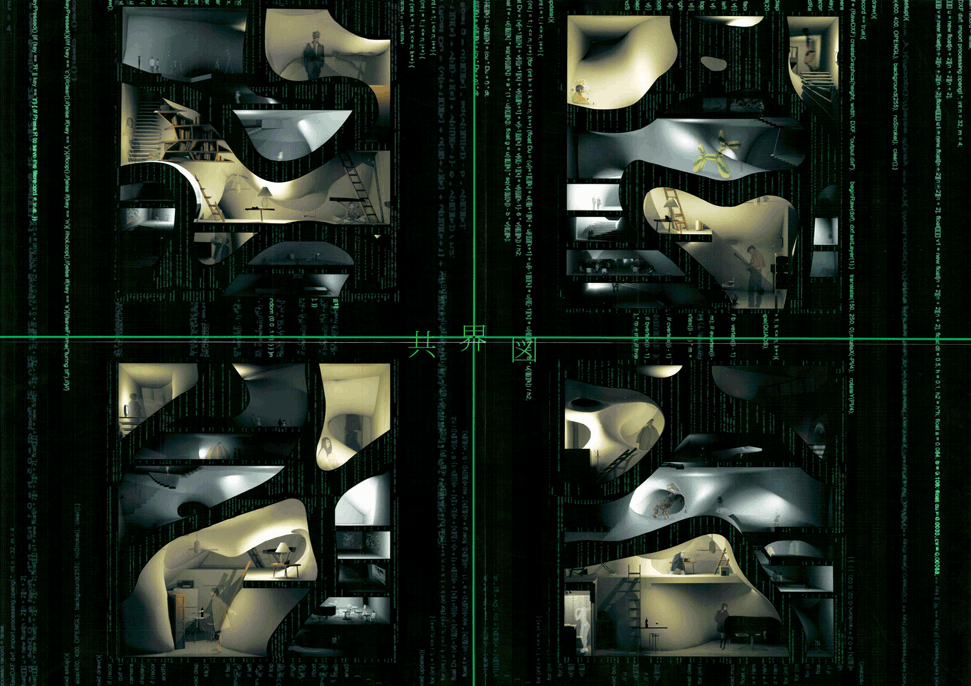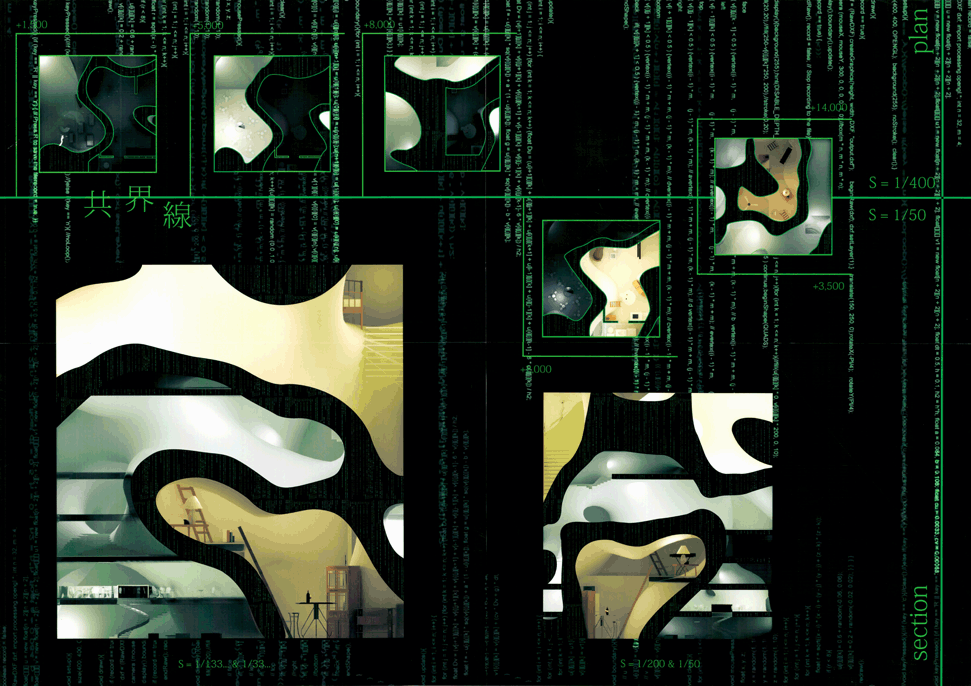 再開発によって単純なタワーばかりが建設される状況に対し、本作品は茶屋町の3本の道の構造を元にして、3本の螺旋状チューブからなる複雑な構築物を創りだしている。表層的でない高層建築デザインの方法論の提案として、またなにより、それによって生まれた迫力ある建築空間の造形力と都市風景を評価したい。欲を言えば、螺旋自体は複雑だが全体としては単調な印象もあること、また「拡張する身体」という挑戦的なタイトルを名乗るからには、単にチューブの曲面に自由に座ったりするだけでなく、都市空間・風景の中に身体が展開していくイメージの情景を見せて欲しかった。そのためにはせっかく生まれた形態を生かした都市機能を入れてもよかったのかもしれない。