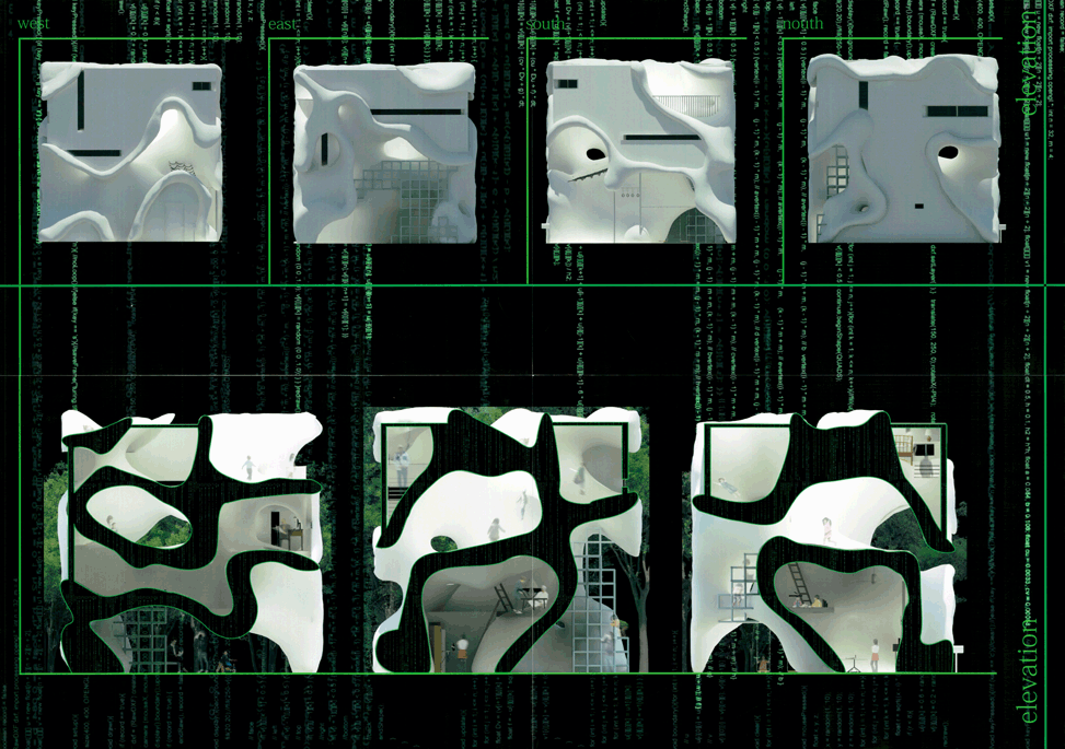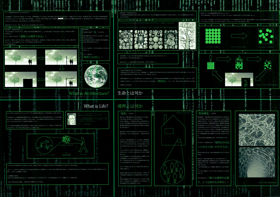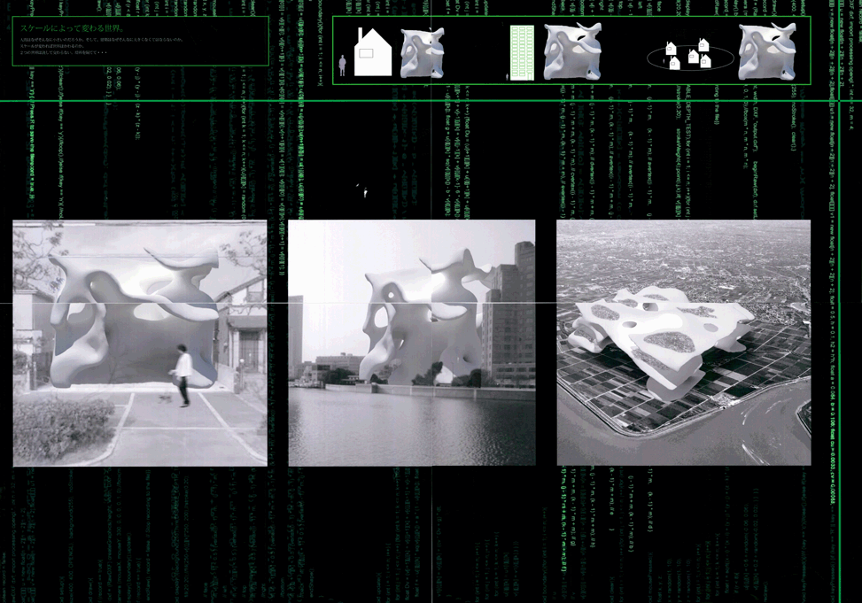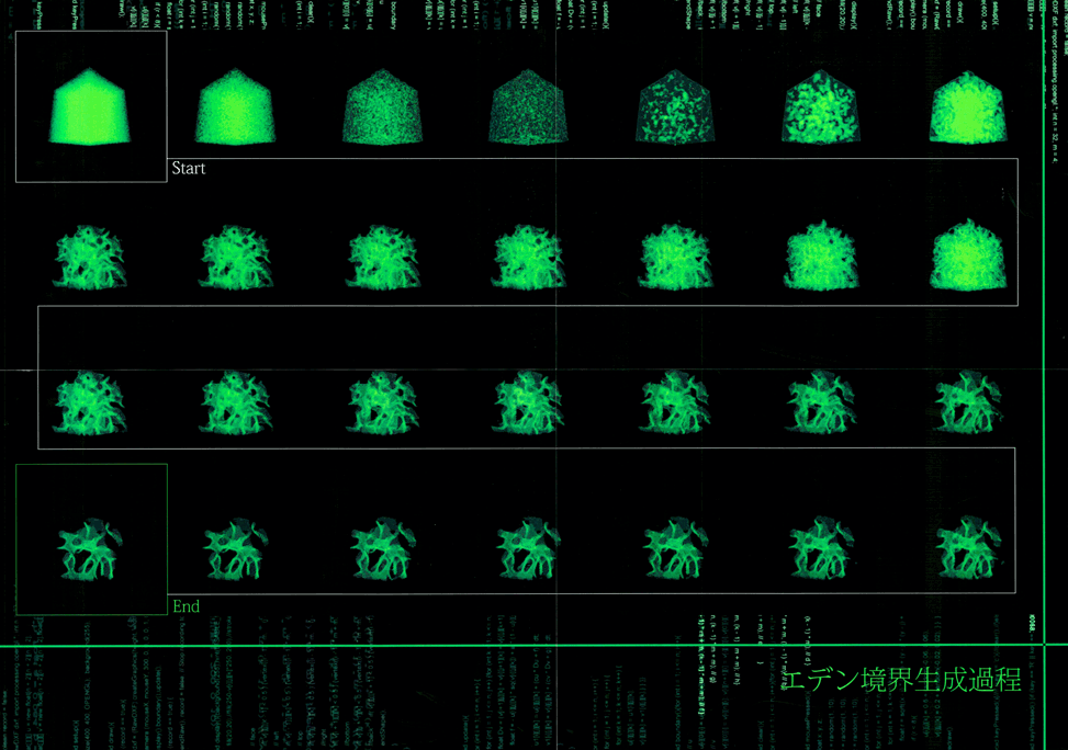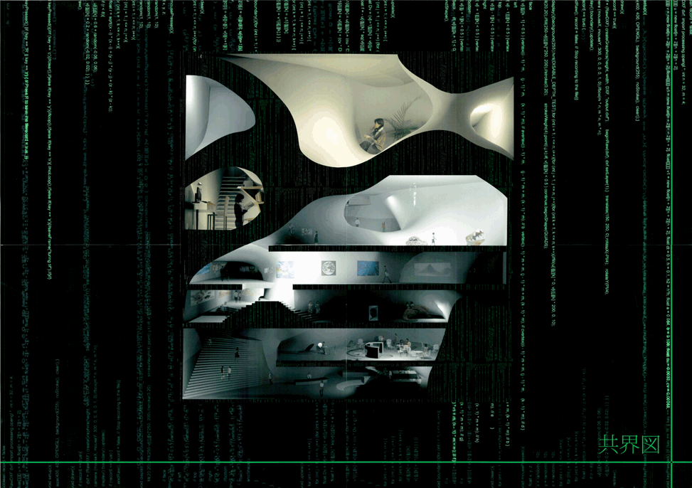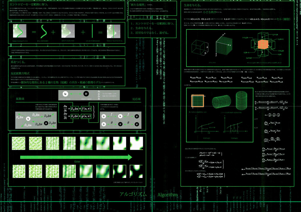 これは生物の活動原理をもとに新たな建築の空間構造を探求した思考実験であり、次世代の建築原理を提示した点で極めて秀逸である。シュレディンガーは生命現象を支配する物理的制約として、あらゆる生命は反応拡散によってエントロピー最大化へ向かっており、それを制御することで現在を維持していると述べている。ここで用いられるチューリングの反応拡散方程式はこれまで、2次元平面において生物由来の表層模様を擬似的に生成させることで知られているが、作者はこれを3次元空間に拡張することで、新たな建築の空間構成原理を発見している。ここで得られた構造体は連続する1枚の曲面で2つの境界域を生成しており、区切られた2つの空間は同時に存在するが、決して交わることは無い。作者はこれを用いて様々な次元の異なる建築的様相を仮想的に共存させて提示している。この提案はあくまで実験段階ではあるが、生命体の生息する場の生成手法として、これまでの建築の形態構成原理にあらたな第一歩を画するものと考えられ、極めて斬新な提案であると判断する。