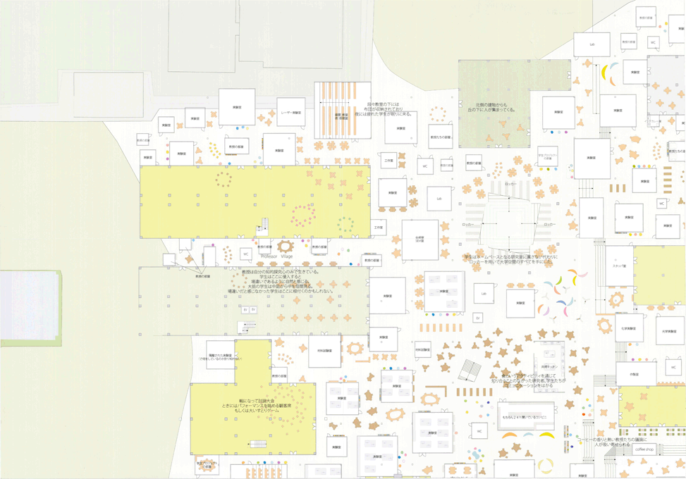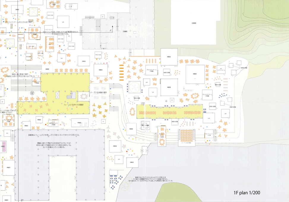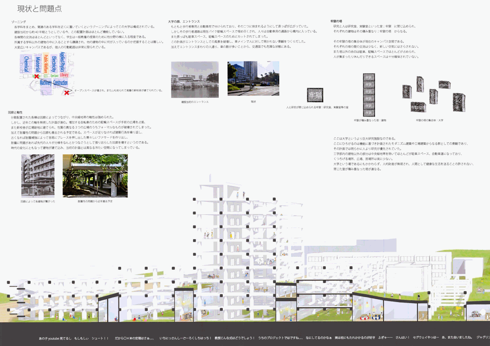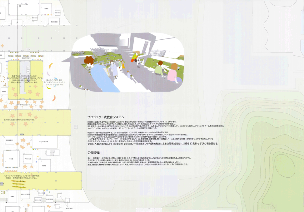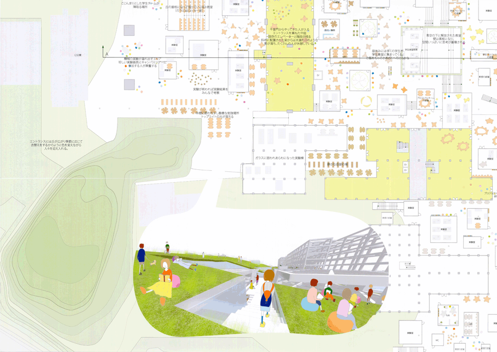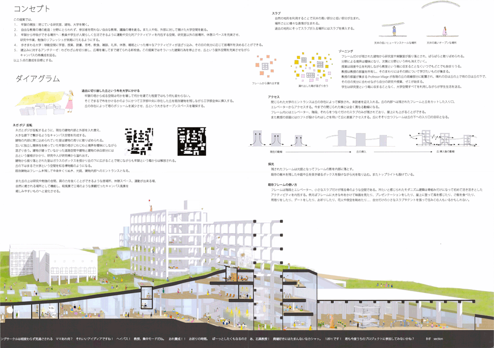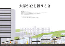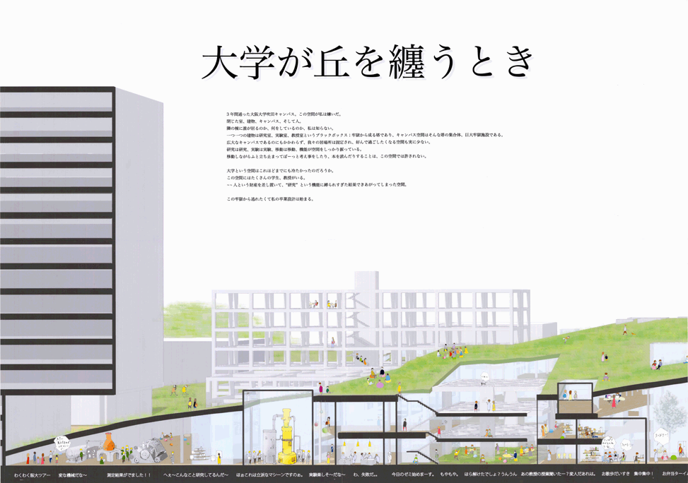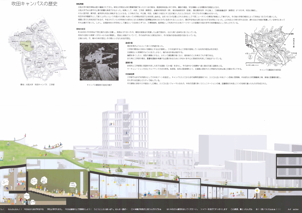 大阪大学吹田キャンパス工学部ゾーンへの大胆かつ真摯な提案である。キャンパス造成以前の丘の地形で全体を覆い、既存の建物はフレームだけ残して、中身は丘の下のアトリウム的大空間に展開させている。組織変更に伴う増築等によって計画当初の空間構造に限界がきている現状、また根源的には、機能的な縦割りのブラックボックスによって構成される大学空間の閉塞感に対する問題提起として、そして自分の生きる場をより良く変えていこうとする強い意志に基づくデザインとして高く評価したい。自由に散策したくなるのびやかな丘の上と、その下に広がるゆるやかな研究・教育ゾーンはどちらもぜひ一度見てみたい風景である。丘とフレーム化した建築という明解な提案であるが、もう一つくらい、研究・学習の場のための中間スケールの仕掛けがあってもよかったかもしれない。