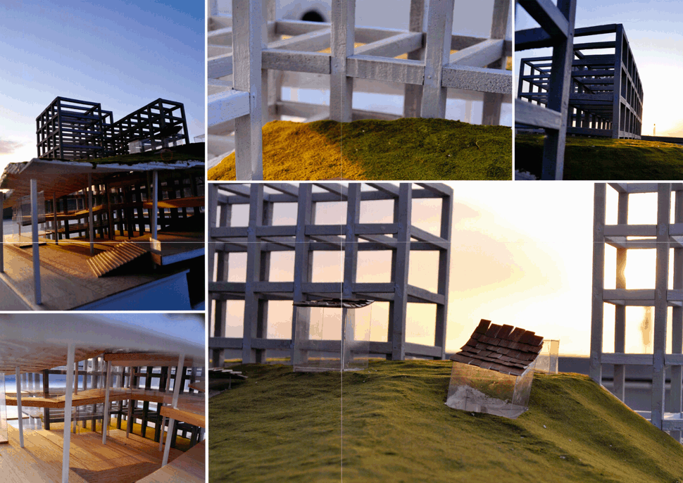 東日本大震災で被災した宮城県女川町竹浦集落の高地移転計画である。作者は卒業論文で、竹浦集落も含めた女川湾を囲む17集落のコミュニティと漁業のしくみに関する研究を行い、その成果が地域で認められ信頼関係を築き、高所移転計画の提案を求められるまでになった。現在土木系の計画コンサルタントが造成計画の案を作成しており、計画案の問題点を分析しながら、地盤の弱い「沢」の保護、水際を遮断するアクセス道路の改善、小グループの近隣関係に対応した街区編成などを提案した。震災前の生活環境の成り立ちを深く読み解き、現実の様々な制約と向き合いながら、移転後の住宅地に従前の社会空間のしくみ継承しようとする姿勢が高く評価され、優秀賞に選出された。一方、卒業論文を着想した当初の、本来の風景構造の継承やコミュニティの再編といった構想を保留してしまったこと、さらに、切り土のデザインや住居の設計になお多くの検討の余地を残したことが惜しまれた。
