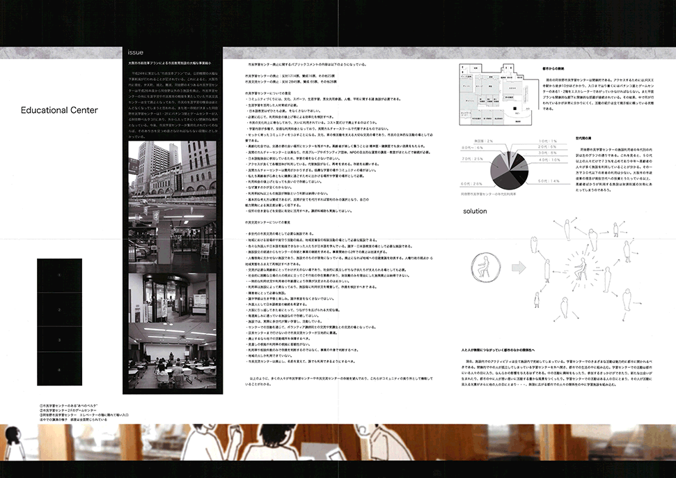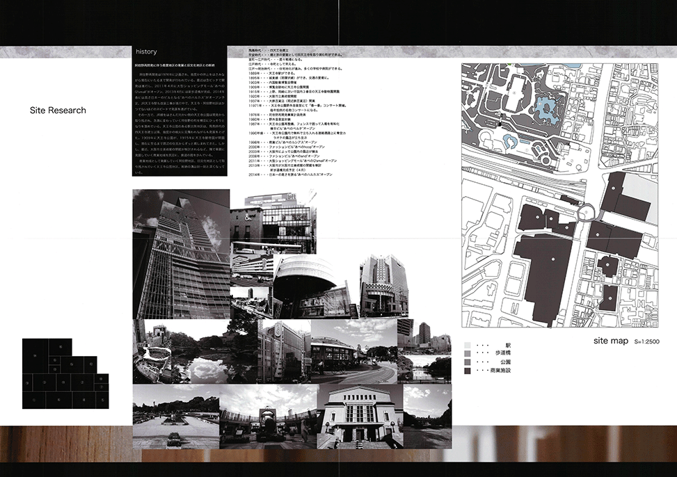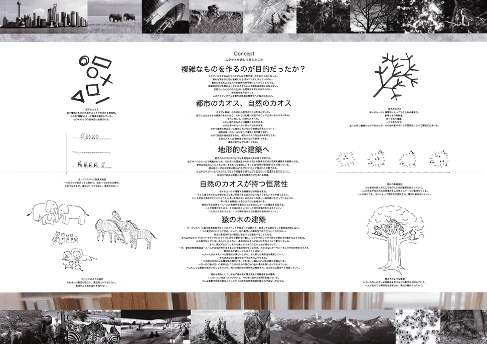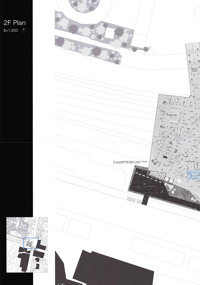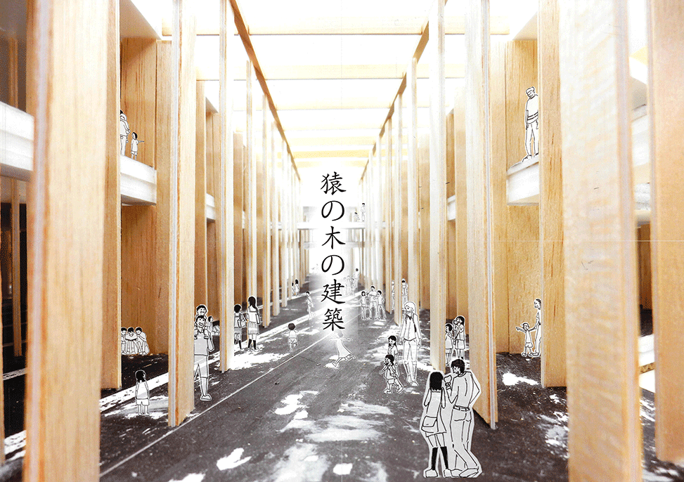 存亡の危機にある阿倍野の市民学習・交流センターを、公園と商業施設群をつなぐ位置に新たに計画するプロジェクトである。所用室が並ぶ閉鎖的な施設建築に対し建築家達が近年提案してきたオープンな空間が、遮蔽物がなく、各々が自由に独立して0から始められるが、後に何も残らない「サバンナのような場所」なっていることを大きな問題と捉え、拠り所となる遮蔽物があり、周囲の人と距離をとりながら、自由に場所を選択できる「猿の木のような場所」を目指してデザインされている。長さを変えた疎密のある壁柱群は、そこを歩き回る時に微妙に見え隠れし、図面で見える以上に様々な場を提供するだろう。多くの建築家が挑戦してきた現代の建築空間および地域施設の根本的な課題に対して真っ向から挑み、新しい回答を提案した力作である。強いて言えば、「猿の木」から期待される立体的な空間関係がほとんどないこと、少人数での勉強会のような焦点のある目的的な活動をどのように受入れられるかを説明する絵が少ないことが惜しまれる。