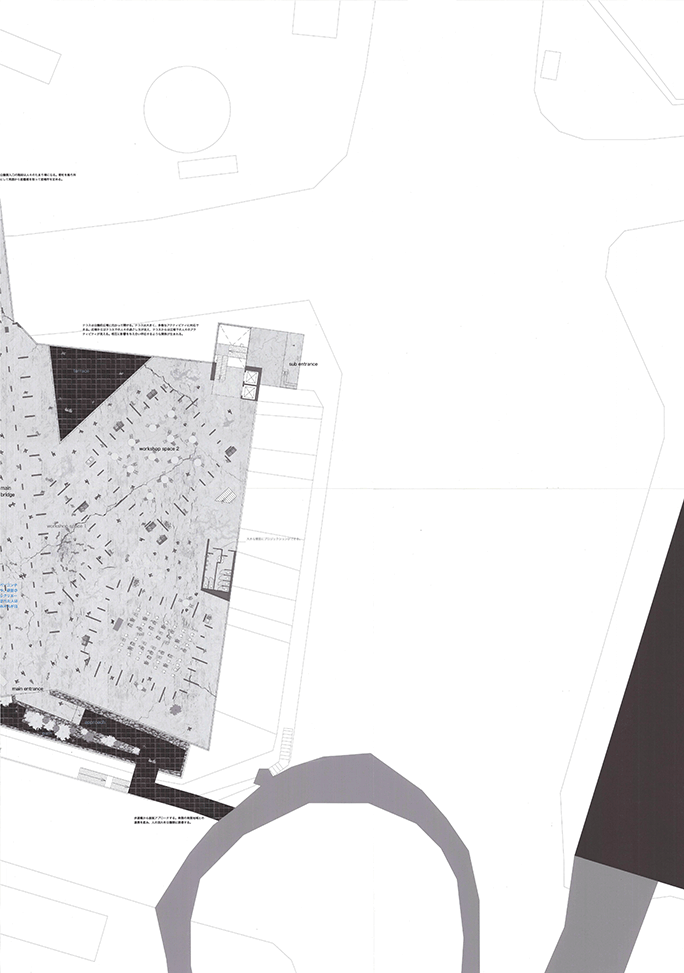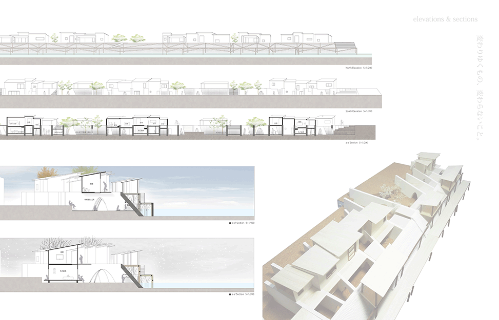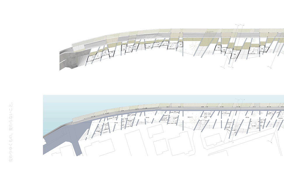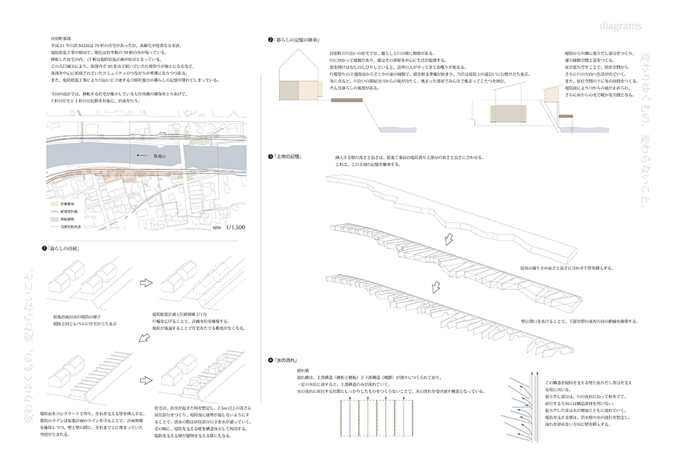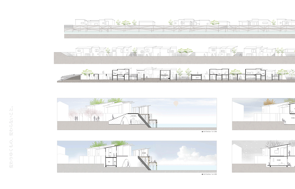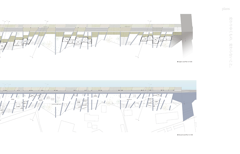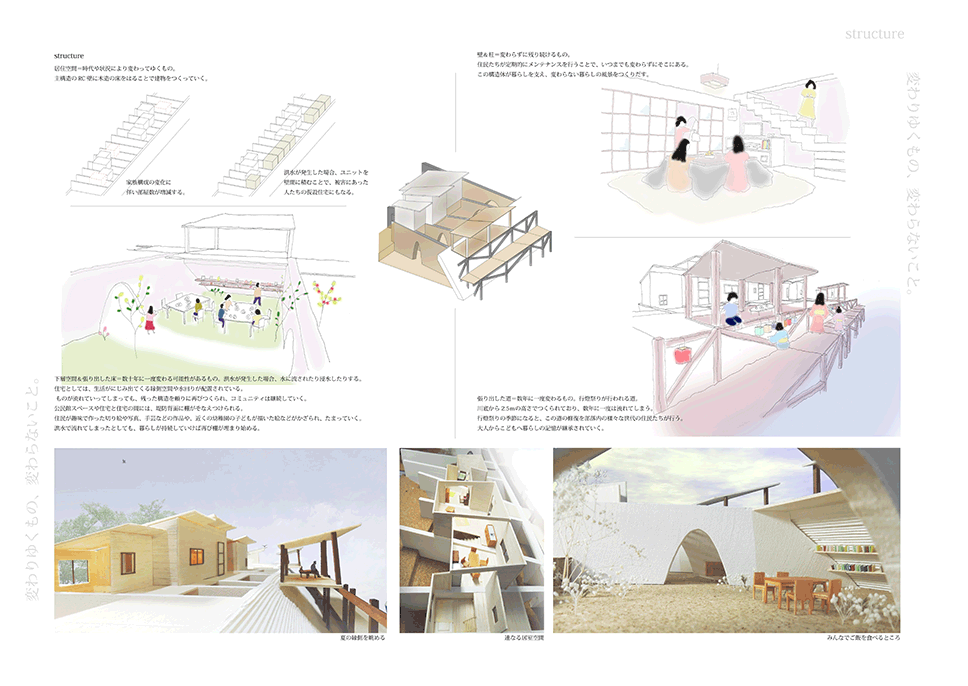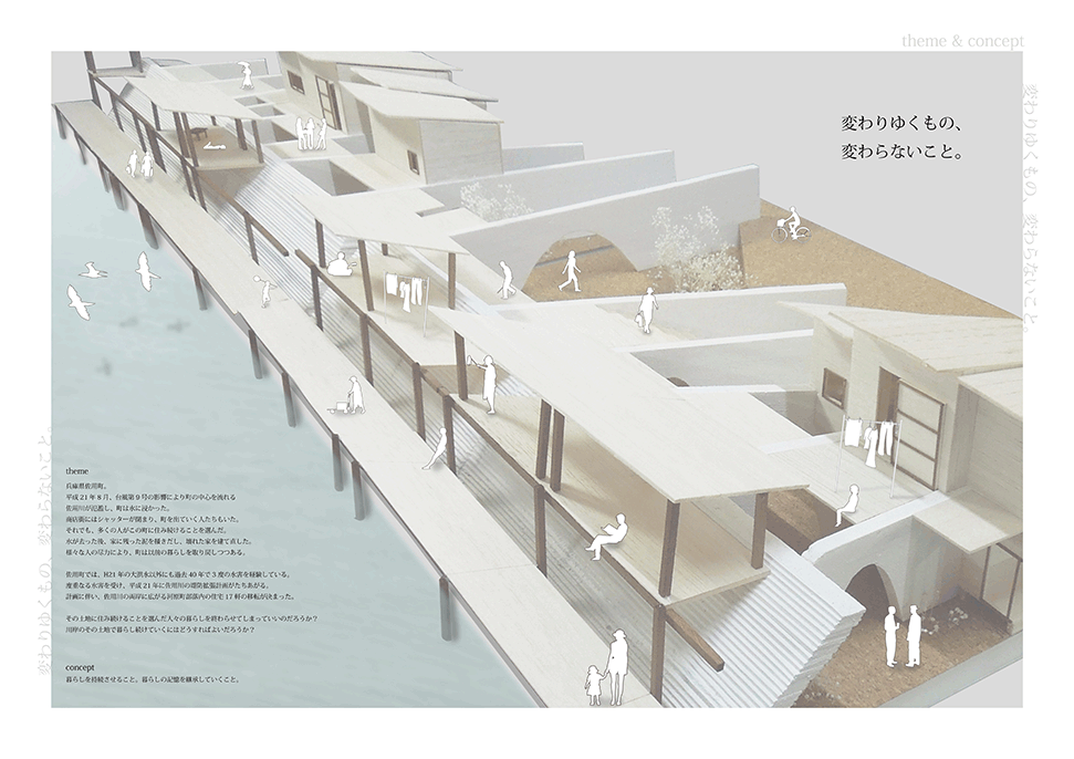 兵庫県佐用町は佐用川の増水により水が堤防を乗り越え、広範にわたる後背地が被災を繰り返してきた。 堤防高を上げることは大幅なコストと年月を要し現実的ではない。作者は最も被災の激しいエリアの堤体を‘列壁’に置き換え、堤防を乗り越えようとする水流を受け流し、あたかも‘吸収’するような方向と間隔に再構成している。‘列壁’の間と上部には木造の住居や共用空間が架け渡され、激しい水流に遭遇しても過半は存続するように設計されているため、災害時には居住者や被災者の復旧活動の足掛かりとなる。現堤体が構築される前の地形と居住文化を調査し、堤体の形状を従前の地形に整合し直している点、住居と川面との関係性を再構築している点は秀逸であり、後背地の大半が流される被災においては街並み再生の依り代ともなるであろう。本作品は、従来の土木的な構築物である堤防のあり方を見直し、建築と土木、自然と人工物、防災と日常といった二元的な枠組みを等化する試みであるともいえよう。