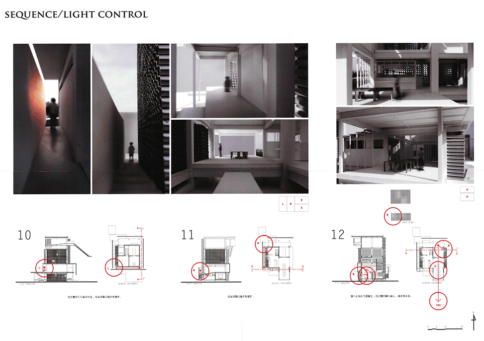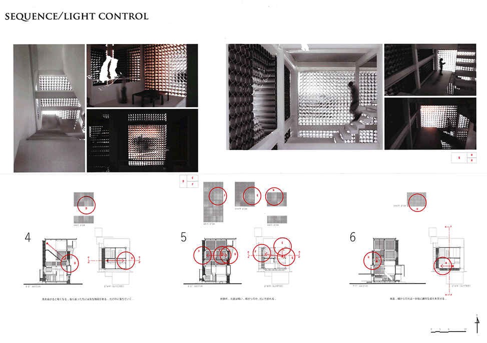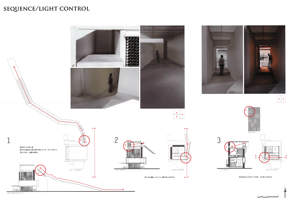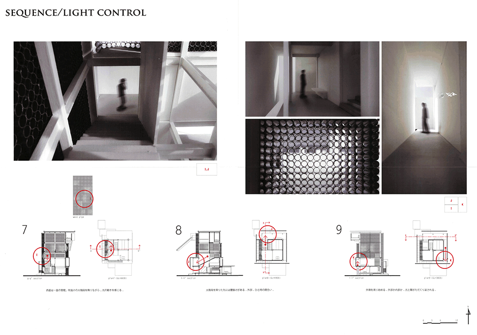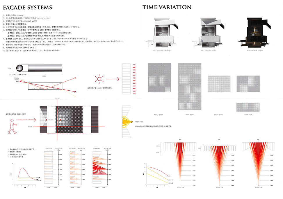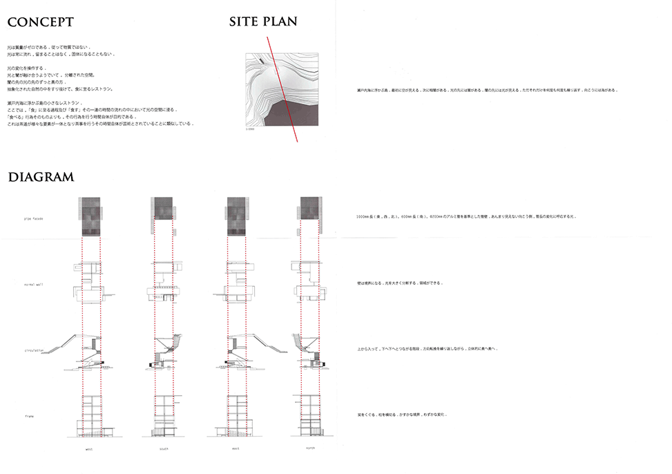 直径200mmのアルミの管で構成される独特の壁面システムを提案した印象的で美しい建築である。各領域のゾーンごとに基準管が設定され、太陽の方向と時間、人の立つ位置と移動に合わせて、管の長さと配置を緻密に変化させて生まれるグラディエーションは空間を構成する新たな面として非常に魅力的であり、光と闇の体験をデリケートにコントロールしている。管壁だけでなく建物底部のひさしやテラスのデザインにもセンスを感じ、図面と模型のプレゼンテーションも抜群である。反面、緻密にデザインされたスペースが、あくまでレストランの食事スペースへのアプローチ空間であること、壁面システム以外に、空間や光を組み立て演出する各種の技やヴォキャブラリーがあまり使われていない点には疑問を感じないでもない。