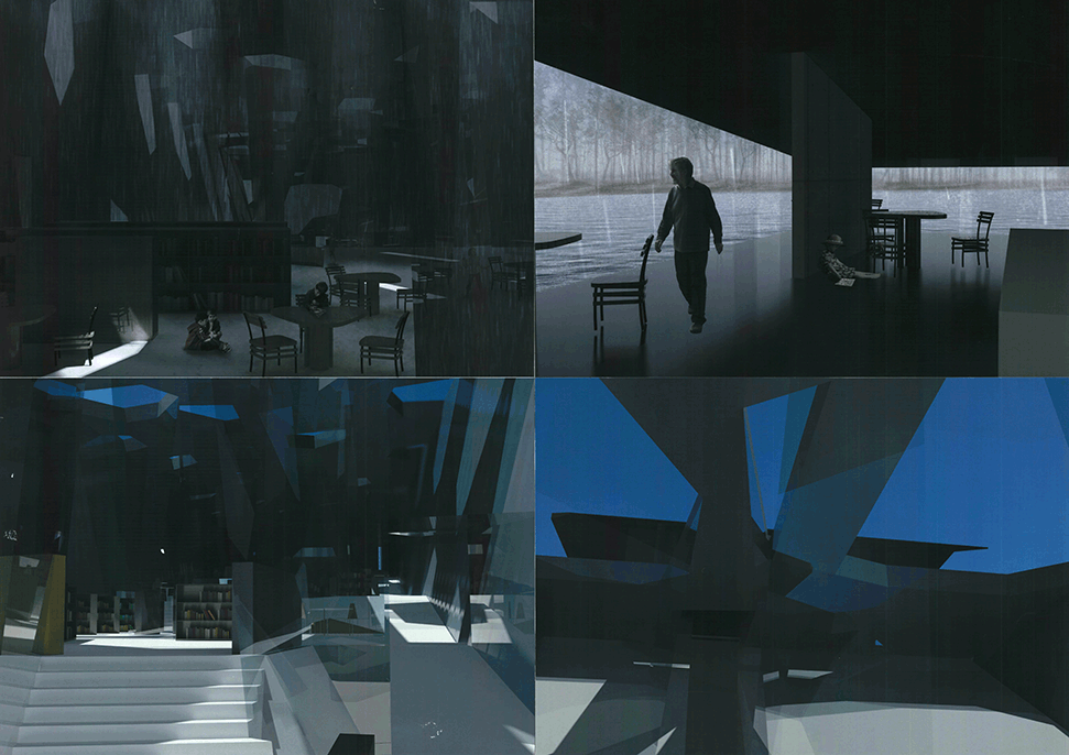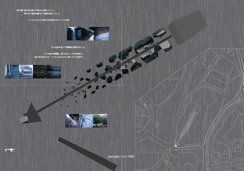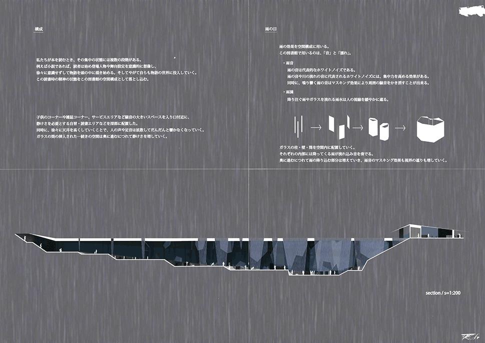 この作品は図書館という設定の心象風景で、降り頻る雨音のグラディエーションと読書行為に潜む心理的グラディエーションを段階的に視覚が遮られていく図書空間のグラディエーションに重ねることで独自の世界を造出しており、それらを深く淀んだ水中に閉じ込めることよって、もう後には引き返せない恐怖心を増幅させる構造になっている。特に表紙に見られる陰鬱な風景は圧巻であり、続く断面や平面の表現は哀しくも極めて美しい。この作品が我々に示したシナリオは非現実的でほとんど個人的なものかもしれないが、それは建築のもつ詩的なものの表象の一つとして人に感動を与えうるものであることを示している。最後に付け加えるとすれば、池澤夏樹が「スティルライフ」の中で語ったように「山脈や、人や、染色工場や、セミ時雨などからなる外の世界と、きみの中にある広い世界との間に連絡をつけること、一歩の距離をおいて並び立つ二つの世界の呼応と調和をはかること」が求めれていると言える。