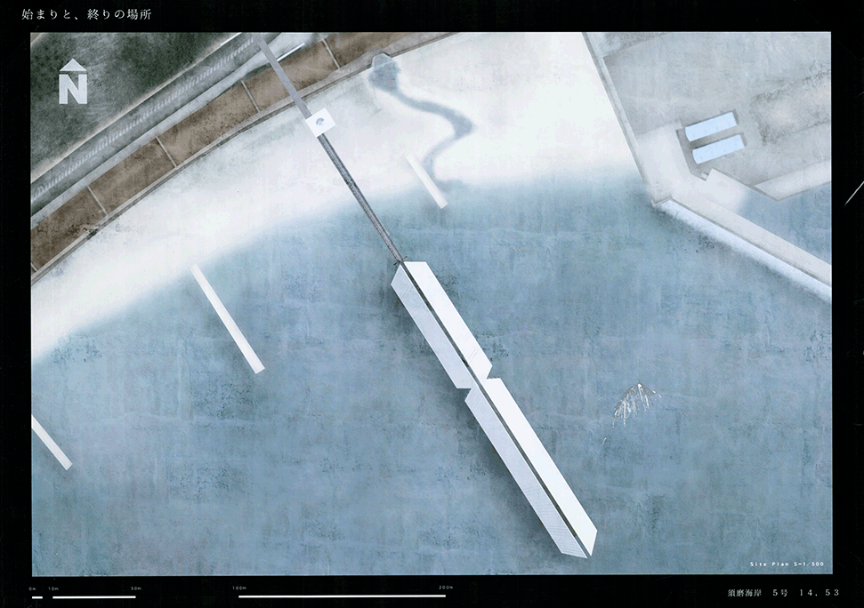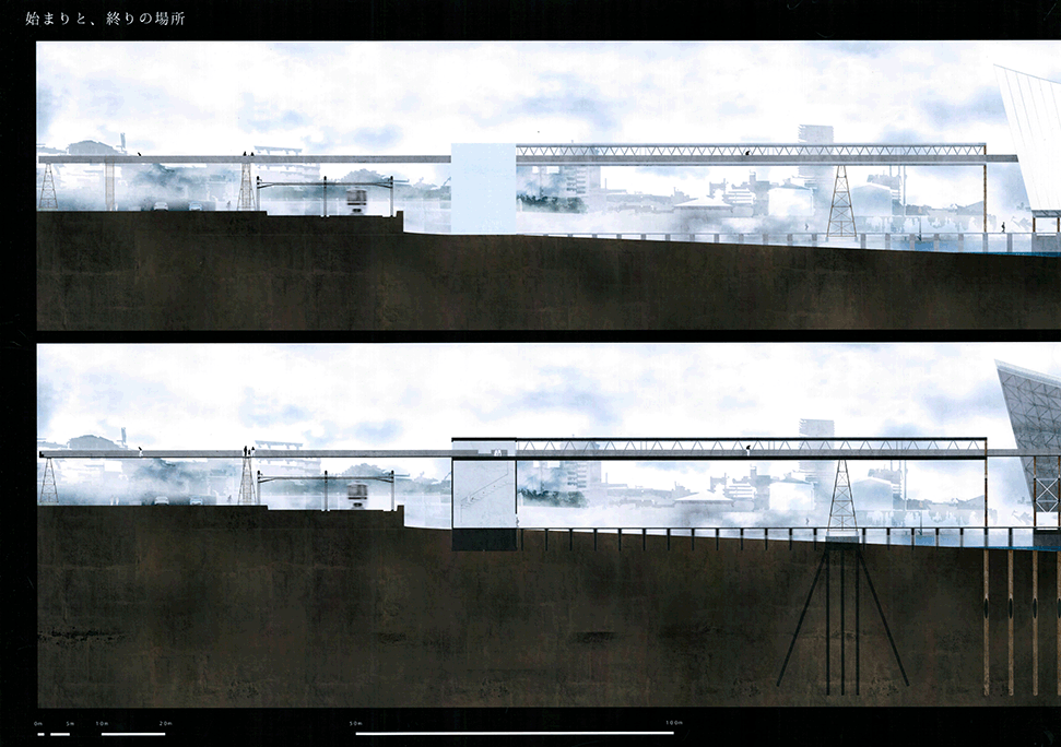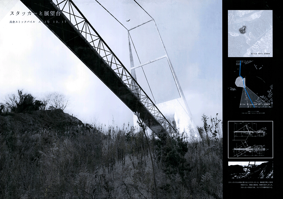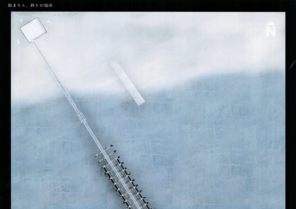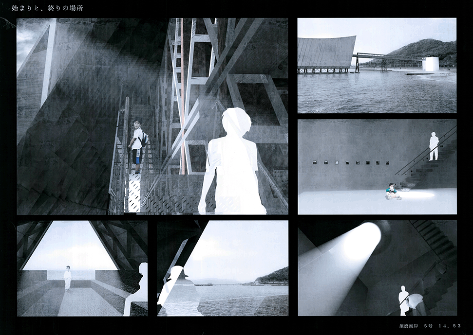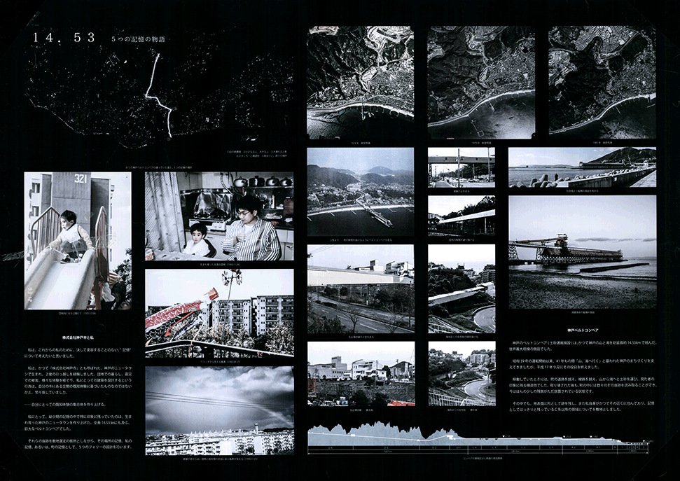 この作品は日本の高度経済成長を支えてきた産業遺構を作者の既知体験をもとに形象化したもので5つのエピソードによって語られている。1つ1つは点として独立した断片的な風景であり、作者はおそらくその断片に潜む異物感が何を意味するのかを知らずに幼年期を過ごしたであろう。この作品ではその断片を機能を持たないフォリーとして形態化することで、建築空間の中に昇華している。冒頭に見られる膨大なスナップショットとそれに続く5つのエピソードで語られるモノクロームの世界は作者自身の個人的な詩的表象として、或は人々の記憶の集積として、かつてタルコフスキーが「ストーカ」で描いたゾーンをみているように儚くも美しい。しかしやがて一連の異なる断片を線で繋いだ時、それがある1つの意図をもつ企みであったことに気づかされる。すなわちこれまで馴染んできた断片は14.53kmの巨大なベルトコンベアの軌跡として姿を現すことになる。これはかつて株式会社神戸市と呼ばれ、山を削り、海を埋め立てて広大な敷地を造成するために用いられた産業装置であり、作者自身が生まれ育ったニュータウンを築いたマザーマシンであり、同時に緑豊かな自然を破壊した象徴ででもあった。しかし今はその全容を見ることはできない。その功罪は善悪の彼岸にある。そしてこの作品は我々がすでに忘れてしまった過去の輝かしい栄華と取り返しのつかない過ちを見つめ直す黙示録でもある。