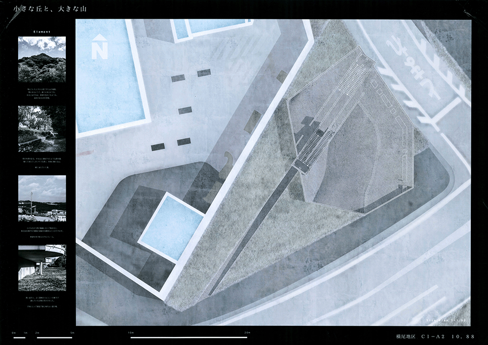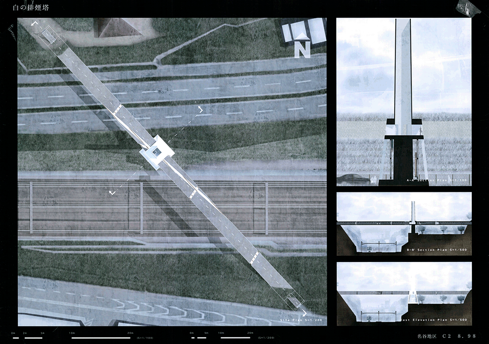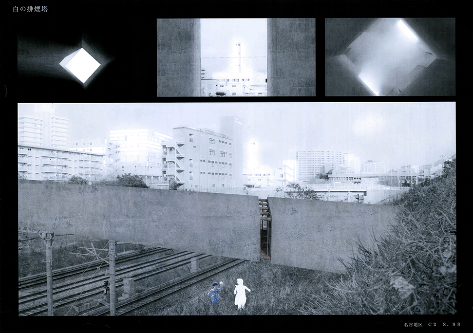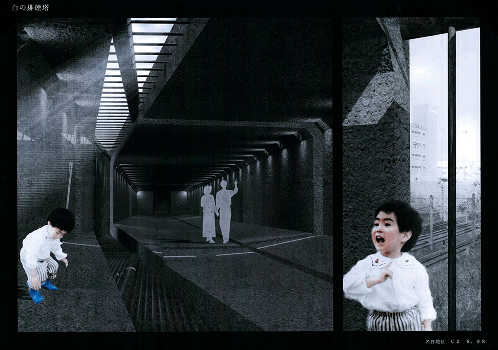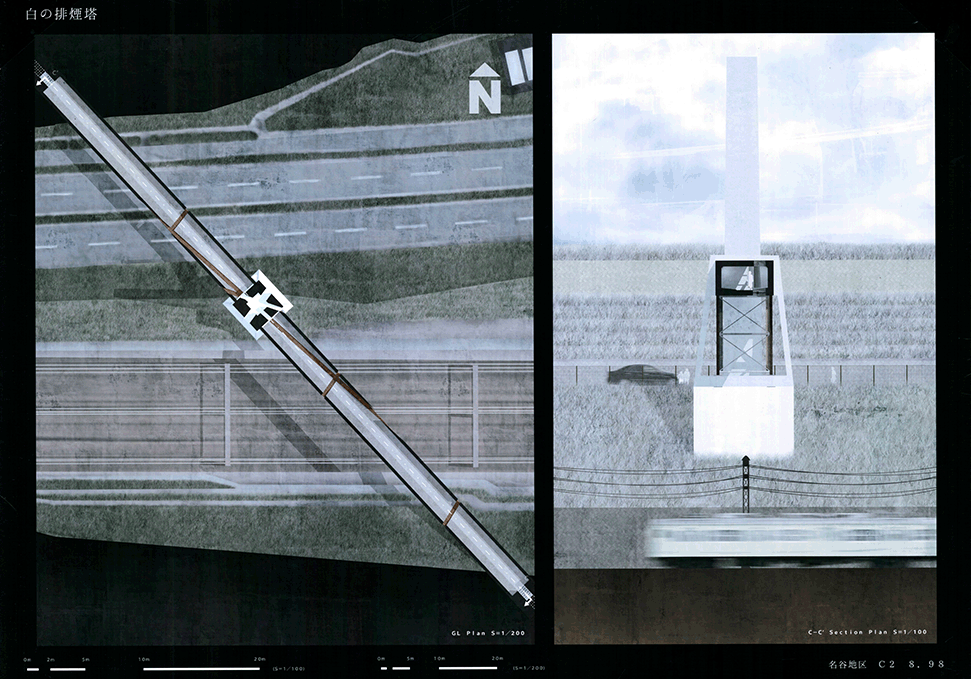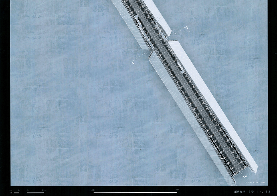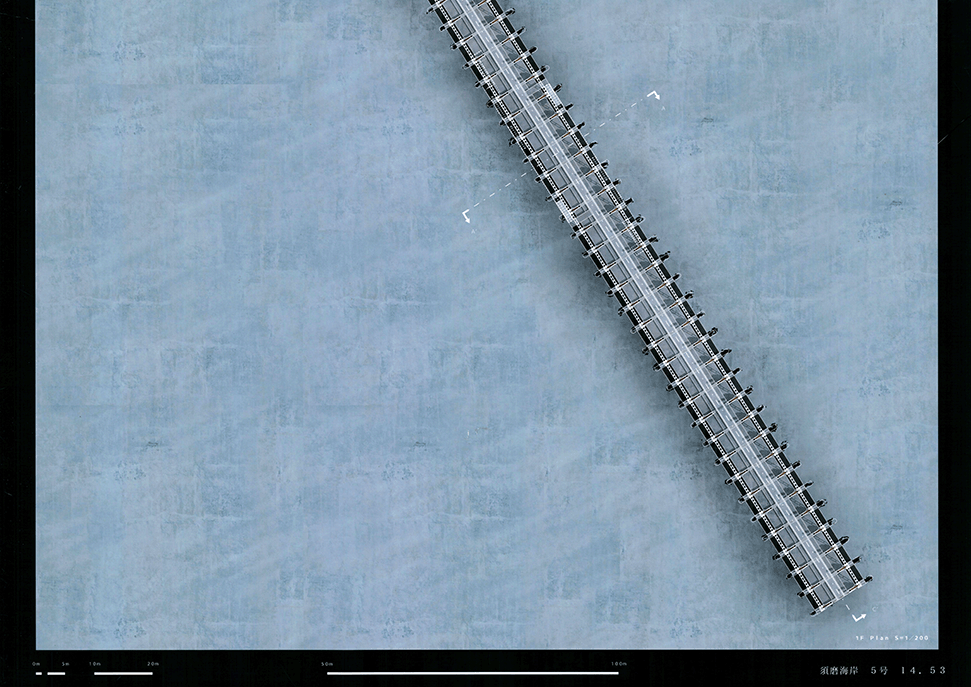 この作品は日本の高度経済成長を支えてきた産業遺構を作者の既知体験をもとに形象化したもので5つのエピソードによって語られている。1つ1つは点として独立した断片的な風景であり、作者はおそらくその断片に潜む異物感が何を意味するのかを知らずに幼年期を過ごしたであろう。この作品ではその断片を機能を持たないフォリーとして形態化することで、建築空間の中に昇華している。冒頭に見られる膨大なスナップショットとそれに続く5つのエピソードで語られるモノクロームの世界は作者自身の個人的な詩的表象として、或は人々の記憶の集積として、かつてタルコフスキーが「ストーカ」で描いたゾーンをみているように儚くも美しい。しかしやがて一連の異なる断片を線で繋いだ時、それがある1つの意図をもつ企みであったことに気づかされる。すなわちこれまで馴染んできた断片は14.53kmの巨大なベルトコンベアの軌跡として姿を現すことになる。これはかつて株式会社神戸市と呼ばれ、山を削り、海を埋め立てて広大な敷地を造成するために用いられた産業装置であり、作者自身が生まれ育ったニュータウンを築いたマザーマシンであり、同時に緑豊かな自然を破壊した象徴ででもあった。しかし今はその全容を見ることはできない。その功罪は善悪の彼岸にある。そしてこの作品は我々がすでに忘れてしまった過去の輝かしい栄華と取り返しのつかない過ちを見つめ直す黙示録でもある。