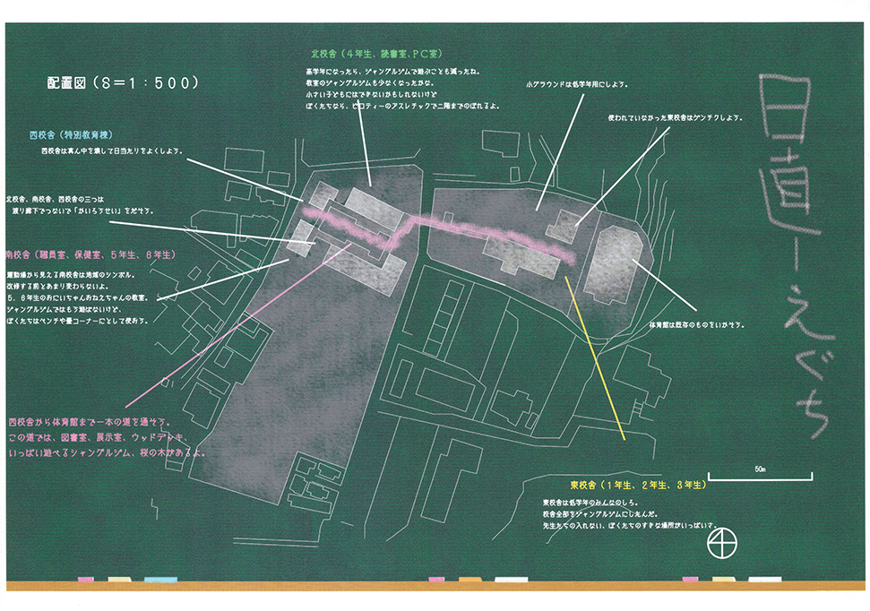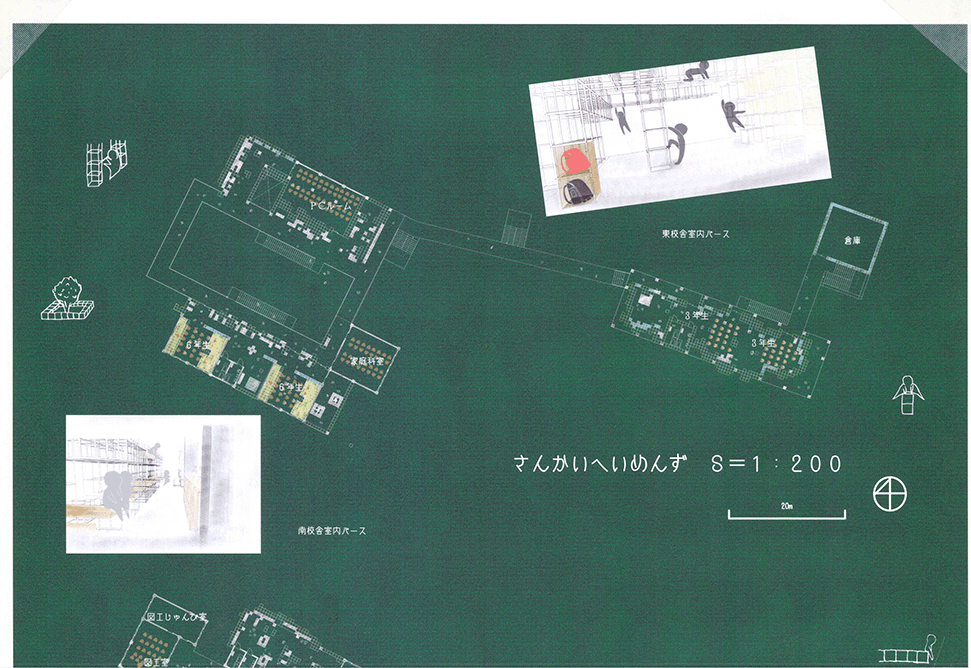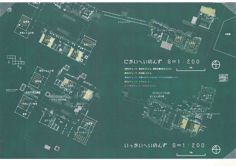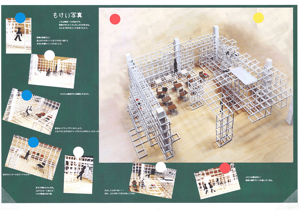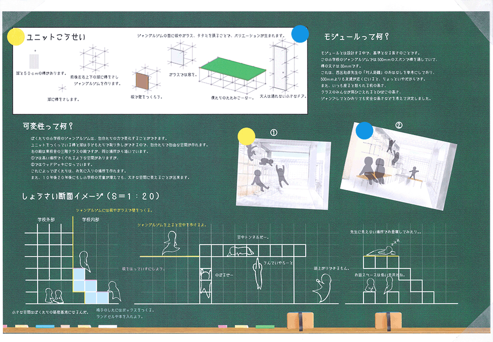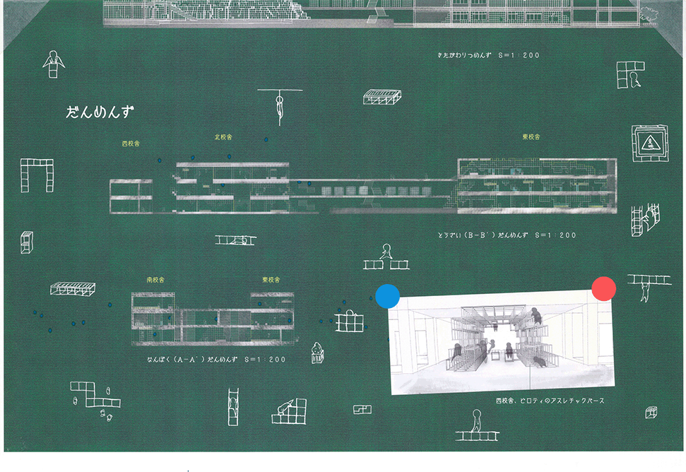 空き教室が増えた既存小学校の校舎に、500mmグリッドの可変性のある巨大なジャングルジムを挿入するという提案である。実際の小学校のリノベーションでは、空き空間に住民施設や福祉施設などの用途を持ち込み利用する場合が多いのに対し、この提案では、あくまでも子供達の空間として活用することにこだわる点に特徴がある。ゆとりのできた校舎内に大小様々なジャングルジムが置かれることによって、学びと遊びとを一体的に体験できる空間が作り出されている。可変式ユニットの安全性、既存校舎や外部空間との関係性、ファサードデザインなど様々な課題もあるが、たまにはこんなリノベーションがあってもいいと思わせる提案になった。黒板を模した図面表現も、提案にマッチした楽しげな表現になっている。こうした点が評価されて、本作品は卒業設計賞優秀賞を受賞した。