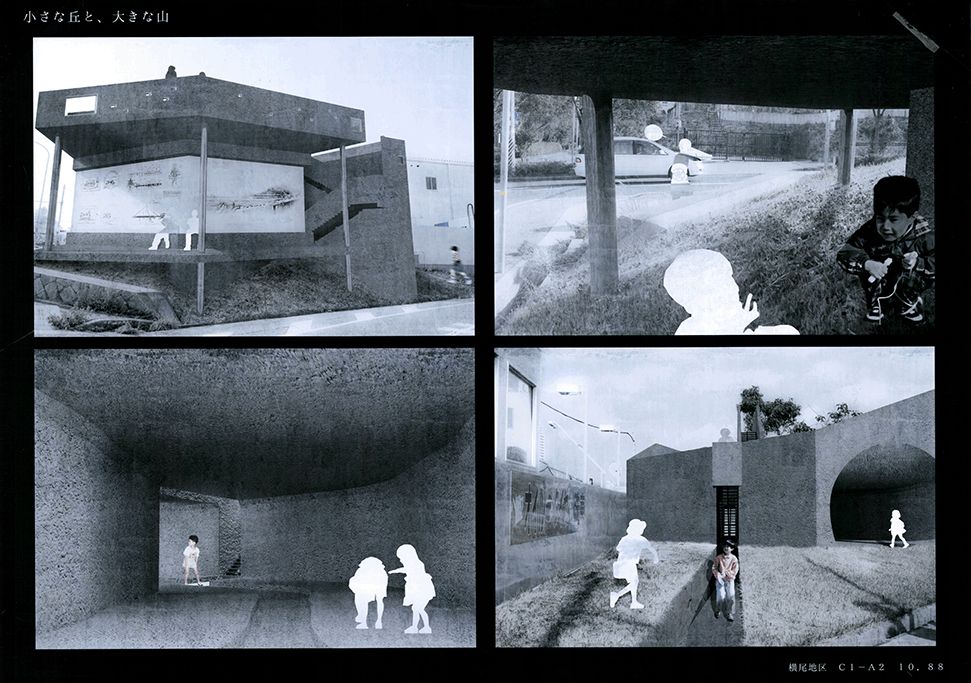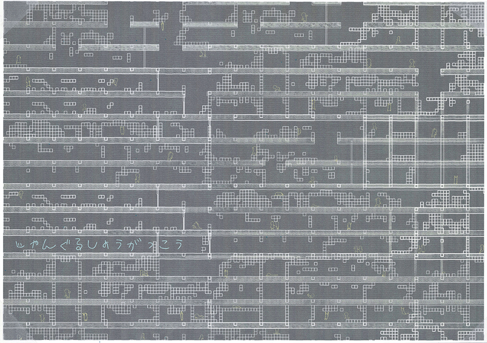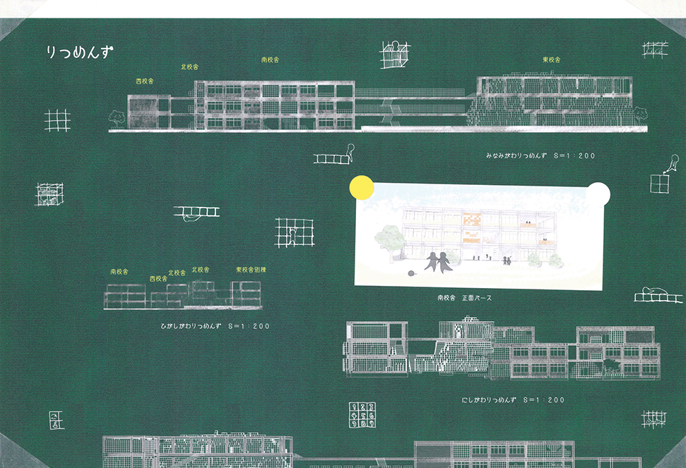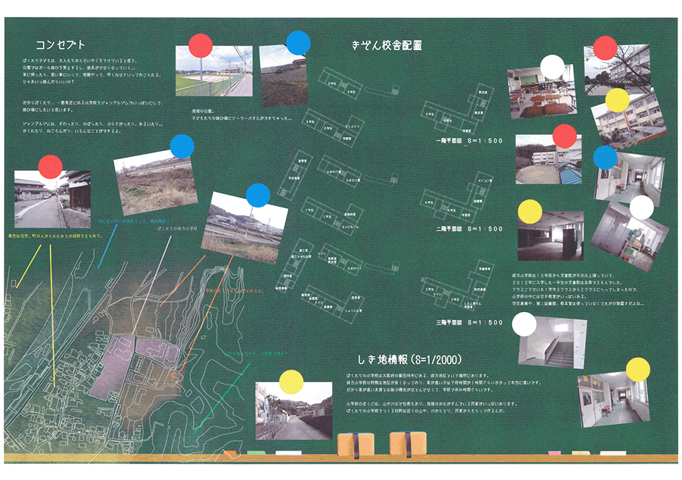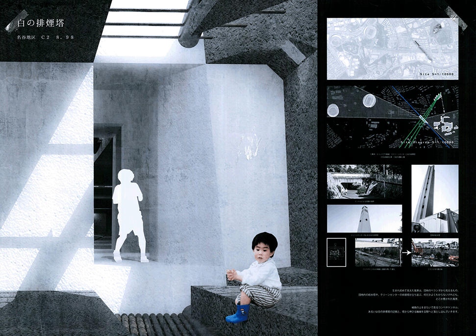 空き教室が増えた既存小学校の校舎に、500mmグリッドの可変性のある巨大なジャングルジムを挿入するという提案である。実際の小学校のリノベーションでは、空き空間に住民施設や福祉施設などの用途を持ち込み利用する場合が多いのに対し、この提案では、あくまでも子供達の空間として活用することにこだわる点に特徴がある。ゆとりのできた校舎内に大小様々なジャングルジムが置かれることによって、学びと遊びとを一体的に体験できる空間が作り出されている。可変式ユニットの安全性、既存校舎や外部空間との関係性、ファサードデザインなど様々な課題もあるが、たまにはこんなリノベーションがあってもいいと思わせる提案になった。黒板を模した図面表現も、提案にマッチした楽しげな表現になっている。こうした点が評価されて、本作品は卒業設計賞優秀賞を受賞した。