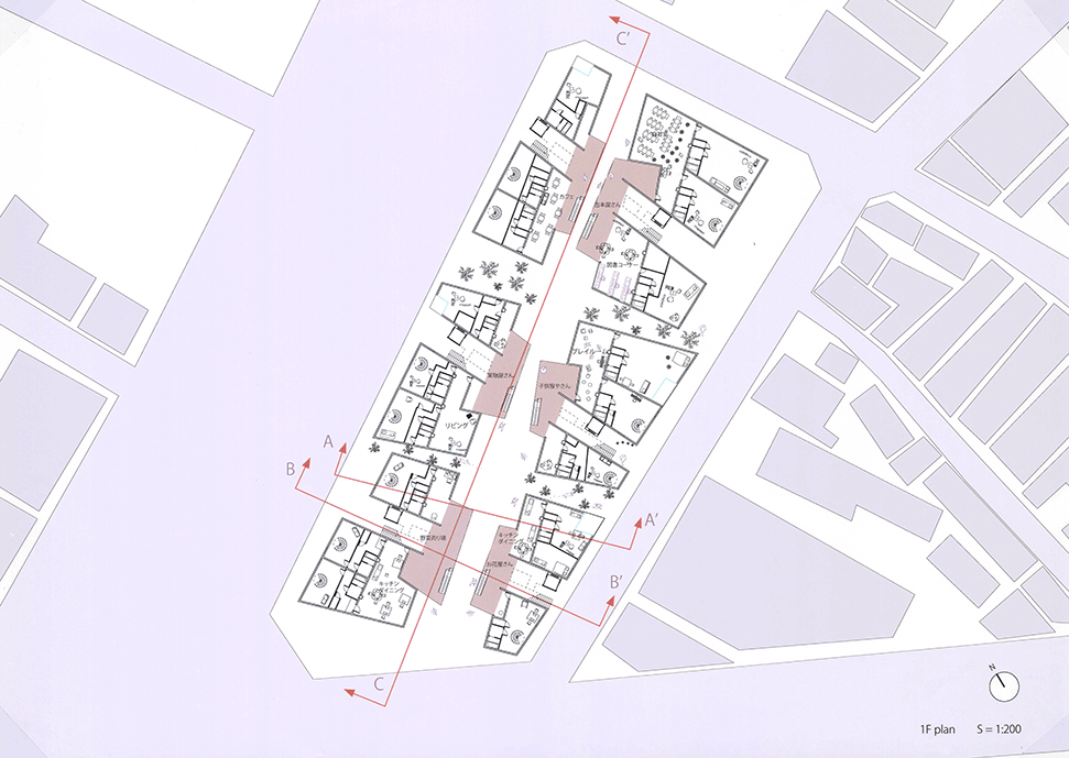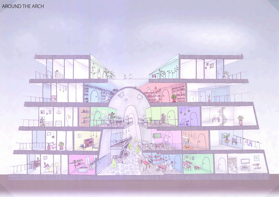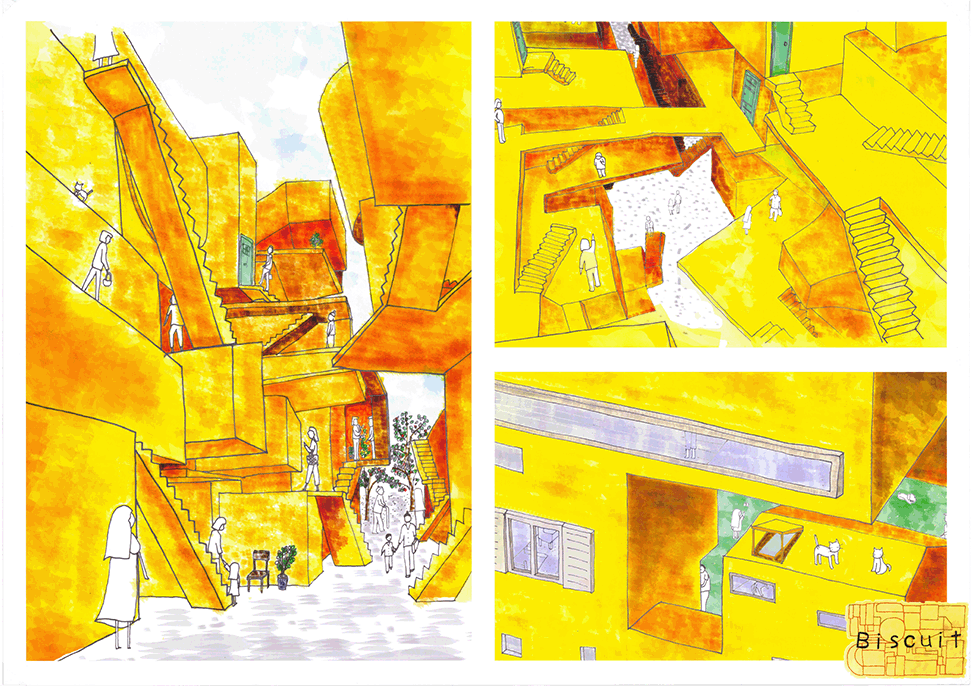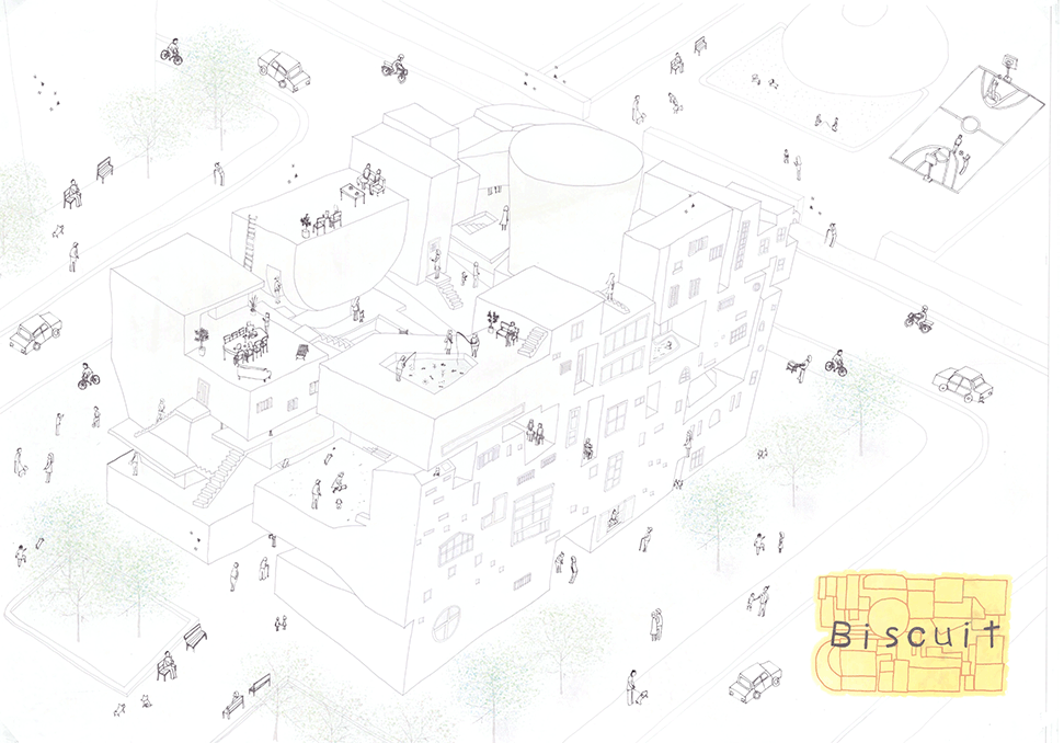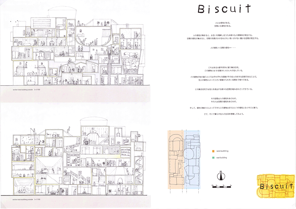 この作品は独特の形態を持つ居住空間が集積した集合住宅の提案である。ここでは画一化された規格が支配する一般の集合住宅とは異なり、モザイク状に散りばめられた集積にはそこで暮らす住民たちの生活が生き々々と描かれていて好感が持てる。全体構成も緻密に計画配置され建築造形として極めて秀逸である。また繊細な色使いと丁寧な表現は高く評価したい。ただ作者は何故この住宅を提案したのか、この設計をするに至った動機が語られていない。現時点では個々の住宅におけるアクティビティを個別に示すだけにとどまっており、このような集合体においてしかも個性的な住民たちが織り成す数えきれないハプニングやドラマは語られていない。たとえば猫好きの家の猫が水槽のある家の魚を食べてしまうことや、星を眺める部屋に信仰心の熱い住民が訪ねてくることがあるかもしれない。人と人の触れ合いの中にこの作品の本当の価値があるように思う。論理的でフィジカルな説明よりはむしろ少し非現実的ではあっても少しだけ人のこころを動かす無数の小さなストーリーが加わることでこの作品は飛躍的に良くなると思われる。
