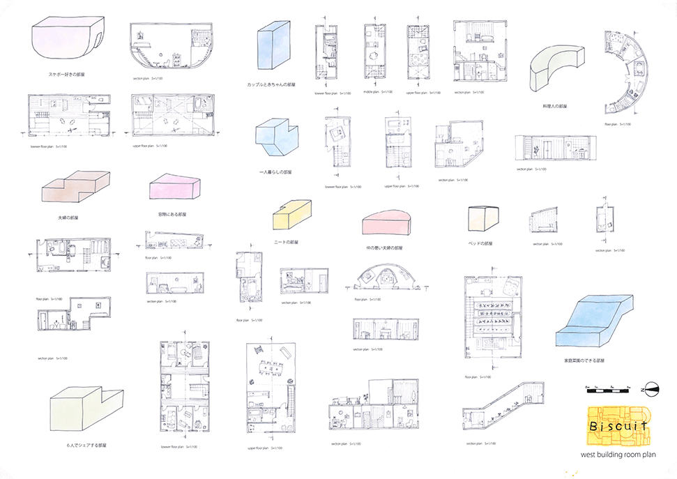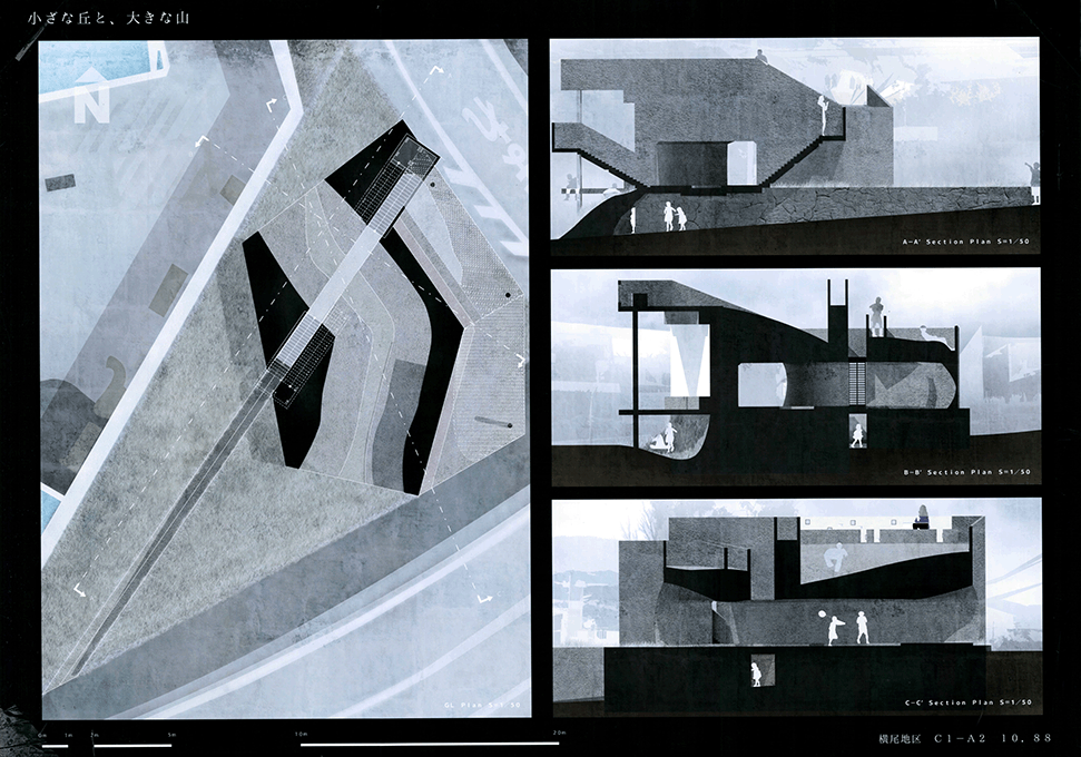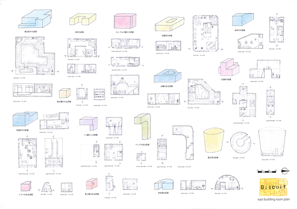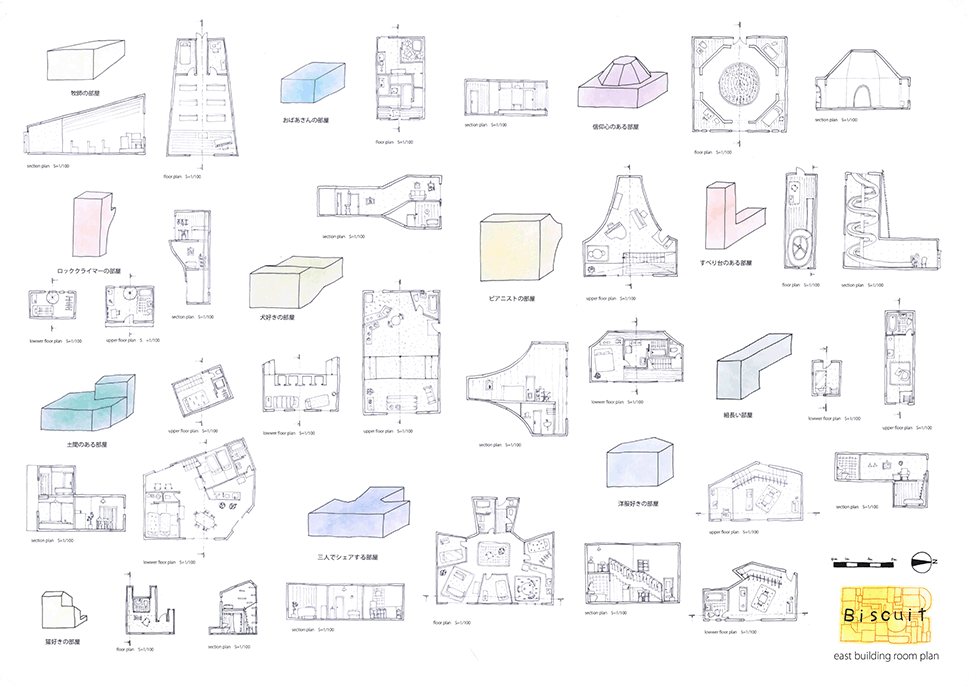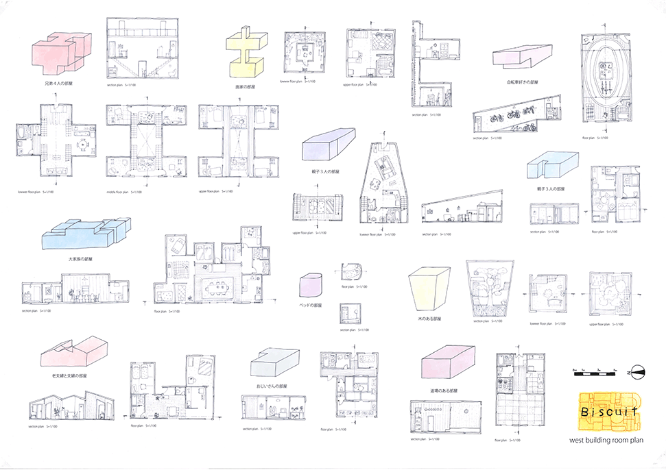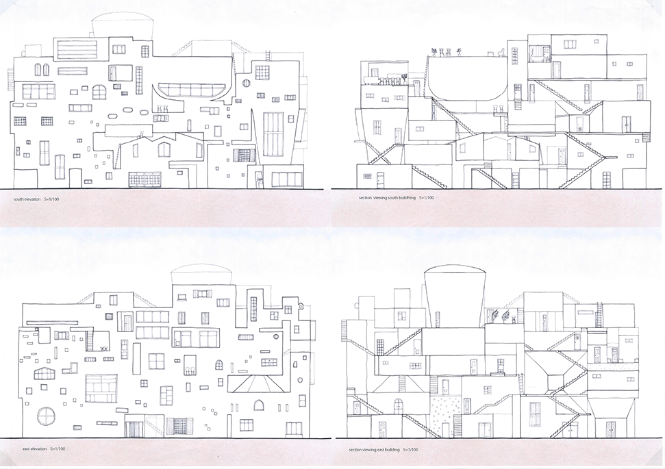 この作品は独特の形態を持つ居住空間が集積した集合住宅の提案である。ここでは画一化された規格が支配する一般の集合住宅とは異なり、モザイク状に散りばめられた集積にはそこで暮らす住民たちの生活が生き々々と描かれていて好感が持てる。全体構成も緻密に計画配置され建築造形として極めて秀逸である。また繊細な色使いと丁寧な表現は高く評価したい。ただ作者は何故この住宅を提案したのか、この設計をするに至った動機が語られていない。現時点では個々の住宅におけるアクティビティを個別に示すだけにとどまっており、このような集合体においてしかも個性的な住民たちが織り成す数えきれないハプニングやドラマは語られていない。たとえば猫好きの家の猫が水槽のある家の魚を食べてしまうことや、星を眺める部屋に信仰心の熱い住民が訪ねてくることがあるかもしれない。人と人の触れ合いの中にこの作品の本当の価値があるように思う。論理的でフィジカルな説明よりはむしろ少し非現実的ではあっても少しだけ人のこころを動かす無数の小さなストーリーが加わることでこの作品は飛躍的に良くなると思われる。