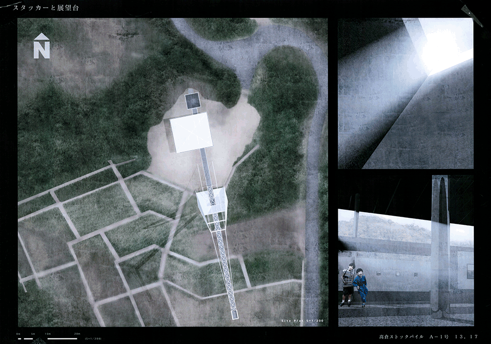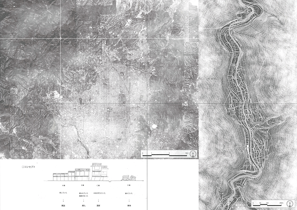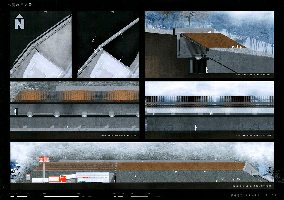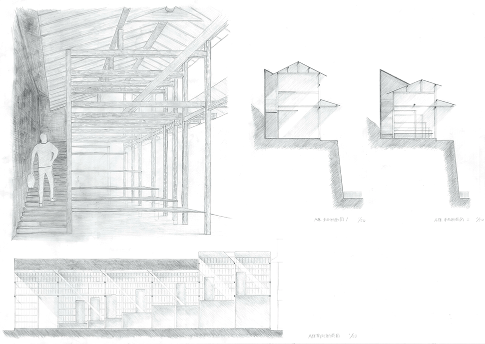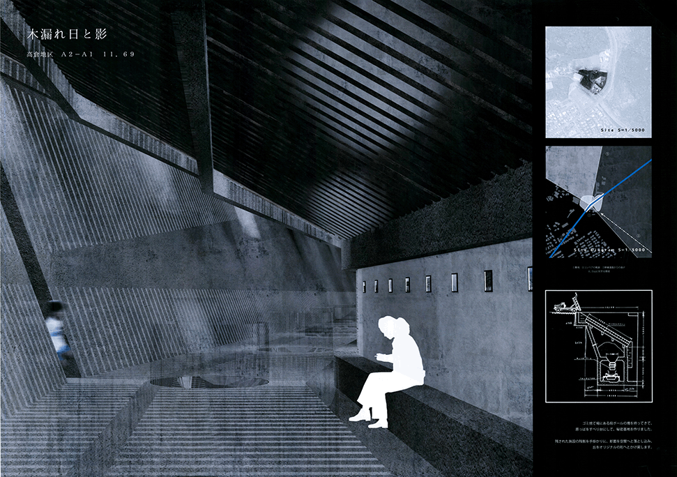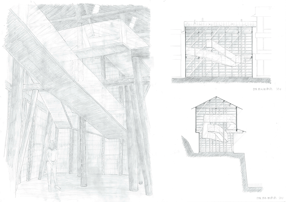 北山杉林業を生業とする中川集落の入り口に建つ木造倉庫群。生業の盛衰を映し、圧倒的な美しさの一方で、売れ残った丸太とともに既に時間が澱み始めている。そして何十年か先の未来に古びたこの倉庫群に出会った。その歴史をたどり、よどんだ時間を解放し、先の未来に集落の記憶を継承するために、倉庫の修復と再生を計画した。長く閉ざされた空間を開き、幾重にも使われた痕跡を光と空気の流れに読み替えて再構成し、蓄積された時間を変わらない山の風景を手がかりに再生する:この3つのコンセプトによる3つの空間から構成される。この計画には今ある倉庫群の存在感の強さに負けない構想力が求められるが、倉庫群を残したいという思いから抜け出させていない。計画の時点を未来に設定することにより、連続する時間の制約を離れ、構想の自由度を高めているはずであるが、現在のかたちに引きずられているところが惜しまれる。時間をつなぐ未来の空間イメージが求められる。手書き表現による取り組みを評価するが、もう少し密度を高めることでもっと意図が伝わるのではないだろうか。