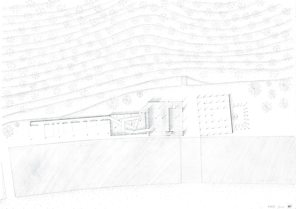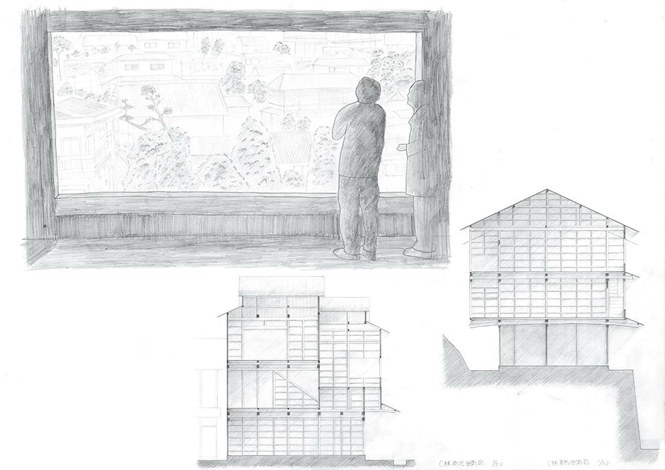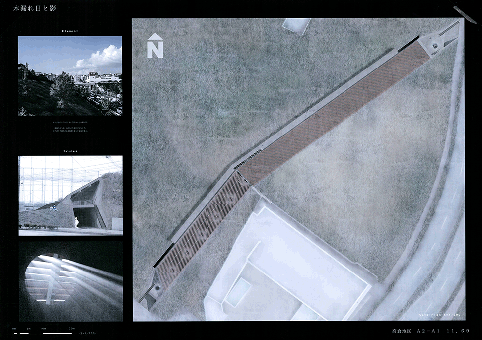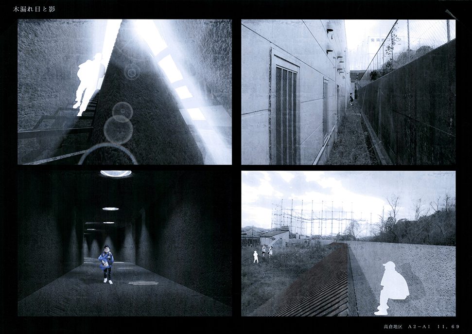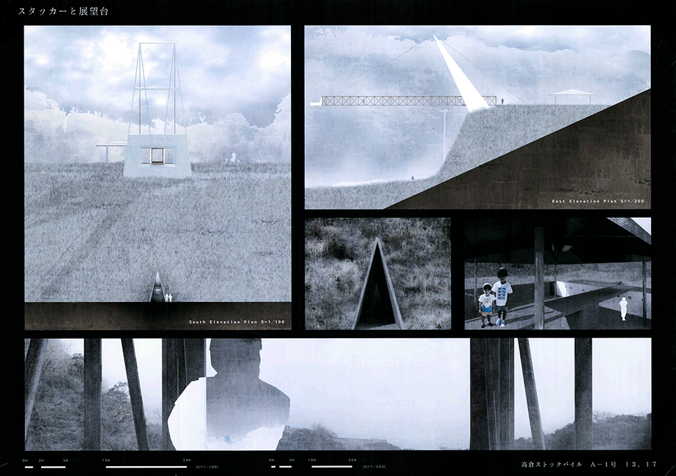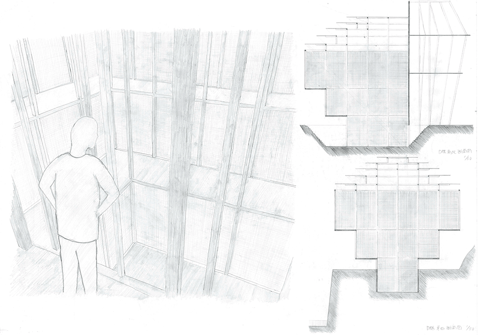 北山杉林業を生業とする中川集落の入り口に建つ木造倉庫群。生業の盛衰を映し、圧倒的な美しさの一方で、売れ残った丸太とともに既に時間が澱み始めている。そして何十年か先の未来に古びたこの倉庫群に出会った。その歴史をたどり、よどんだ時間を解放し、先の未来に集落の記憶を継承するために、倉庫の修復と再生を計画した。長く閉ざされた空間を開き、幾重にも使われた痕跡を光と空気の流れに読み替えて再構成し、蓄積された時間を変わらない山の風景を手がかりに再生する:この3つのコンセプトによる3つの空間から構成される。この計画には今ある倉庫群の存在感の強さに負けない構想力が求められるが、倉庫群を残したいという思いから抜け出させていない。計画の時点を未来に設定することにより、連続する時間の制約を離れ、構想の自由度を高めているはずであるが、現在のかたちに引きずられているところが惜しまれる。時間をつなぐ未来の空間イメージが求められる。手書き表現による取り組みを評価するが、もう少し密度を高めることでもっと意図が伝わるのではないだろうか。