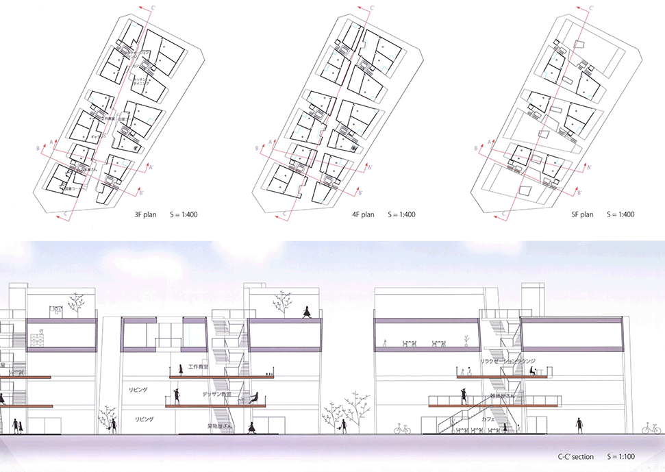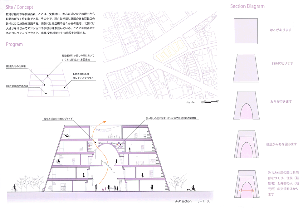 転勤族が多い都市である博多の中心部に、一般的なマンションではなかなか地域と関係がもちにくい転勤族の家族のためのコレクティブハウスと、彼らが働ける店や商業施設を組み合わせた新しいタイプの都市施設の提案である。街は定住者のものだけではない。短期滞在者や数年だけ居住する人々は都市を特徴付ける人々であり、短期であるが(逆に短期であるからこその多様で貴重な人的資源と考え)、彼らが地域と積極的に関われるような居住形態・都市施設のあり方を考えるというテーマ設定は非常に魅力的である。また、図書を共有する居住の様子や、住居空間と商業が組合わされたアーチの断面と、それをくぐり抜けていく空間構成は面白く、新しい都市体験の可能性を感じる。ただ、背景やプログラムについてサーベイ不足・説明不足であり、何よりも、この建物と博多の中心地区の既存の都市空間やアクティビティとの関係、街路に対してどのような表情を向けるべきかの検討があまりに少なすぎるのが残念である。
